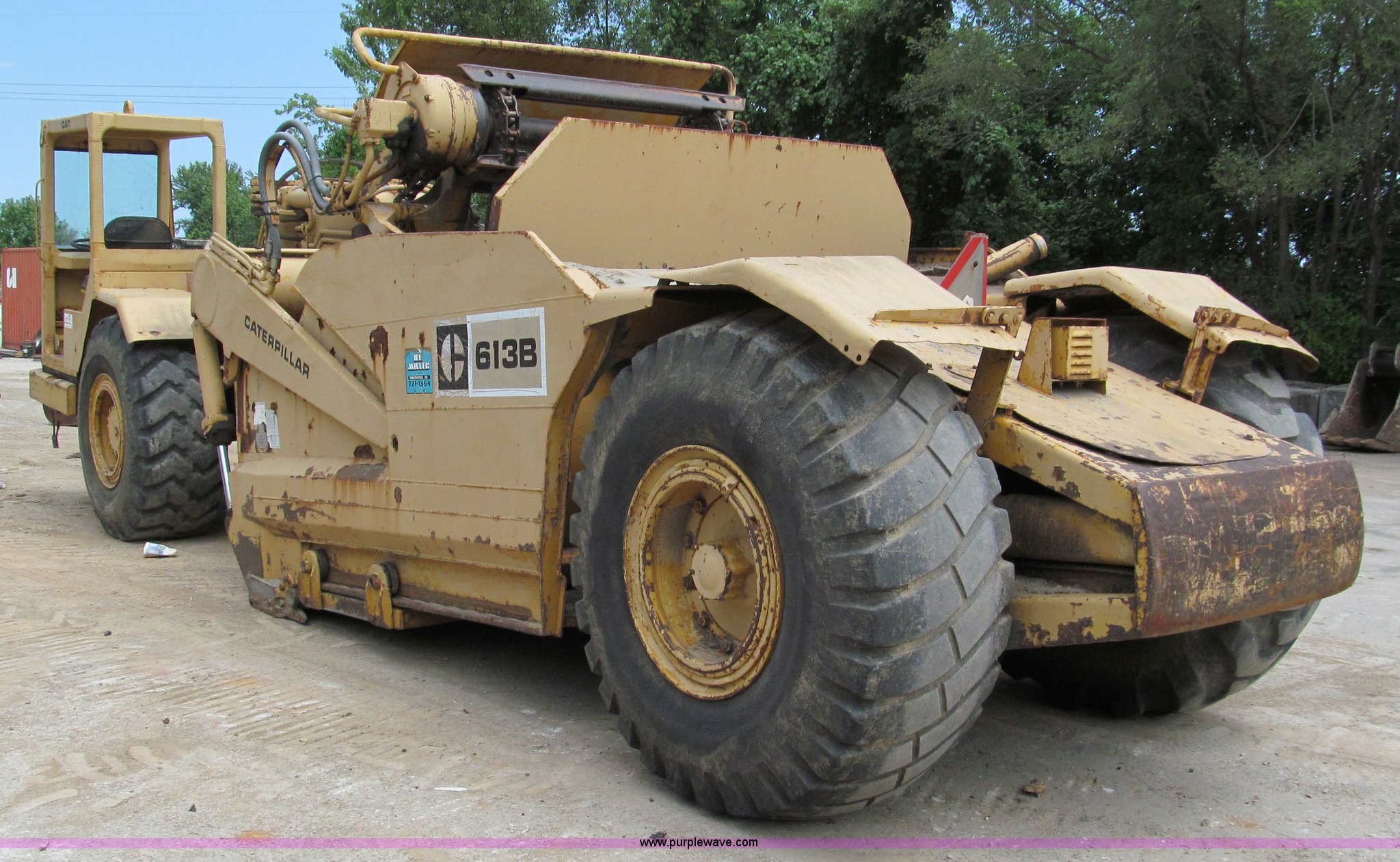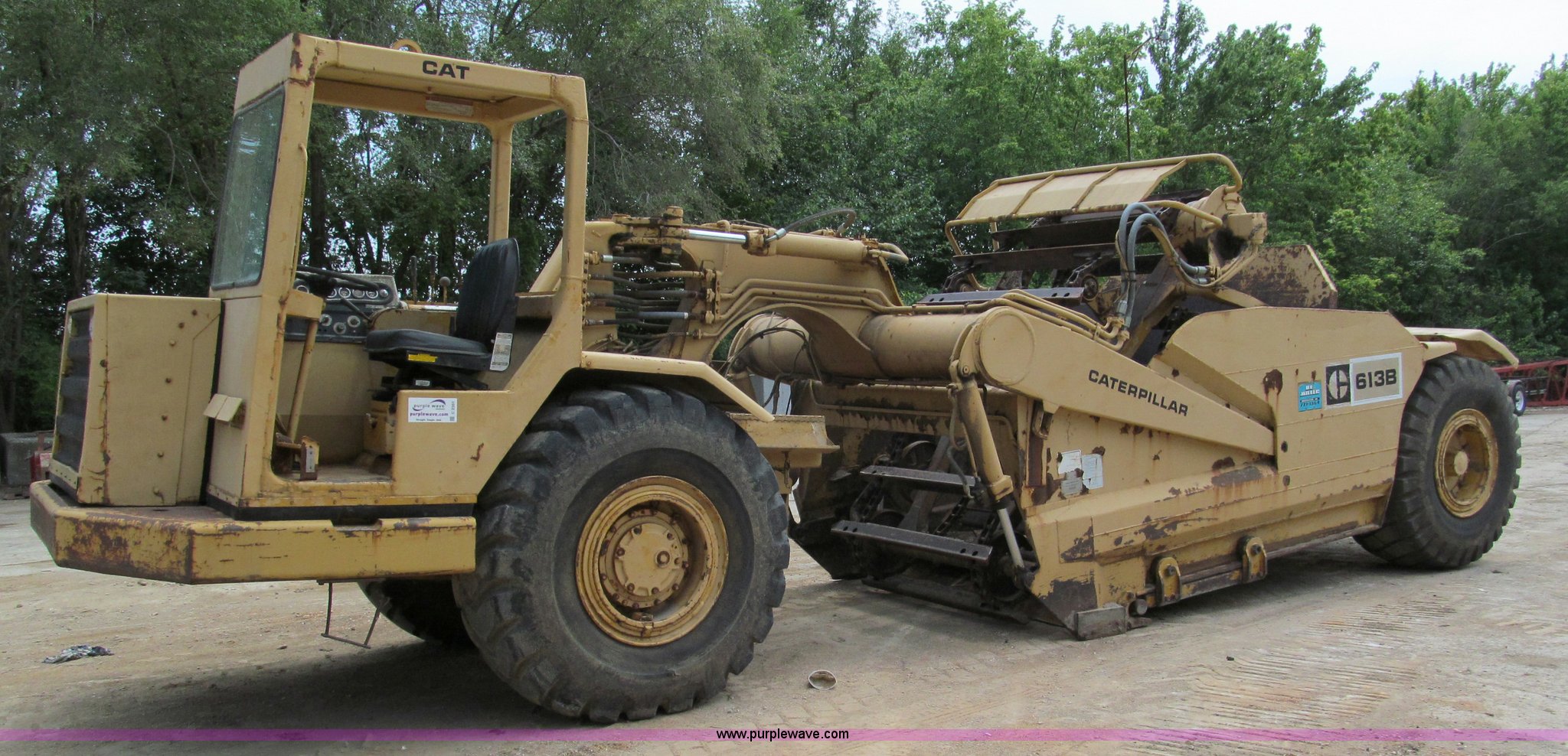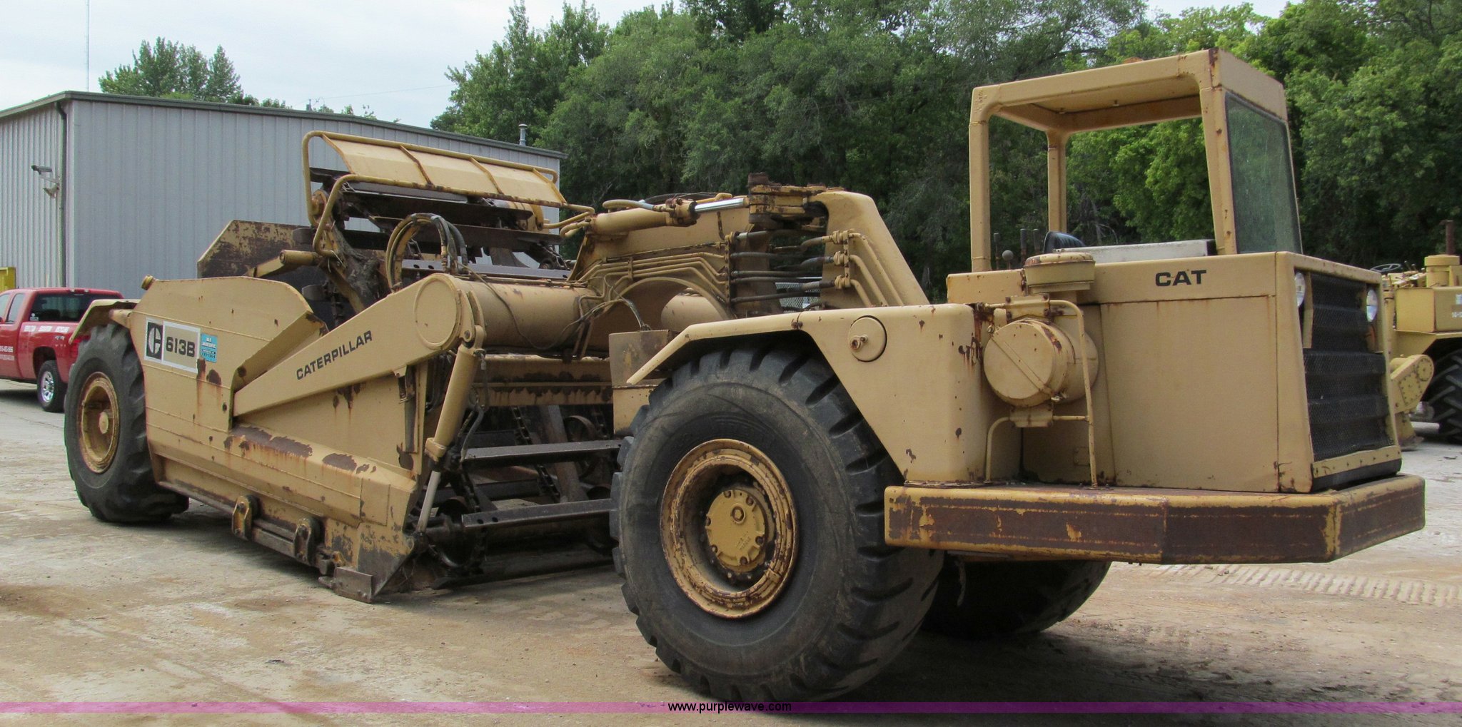 Purple Wave is selling a used Elevating Scraper in Missouri. This item is a 1976 Caterpillar 613B elevating scraper with the following: 2,498 hours on meter, Caterpillar 3208 diesel engine, Rebuilt engine has less than 1,100 hours, Four speed transmission, Transmission and torque converter have less than 600 hours, ROPS Canopy, 23.5x25 tires, Cracked windshield, Model RM379, Serial 38W4292