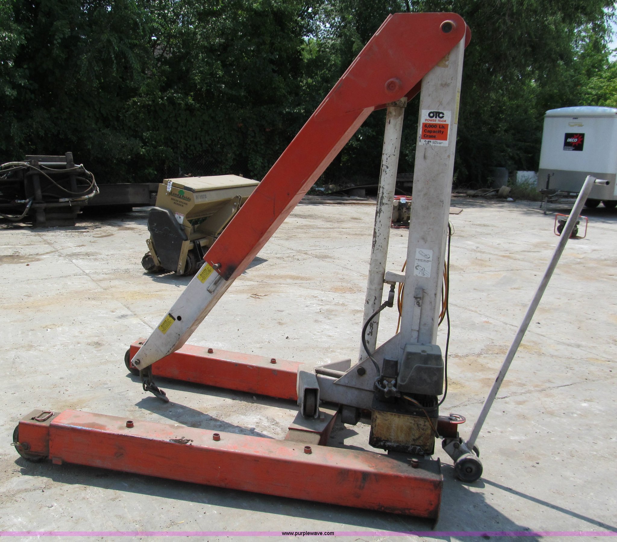 OTC 6,000 lb shop crane. 110V, Hydraulic pump, Extendable legs, Extendable boom, Pivots in center, Casters. Shipping quotes available. Deco Company Shop. 3801 N Arlington. Kansas City, MO 64161