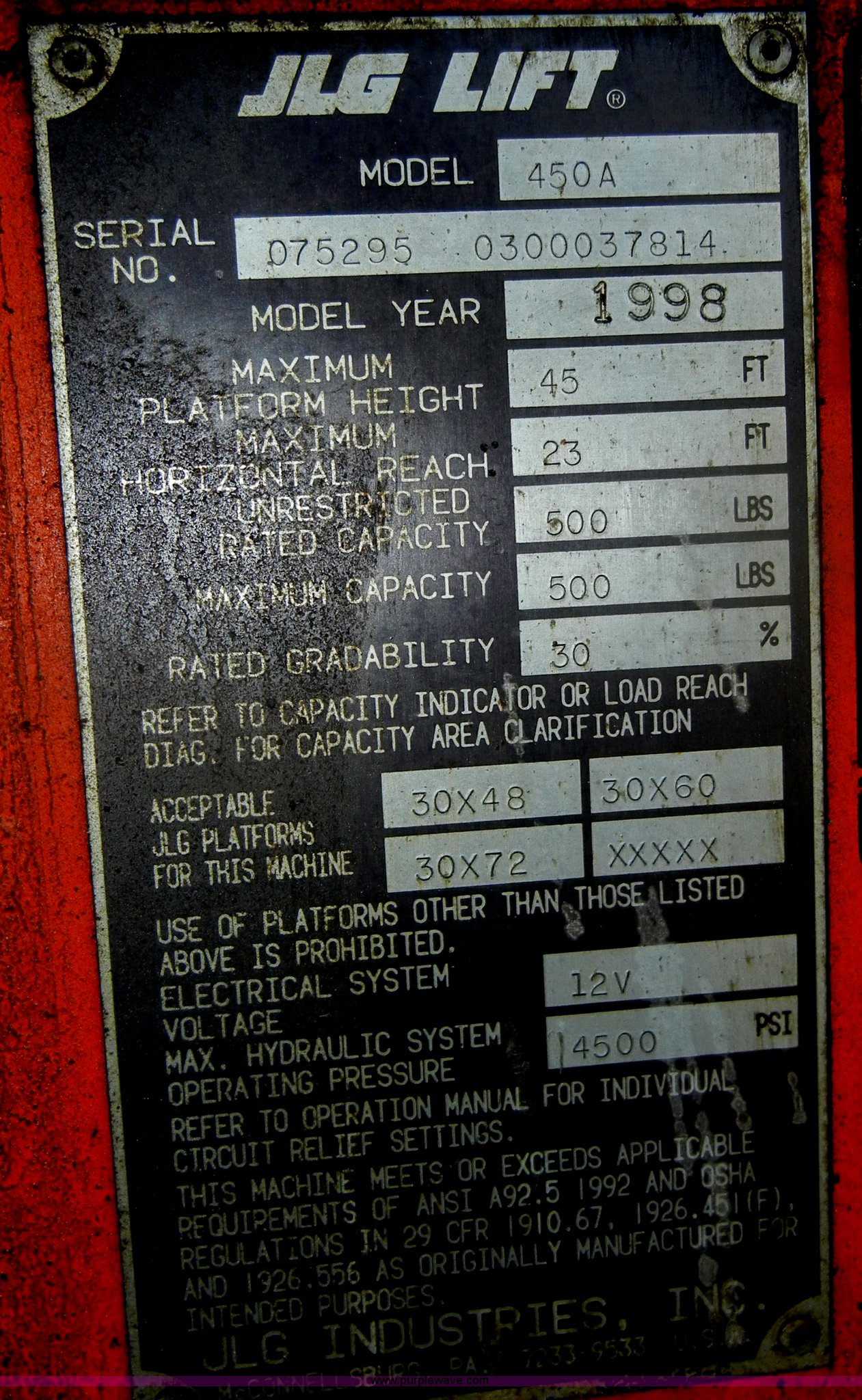1998 JLG 45' articulating boom lift. 2,159 hours on meter, Ford four cylinder propane or gas engine Model LRG425I-6007-Z, Serial 03-09-060636, Four wheel drive, Upper and lower controls, 45' maximum platform height, 23' up and over horizontal reach, 500 lb maximum capacity, 30 percent grade-ability, 30" x 72" platform, Power to platform, 12-16.5 tires, 10 ply, Serial 0752950300037814. Shipping quotes available. Deco Company Shop. 3801 N Arlington. Kansas City, MO 64161