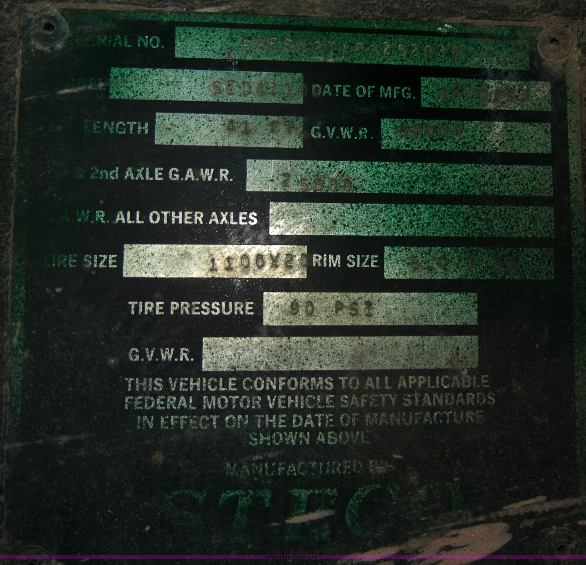 1993 Steco 41' ejector trailer. Model SE041102, Double wall bed, Spring suspension, Air brakes, Two speed landing gear, Single swinging rear door, Steel wheels, 11R22.5 tires, GVWR 80,000 lbs, Slide cylinder has been removed, Does not eject. 1S9ESN2T1P1252030. Shipping quotes available. Deco Company Shop. 3801 N Arlington. Kansas City, MO 64161