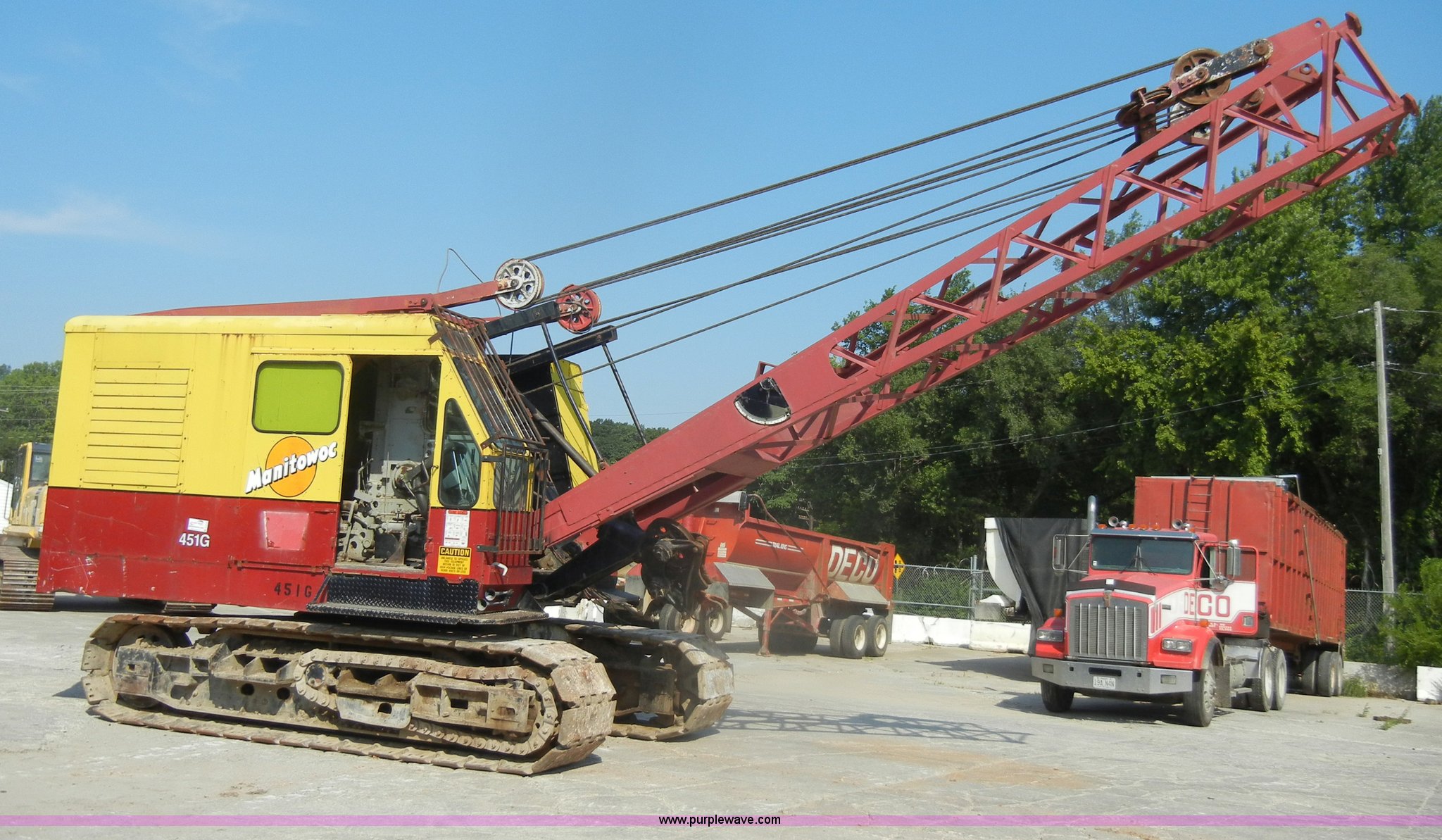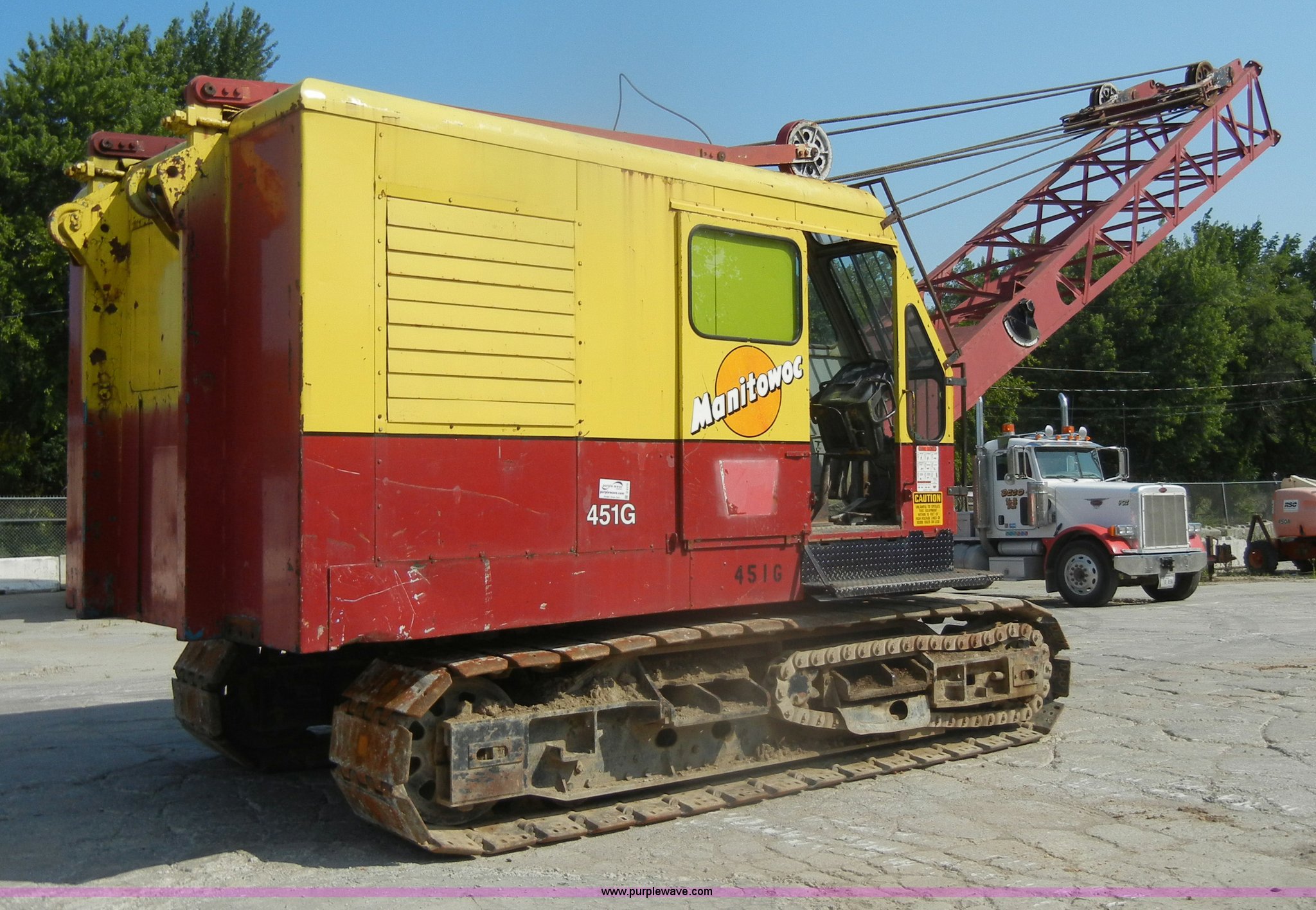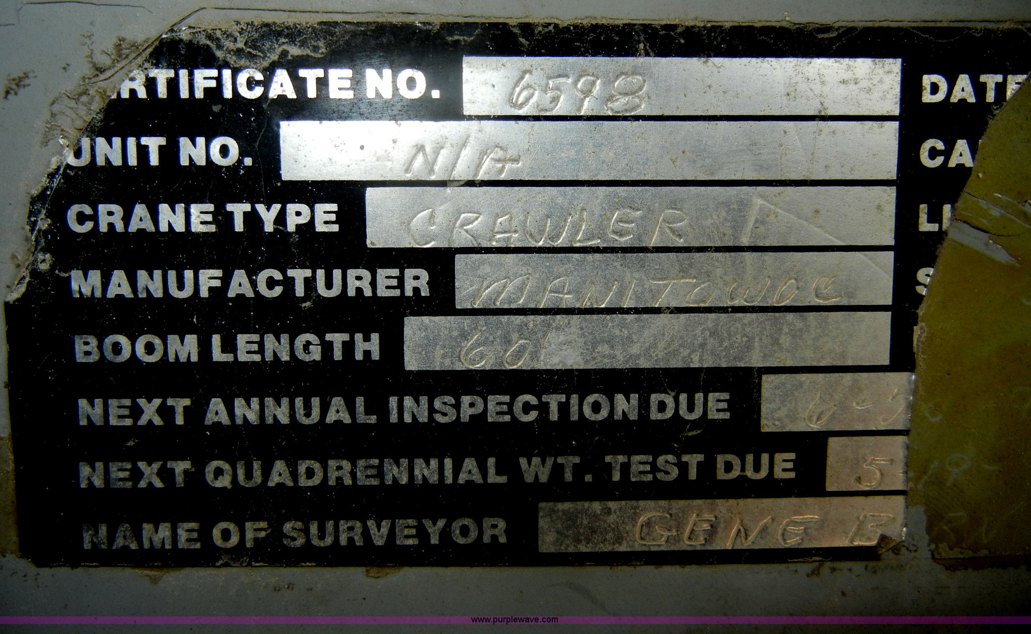 Purple Wave is selling a used Crawler Crane in Missouri. This item is a Manitowoc 3000 track crane with the following: 2,795 hours on meter, Cummins six cylinder turbo diesel engine, Wet twin disk torque converter, New, Enclosed cab, Heat, All air controls, Air horn, Two drum cable system, Self-loading counter weight system, 37,700 lb counter weight, Manual retractable track, 34"W tracks, Boom sections and Jib sold separately, $25,000 invested to certify on January 20, 2012, Serial 30198, Cust# 451-G