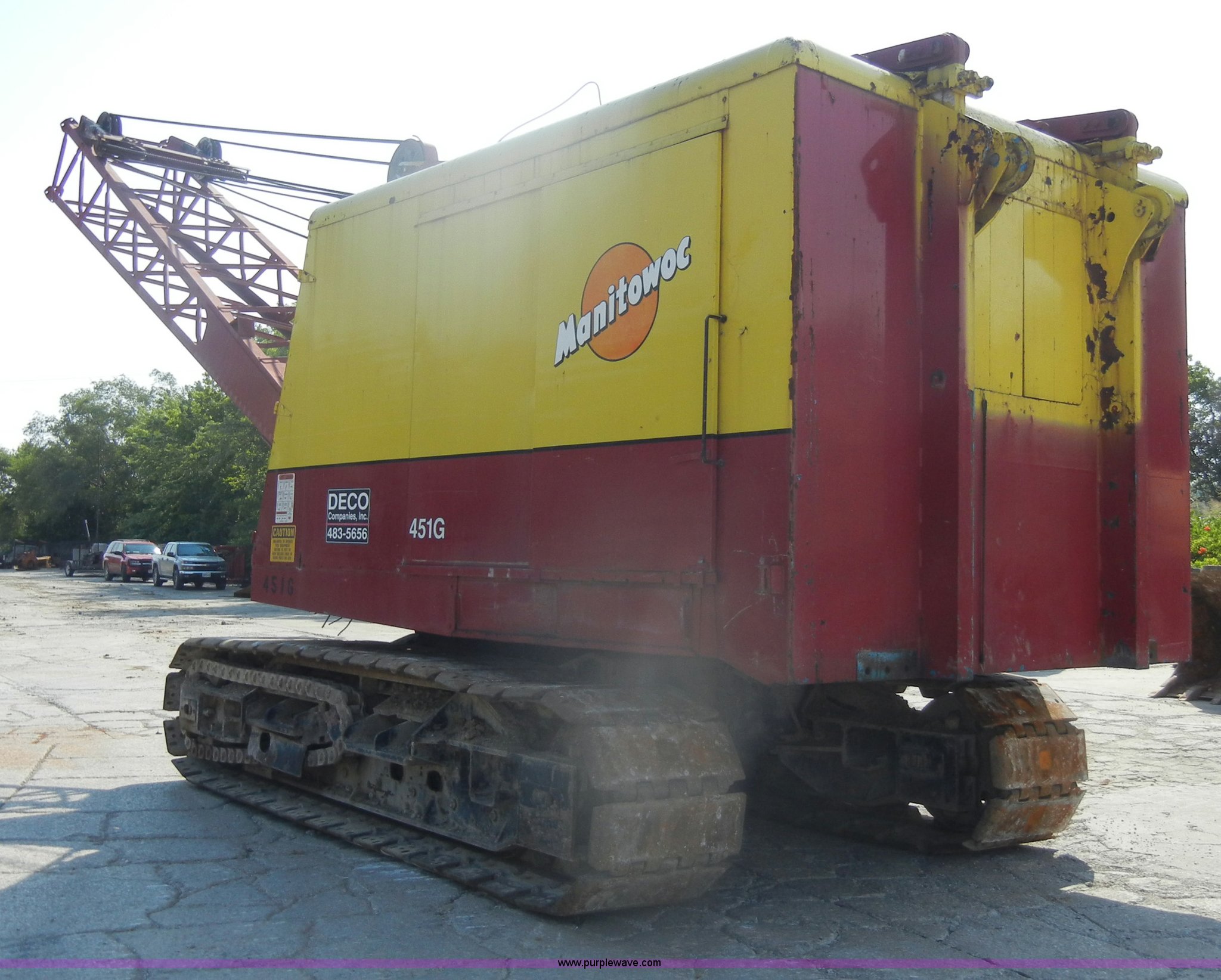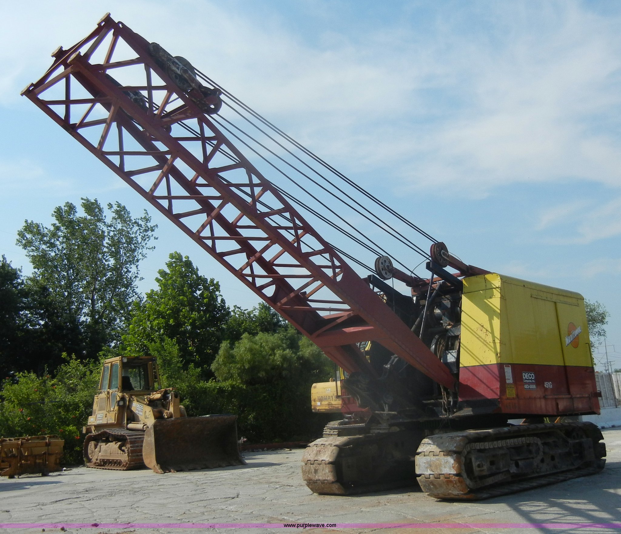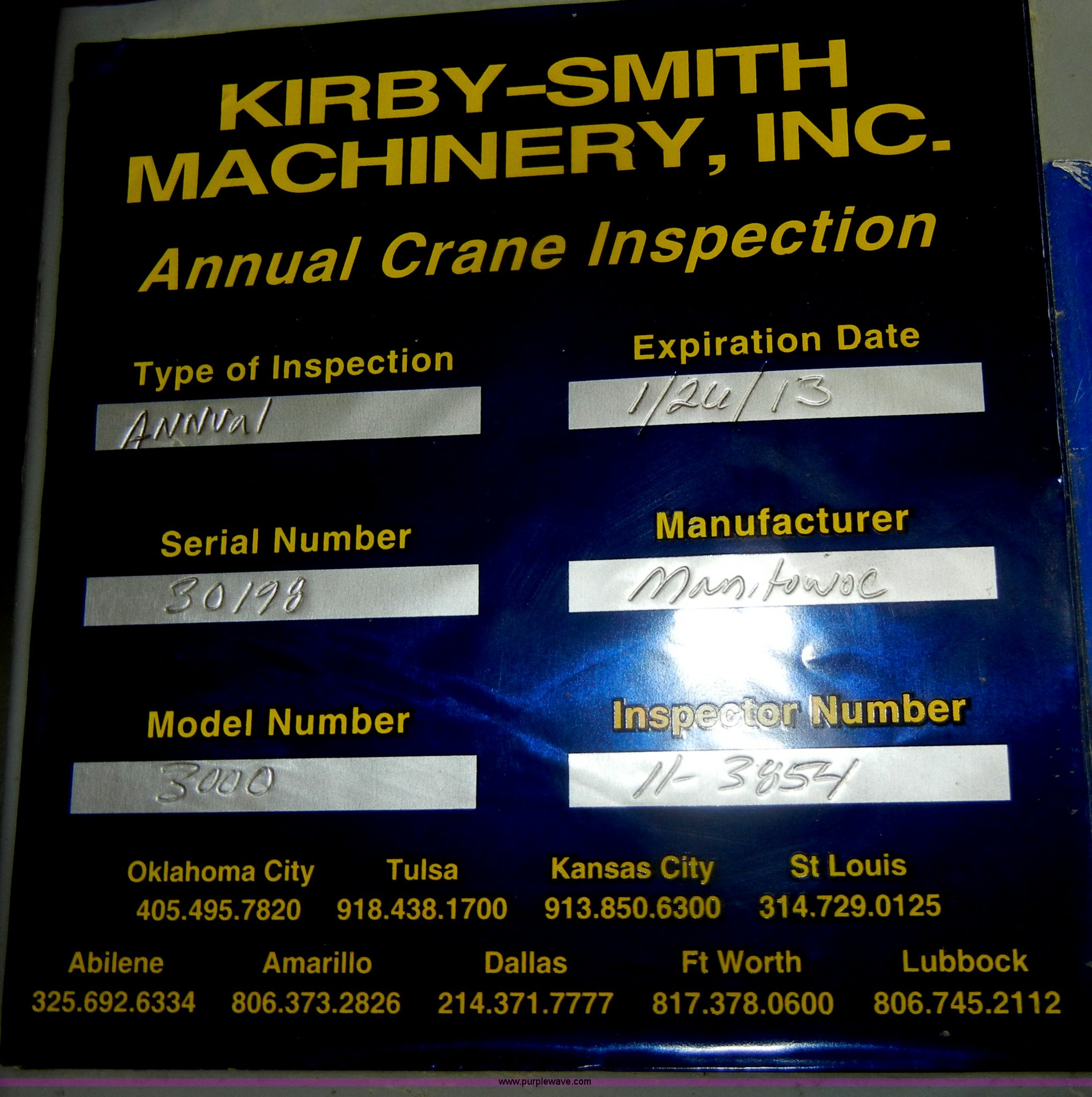 Manitowoc 3000 track crane. 2,795 hours on meter, Cummins six cylinder turbo diesel engine, Wet twin disk torque converter New, Enclosed cab Heat, All air controls, Air horn, Two drum cable system, Self-loading counter weight system, 37,700 lb counter weight, Manual retractable track, 34"W tracks, Boom sections and Jib sold separately, $25,000 invested to certify on January 20, 2012, Serial 30198, Cust# 451-G. Buyer will be responsible for all load-out arrangements. Lazer Tow will be available to load counter weights for $400. To contact Lazer Tow call 816.763.6116. Shipping quotes available. Deco Company Shop. 3801 N Arlington. Kansas City, MO 64161