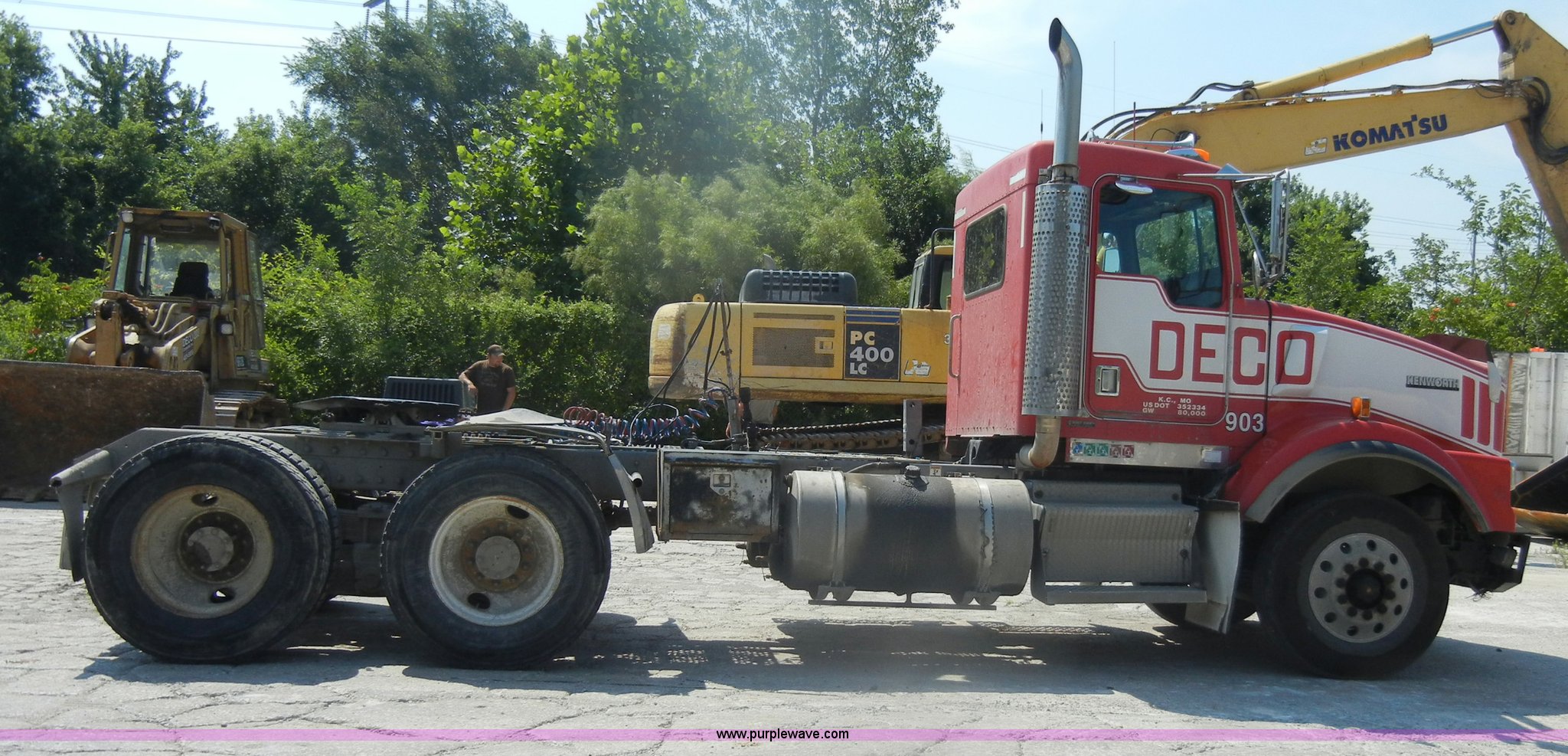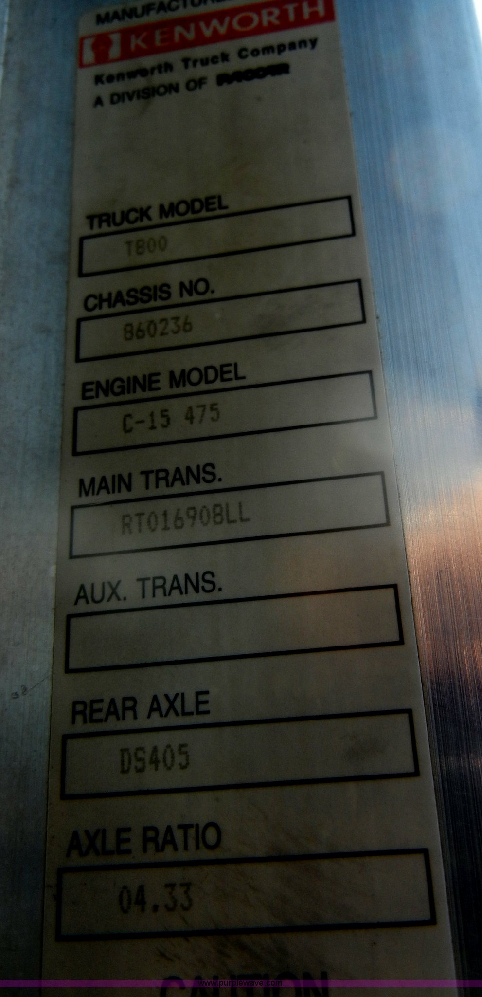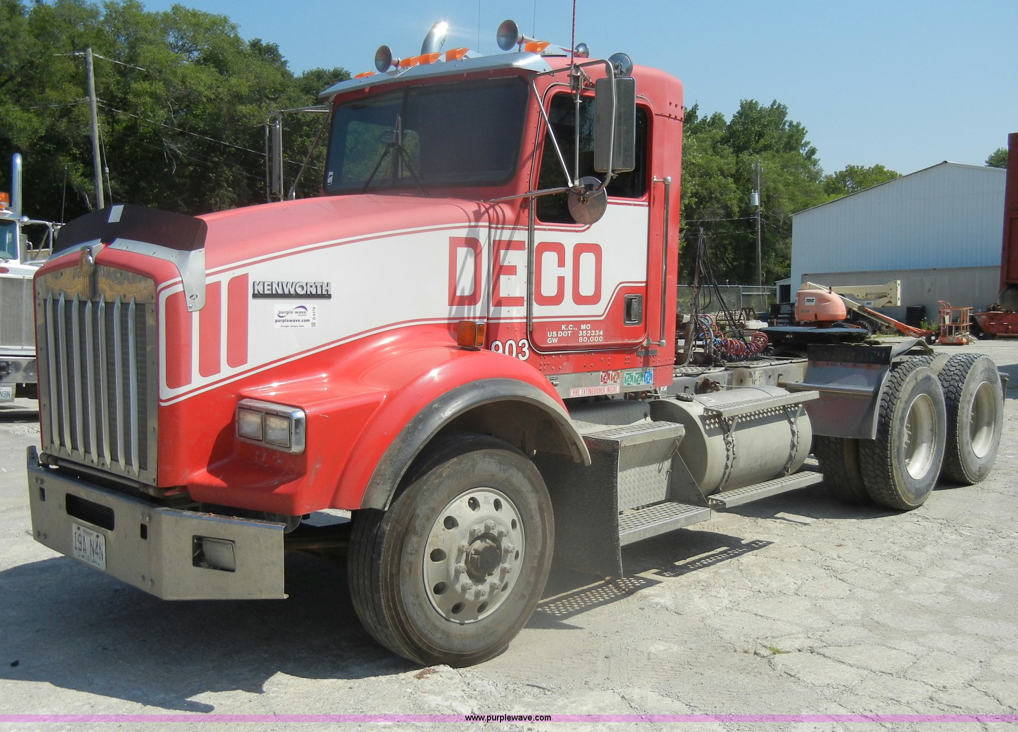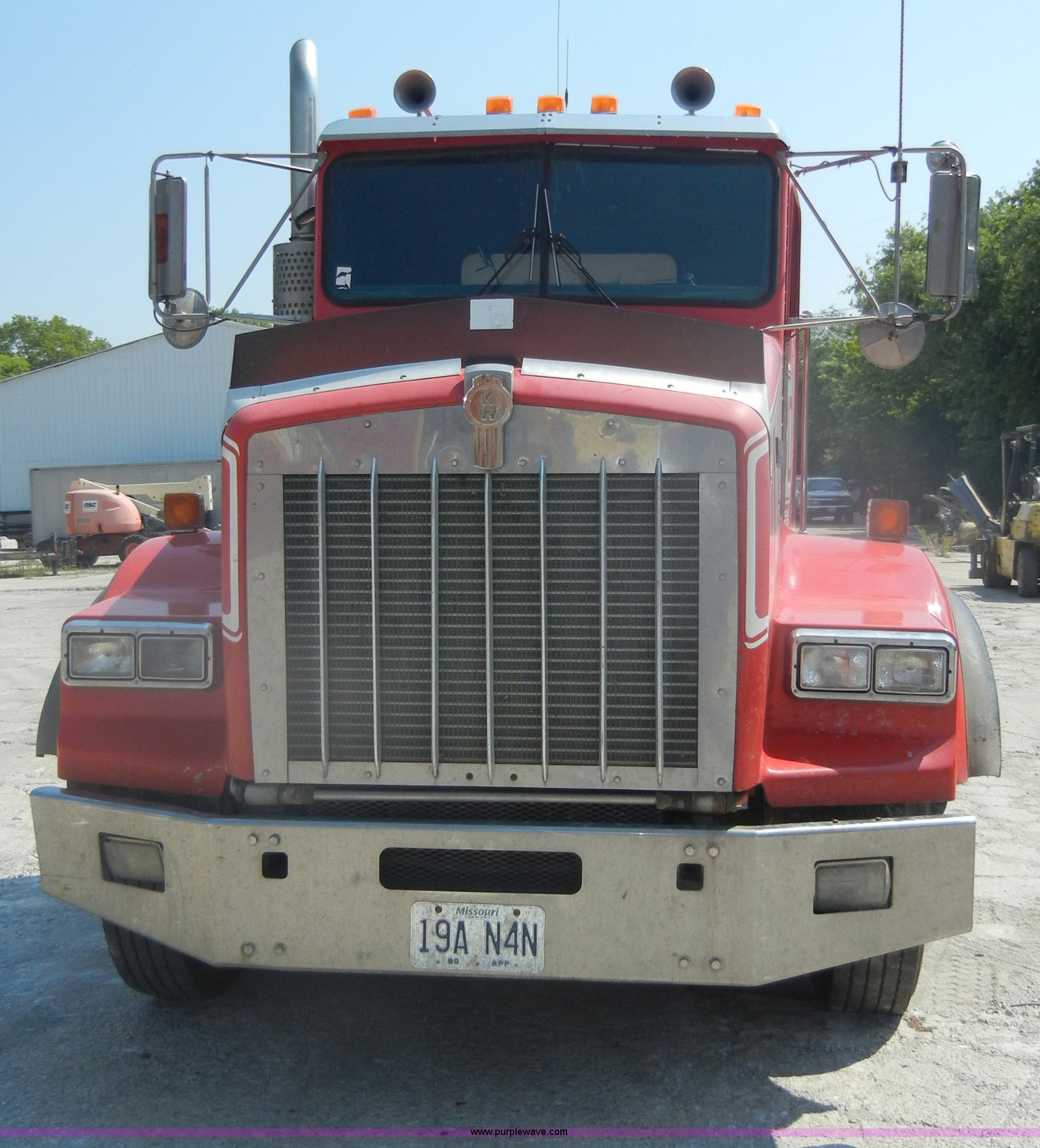 Purple Wave is selling a used Truck Tractor in Missouri. This item is a 2000 Kenworth T800 semi truck with the following: 387,129 miles on odometer, Caterpillar C15 turbo diesel engine, 475 HP, 10 speed manual transmission, Twin screw, AC and heat, Tilt, Cruise, AM/FM/Cassette, Air suspension seat, Heated mirrors, Tinted back glass, Visor, Chrome bumper, Block heater, 80 gallon fuel tank, Single rear exhaust stack, Aluminum deck plate, PTO, Wet kit, Spring suspension, Air brakes, Jake brake, Hendrickson rear end, 4.33 gear ratio, 207" wheelbase, 11R22.5 front tires, 11R24.5 rear tires, GVWR 52,350 lbs, FAWR 12,350 lbs, IAWR 20,000 lbs, RAWR 20,000 lbs