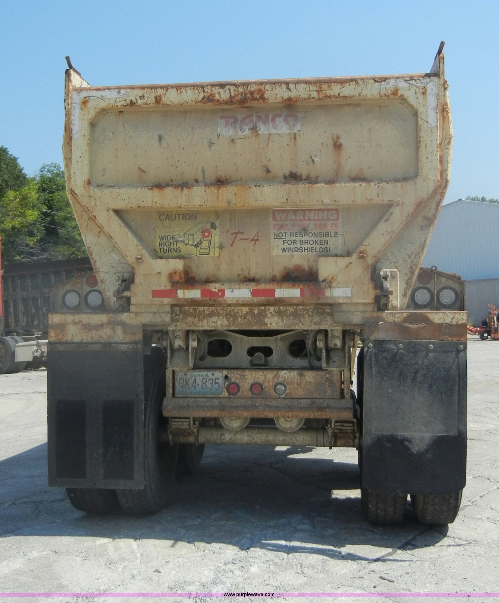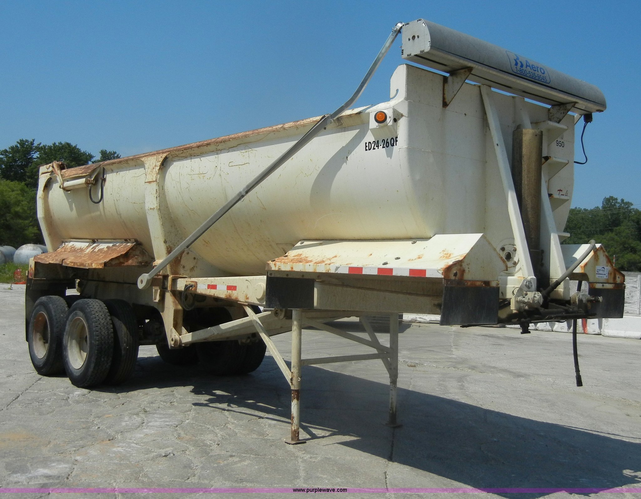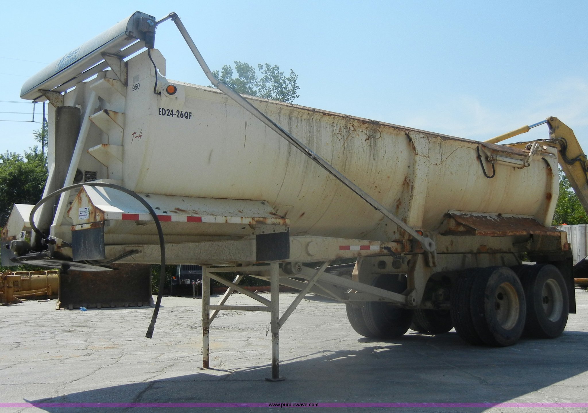 Purple Wave is selling a used End Dump Rock Trailer in Missouri. This item is a 2004 Ranch Ranco 24' barrel end dump trailer with the following: Spring suspension, Air brakes, Air end gate, Aero electric tarp system with aluminum arms, Five stage ram, 11R24.5 tires with steel wheels, GVWR 70,000 lbs, Model ED2426QF