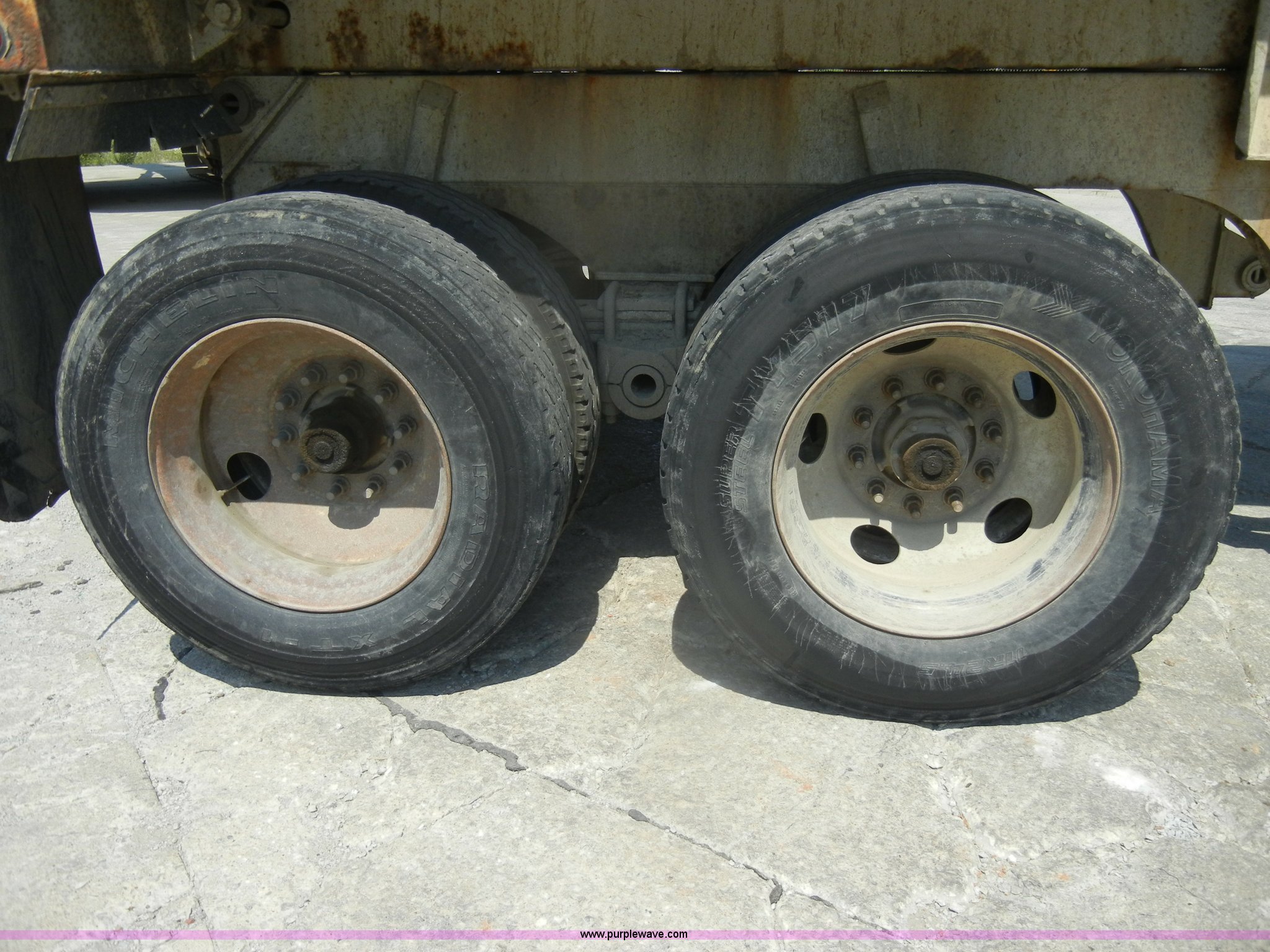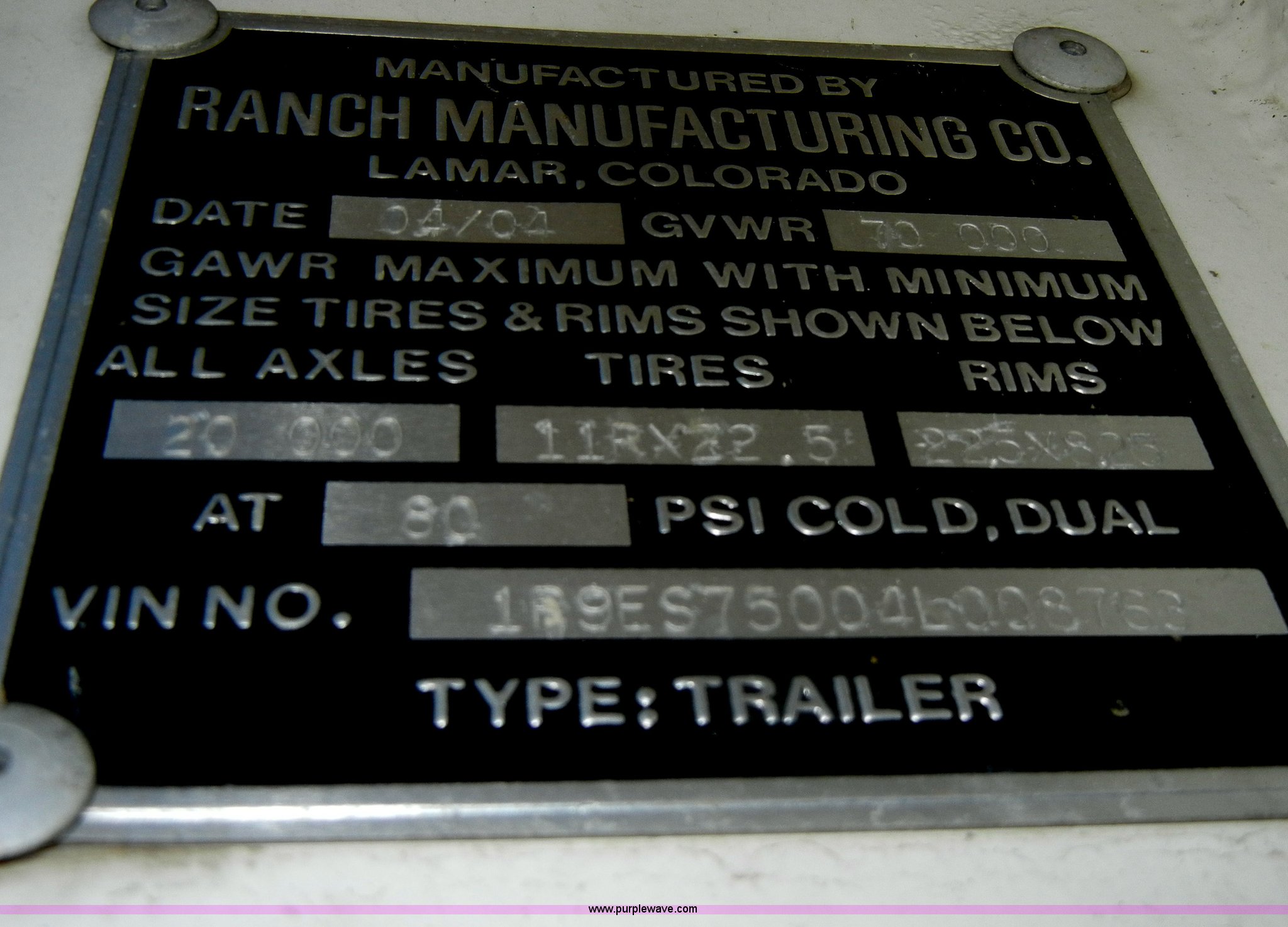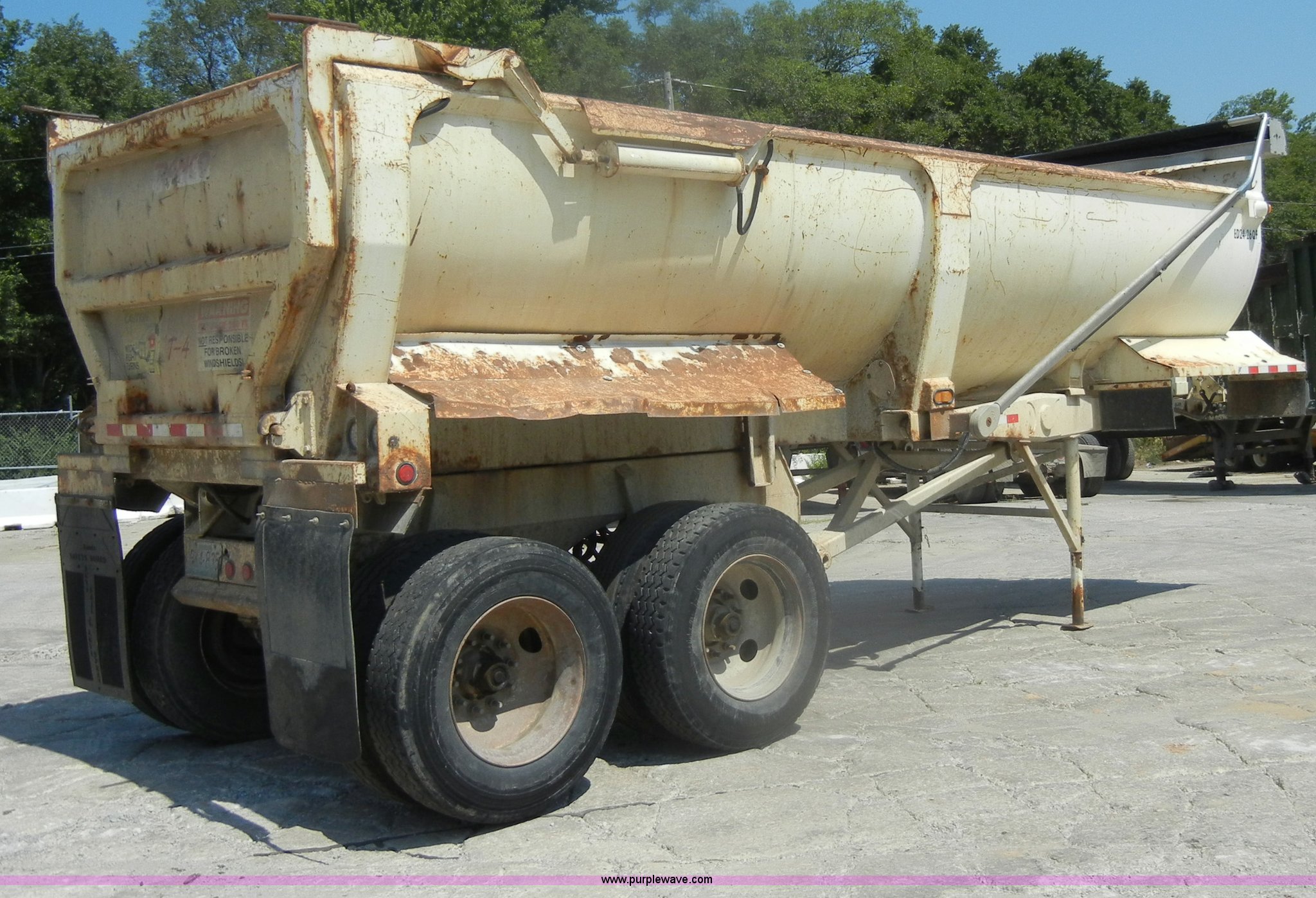 Purple Wave is selling a used End Dump Rock Trailer in Missouri. This item is a 2004 Ranch Ranco 24' barrel end dump trailer with the following: Spring suspension, Air brakes, Air end gate, Aero electric tarp system with aluminum arms, Five stage ram, 11R24.5 tires with steel wheels, GVWR 70,000 lbs, Model ED2426QF