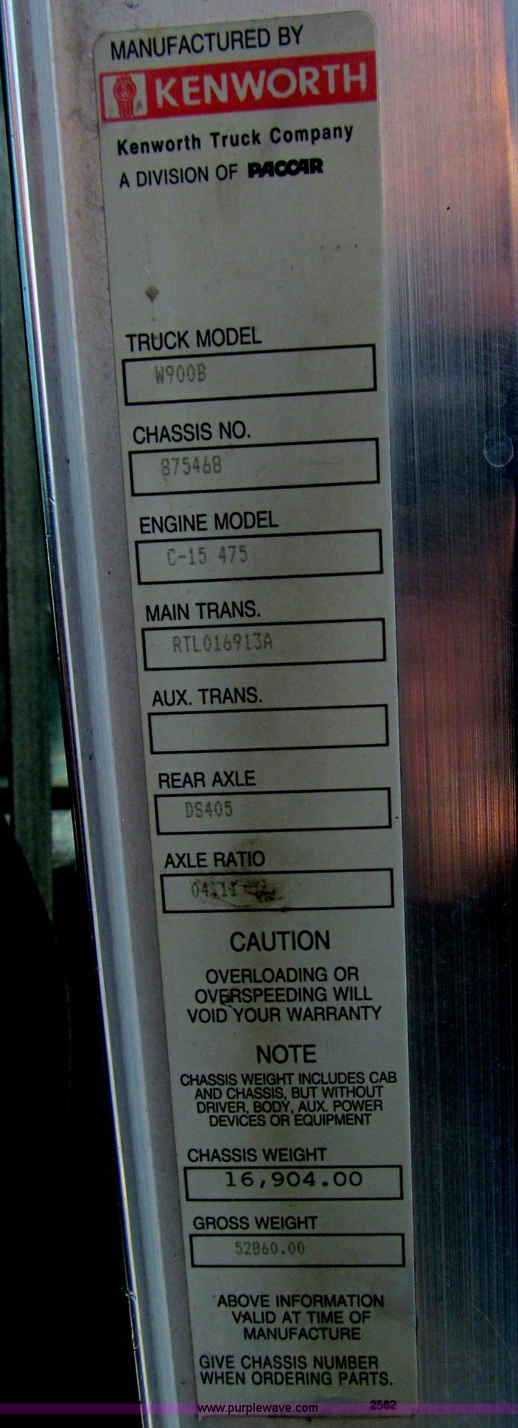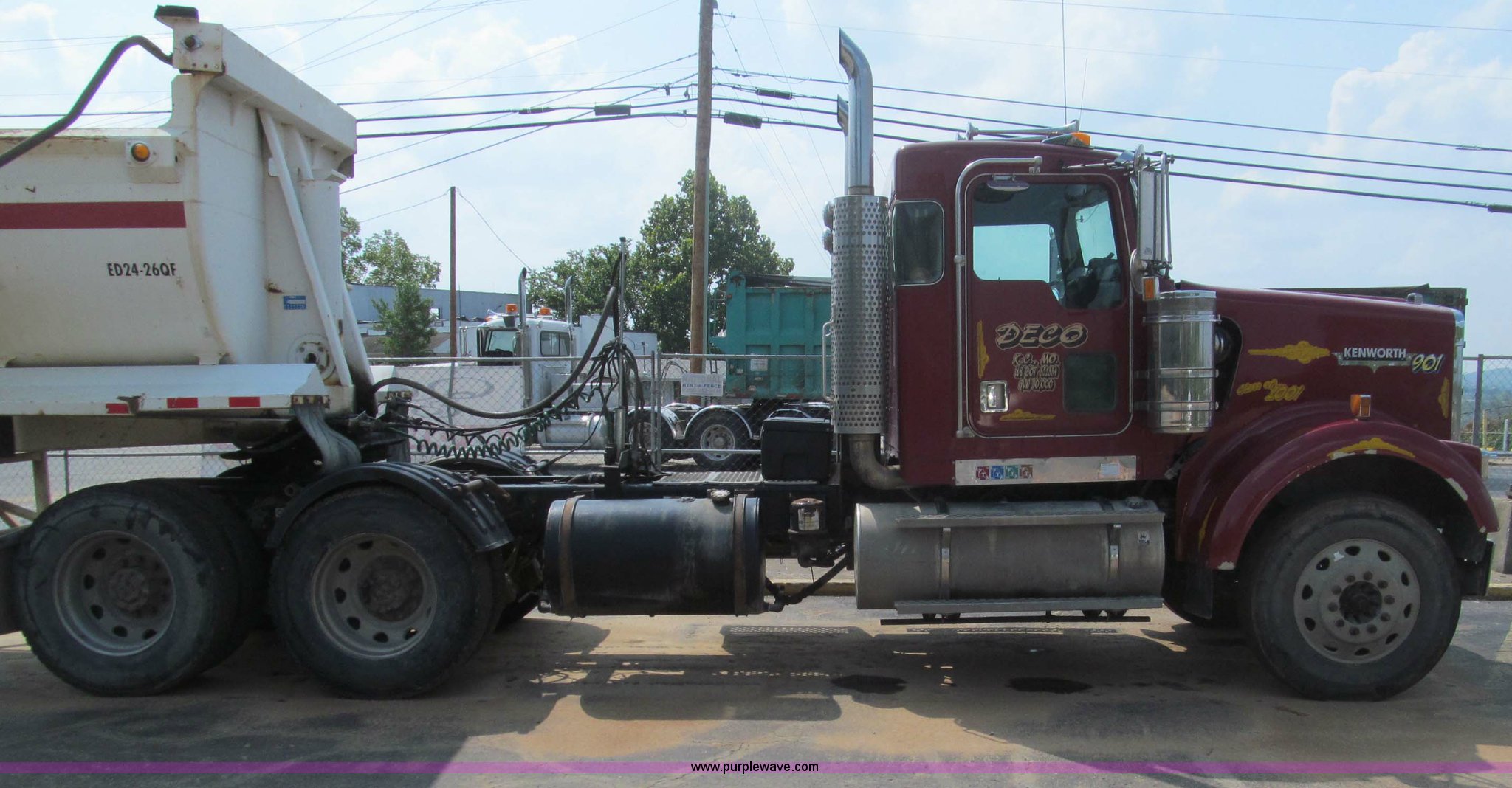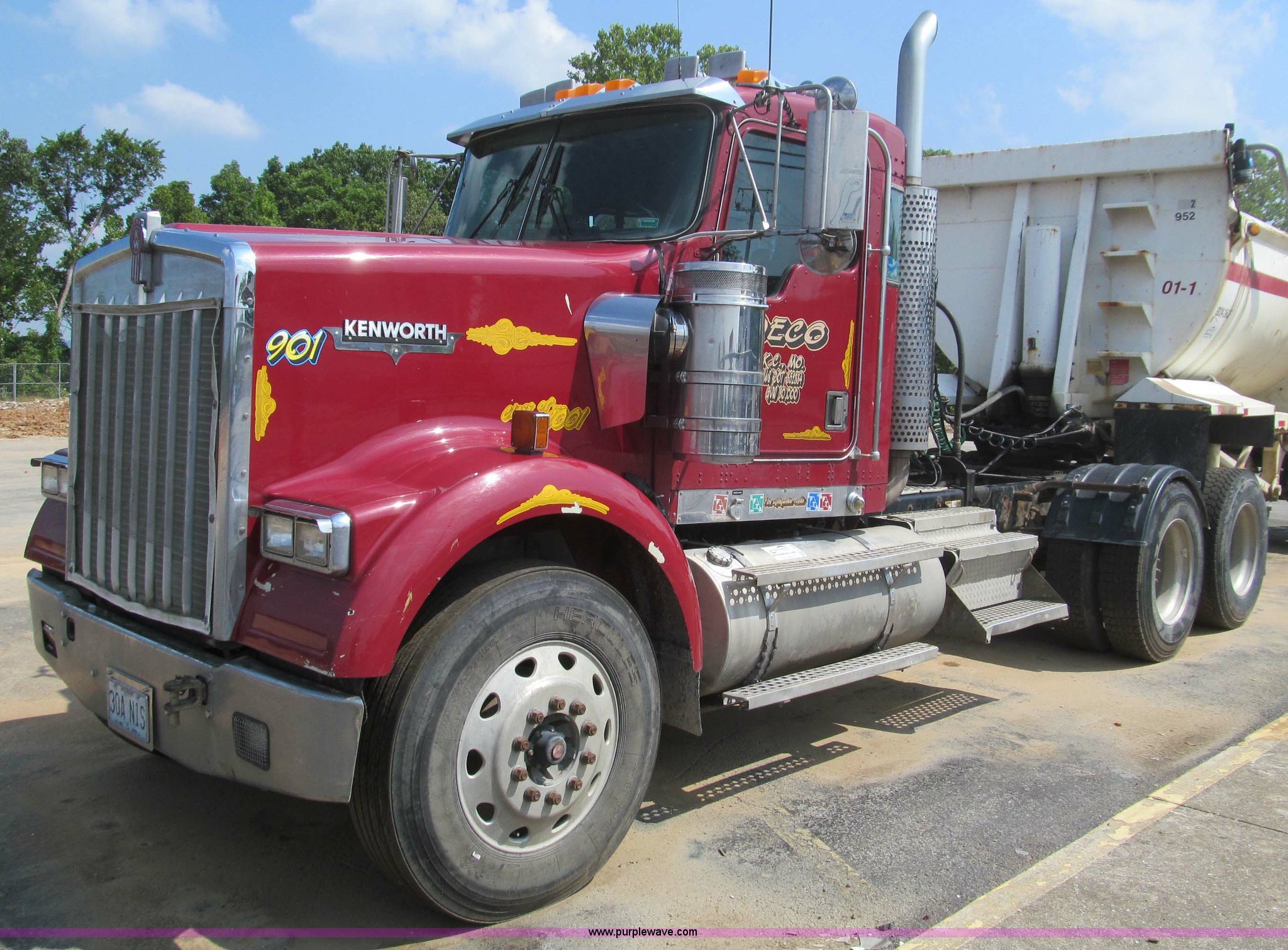 Purple Wave is selling a used Truck Tractor in Missouri. This item is a 2001 Kenworth W900 semi truck with the following: 394,339 miles on odometer, Caterpillar C15 diesel engine, 13 speed manual transmission, Model RTL016913A, Twin screw, AC and heat, Tilt, Cruise, AM/FM/Cassette, Passenger daylight door, Air suspension seat, Heated mirrors, Chrome visor, Chrome bumper, Block heater, Dual chrome breathers, Dual 100 gallon fuel tanks, Dual rear exhaust stacks, Aluminum deck plate, Plastic half fenders, PTO, Wet kit, Dump valves, Air suspension, Eight-bag air ride, Air brakes, Brake controller, 411 gear ratio, 222" wheelbase, Aluminum Bud wheels, 11R24.5 tires, GVWR 52,860 lbs, FAWR 12,000 lbs, IAWR 20,000 lbs, RAWR 20,000 lbs, Equip# 901