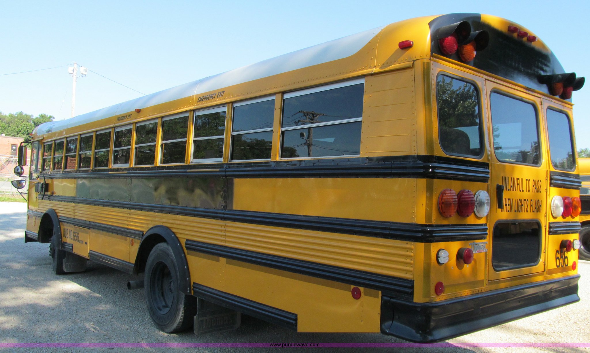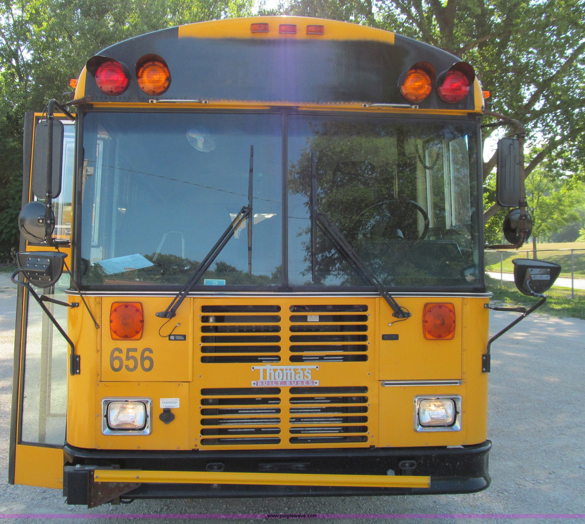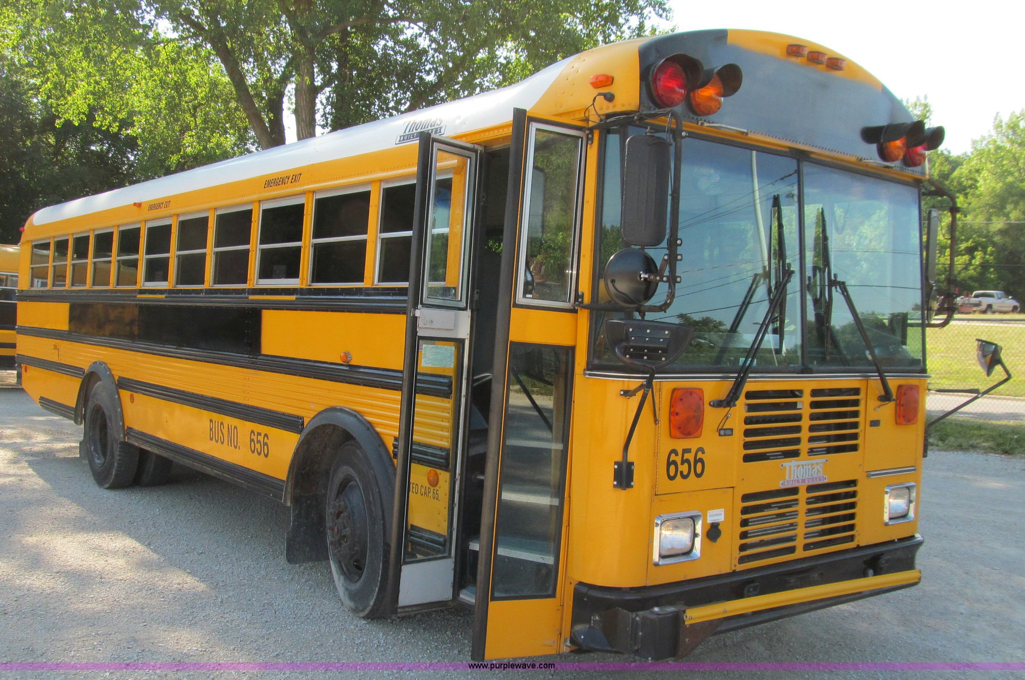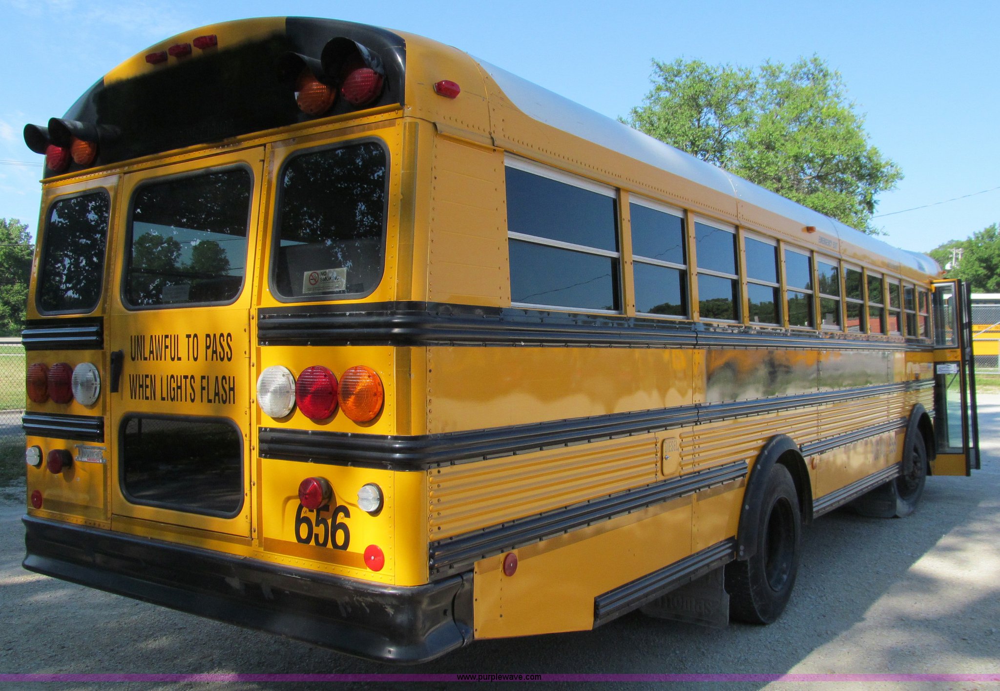Purple Wave is selling a used Bus in Iowa. This item is a 2002 Thomas Saf-T-Liner school bus with the following: 131,413 miles on odometer, 9,678 hours on meter, 65 passenger, Cummins EFISB210 six cylinder turbo diesel engine, AD-2000 automatic transmission, Heat, Tilt, Cruise, Manual windows, Vinyl interior, (7) emergency egresses, 172" wheelbase, 10R22.5 tires, GVWR 30,000 lbs, FAWR 11,300 lbs, RAWR 19,000 lbs, Video security system not included, Brake issues, Brake chamber disconnected, Unit# 656