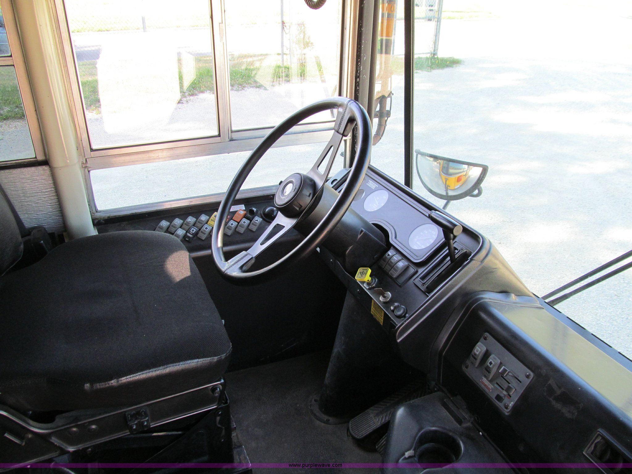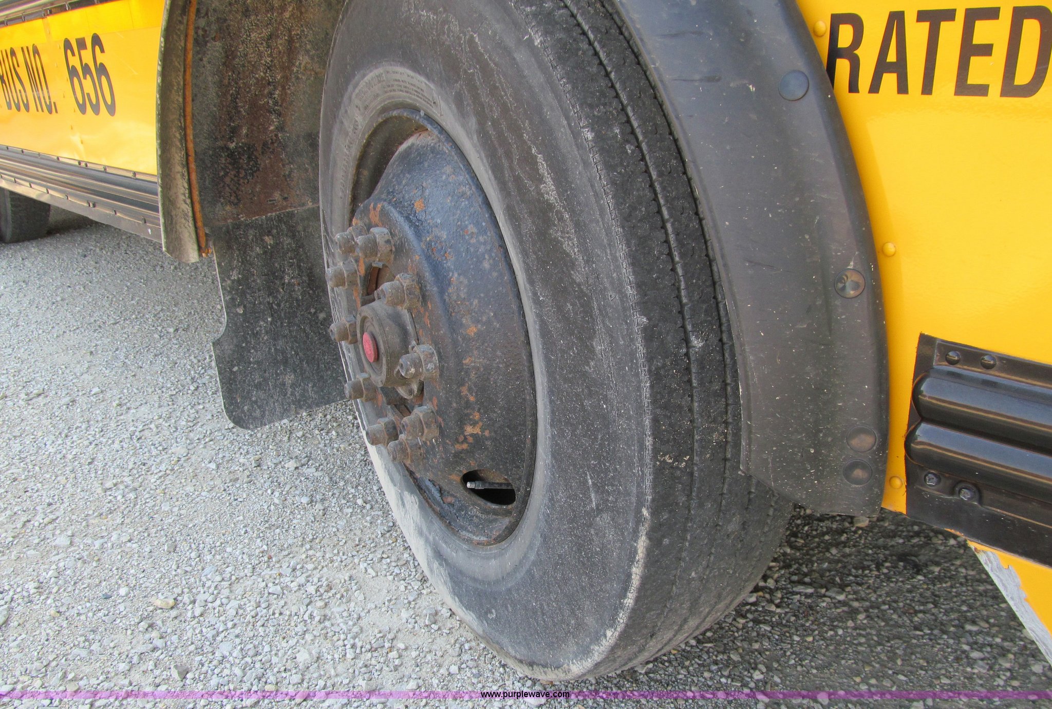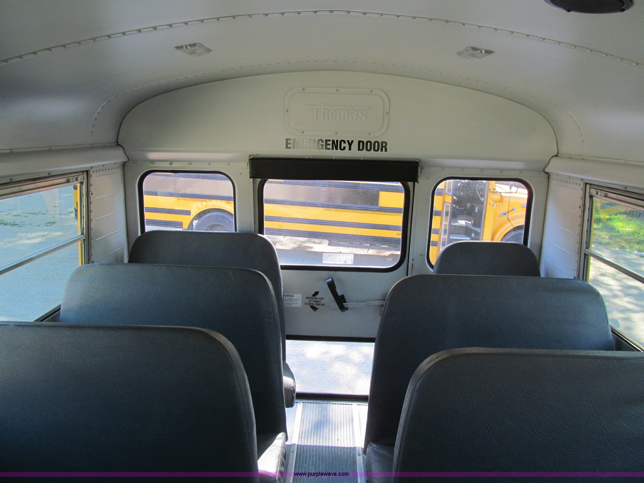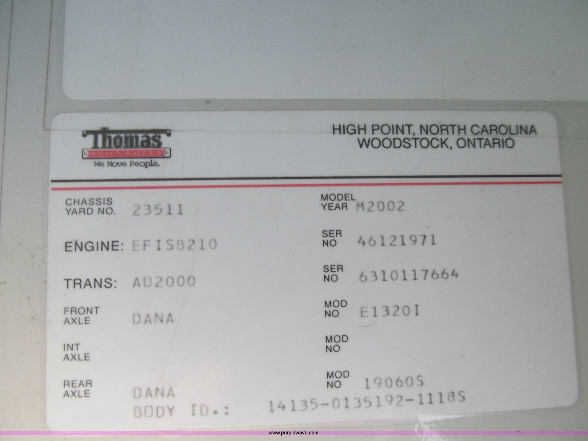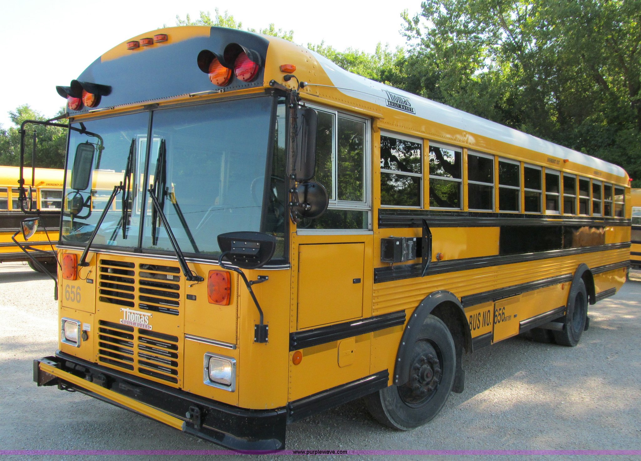 Purple Wave is selling a used Bus in Iowa. This item is a 2002 Thomas Saf-T-Liner school bus with the following: 131,413 miles on odometer, 9,678 hours on meter, 65 passenger, Cummins EFISB210 six cylinder turbo diesel engine, AD-2000 automatic transmission, Heat, Tilt, Cruise, Manual windows, Vinyl interior, (7) emergency egresses, 172" wheelbase, 10R22.5 tires, GVWR 30,000 lbs, FAWR 11,300 lbs, RAWR 19,000 lbs, Video security system not included, Brake issues, Brake chamber disconnected, Unit# 656