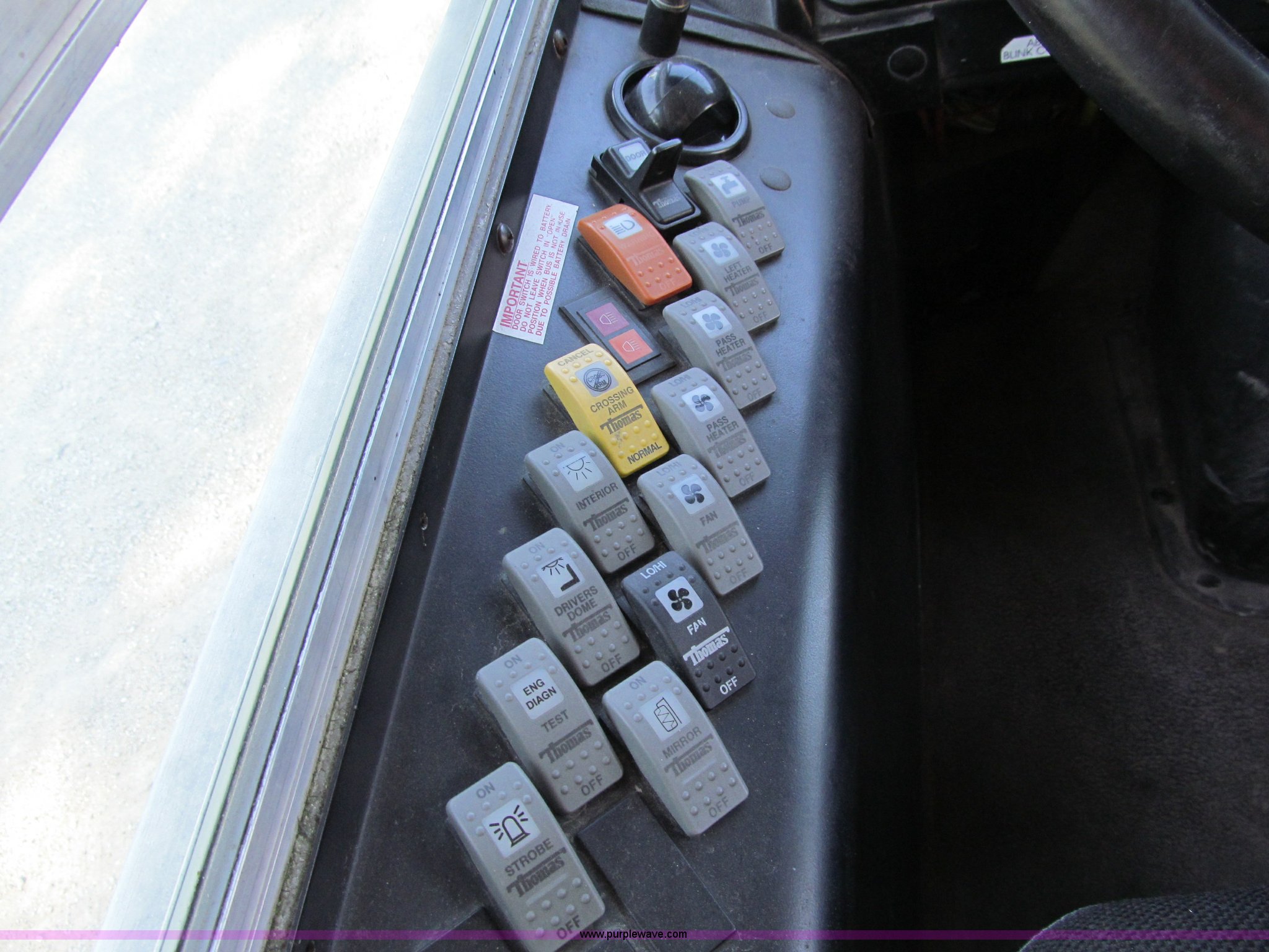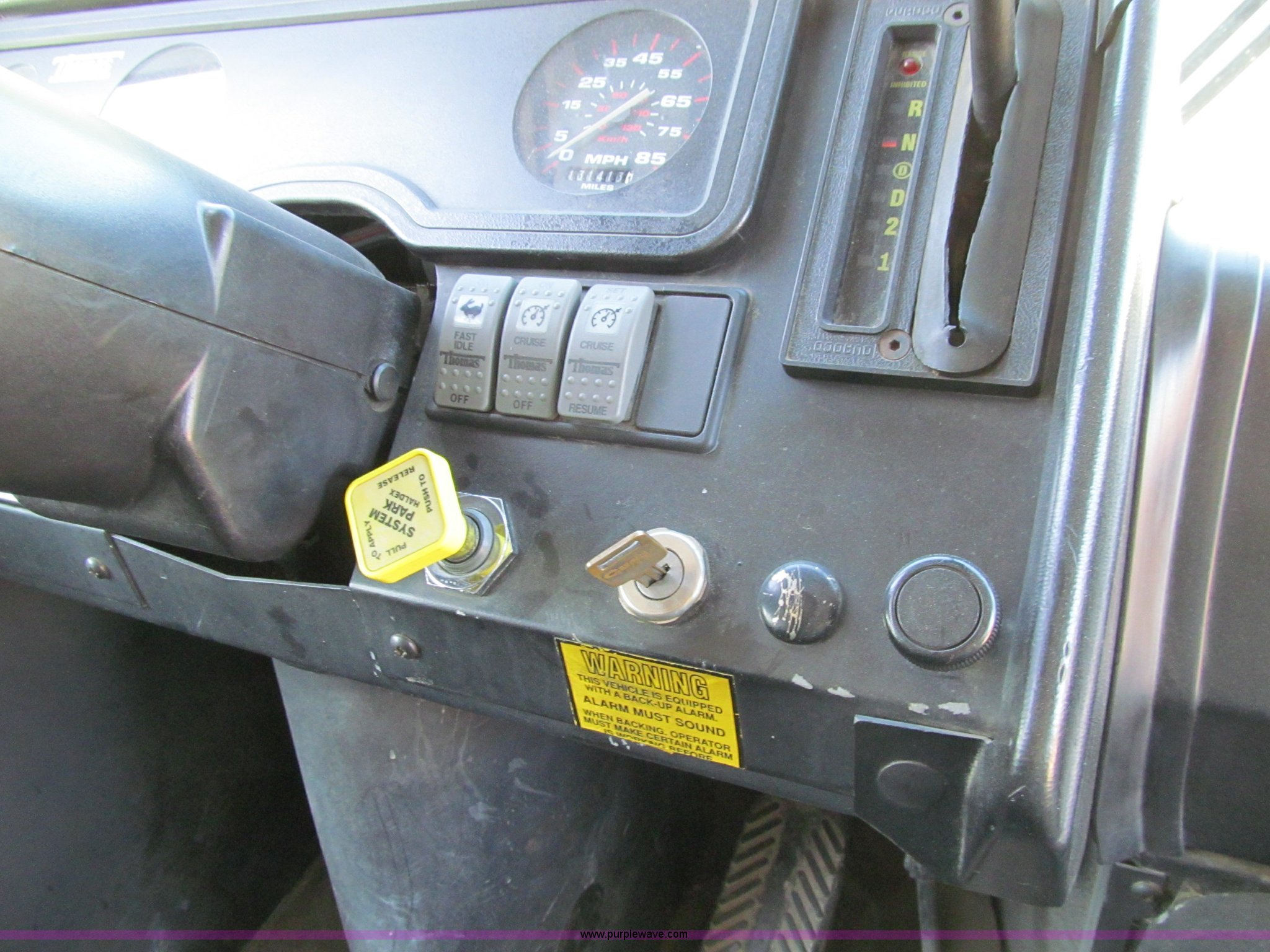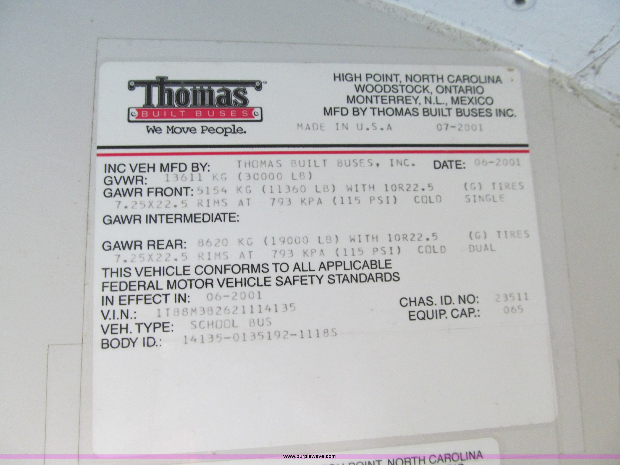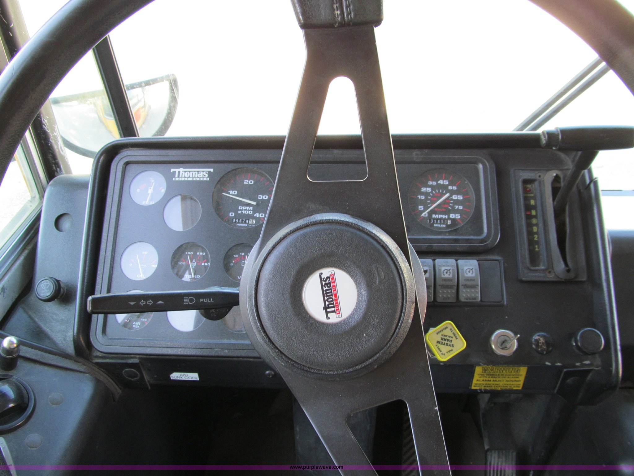 Purple Wave is selling a used Bus in Iowa. This item is a 2002 Thomas Saf-T-Liner school bus with the following: 131,413 miles on odometer, 9,678 hours on meter, 65 passenger, Cummins EFISB210 six cylinder turbo diesel engine, AD-2000 automatic transmission, Heat, Tilt, Cruise, Manual windows, Vinyl interior, (7) emergency egresses, 172" wheelbase, 10R22.5 tires, GVWR 30,000 lbs, FAWR 11,300 lbs, RAWR 19,000 lbs, Video security system not included, Brake issues, Brake chamber disconnected, Unit# 656