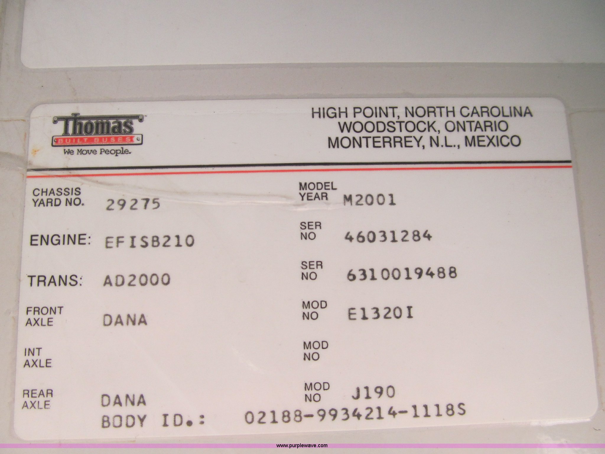 Take a look at this used 2001 Thomas Built Saf-T-Liner school bus being sold on August 7th, 2012 in the SOLD! Tuesday August 7 Government Auction made by Thomas Built. Take a look at all of the item information below or take a look at similar auctions for Transit Vehicles.