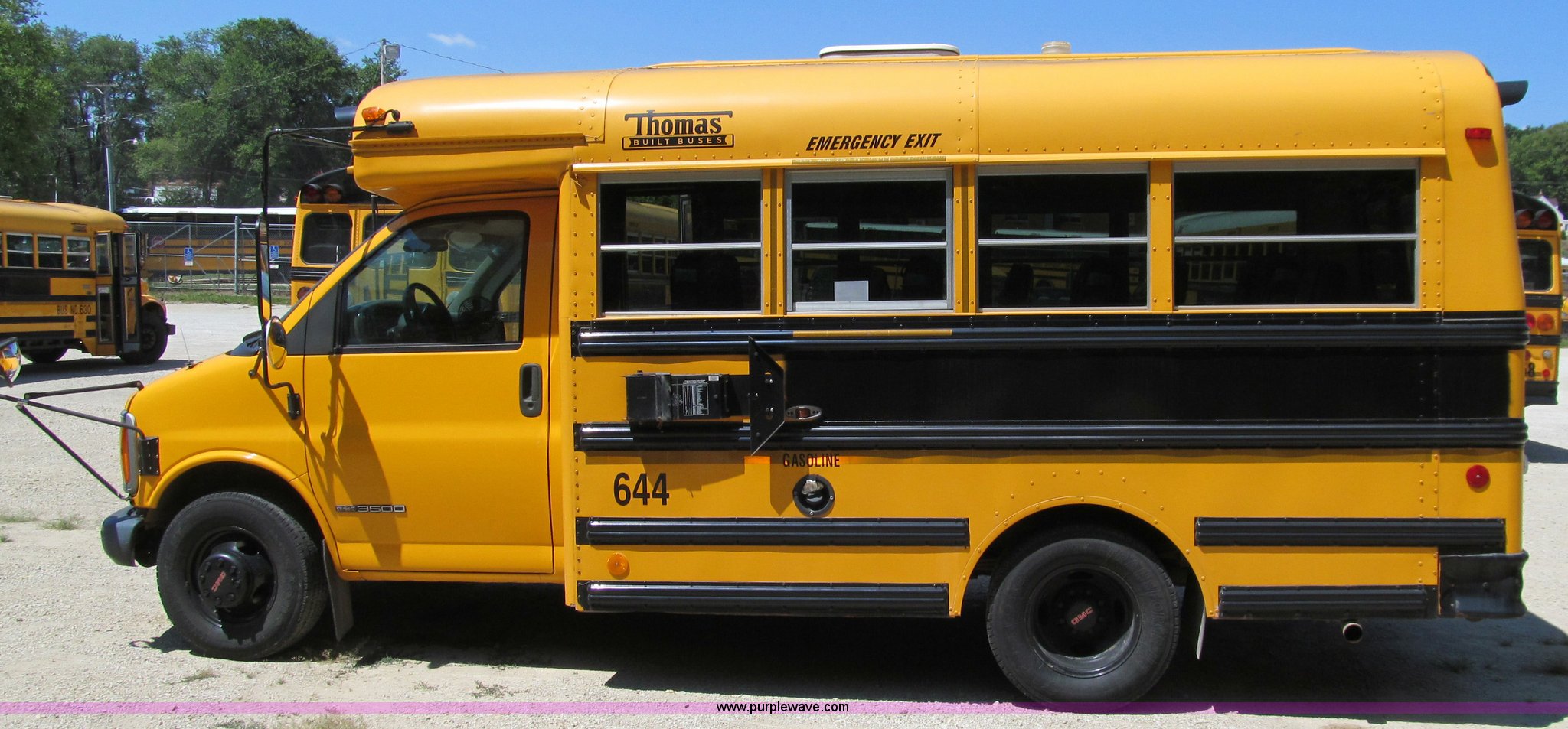 Purple Wave is selling a used Bus in Iowa. This item is a 2001 GMC Savana 3500 school bus with the following: 136,305 miles on odometer, 22 passenger, 5.7L V8 gas engine, Automatic transmission, Heat, AM/FM, Manual windows and locks, Vinyl interior, (4) emergency egress, Thomas body, 140" wheelbase, LT225/75R16 tires, GVWR 12,000 lbs, FAWR 4,300 lbs, RAWR 8,600 lbs, Unit# 644