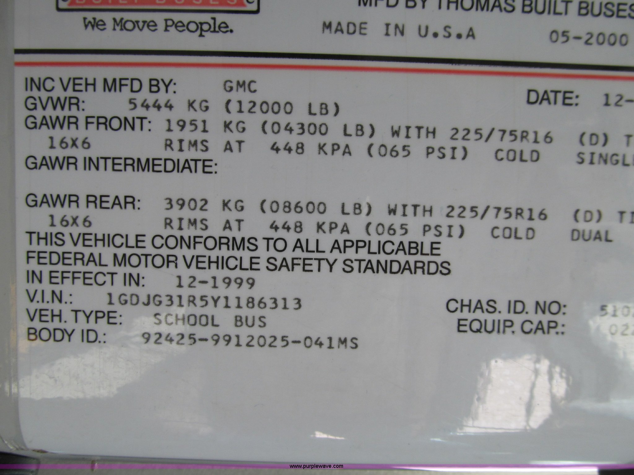 2001 GMC Savana 3500 school bus. 136,305 miles on odometer, 22 passenger, 5.7L V8 gas engine, Automatic transmission, Heat, AM/FM, Manual windows and locks, Vinyl interior, (4) emergency egress, Thomas body, 140" wheelbase, LT225/75R16 tires, GVWR 12,000 lbs, FAWR 4,300 lbs, RAWR 8,600 lbs, Unit# 644. 1GDJG31R5Y1186313. Shipping quotes available. Des Moines Public Schools. 1915 Prospect Road. Des Moines, IA 50309