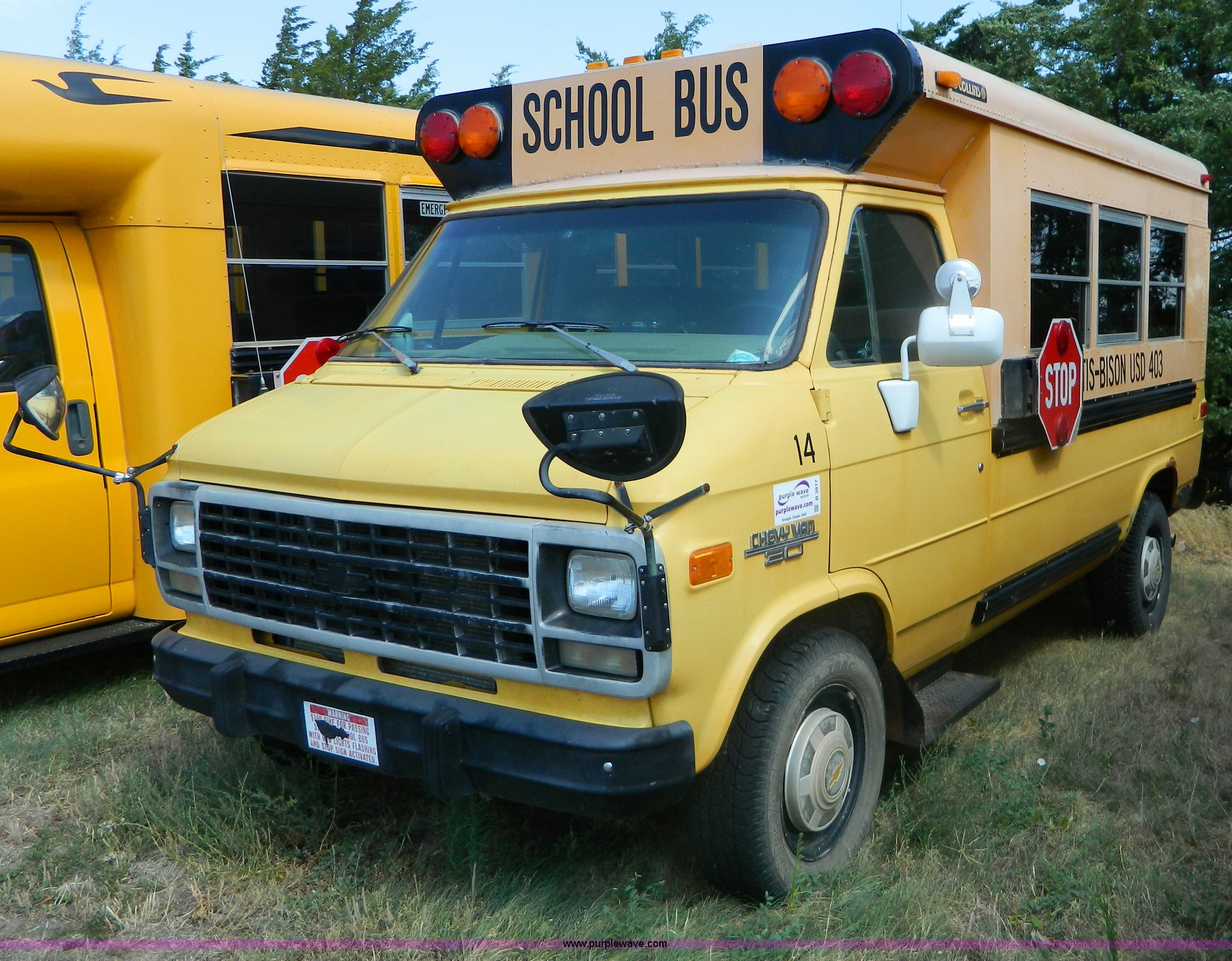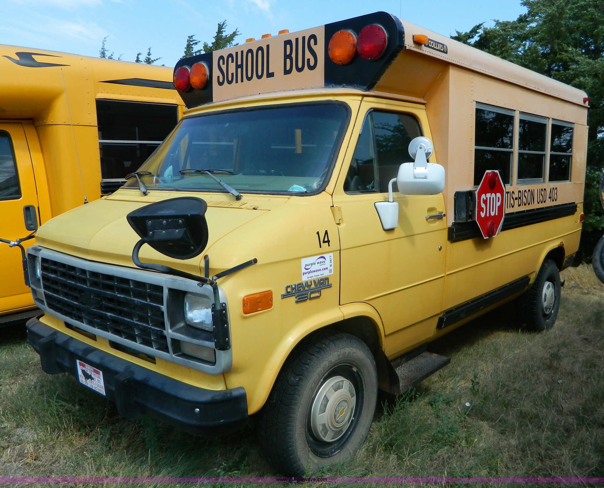 Purple Wave is selling a used Bus in Kansas. This item is a 1993 Chevrolet G30 bus with the following: 144,893 miles on odometer, 16 passenger, 5.7L V8 gas engine, Automatic transmission, AM/FM/Cassette, Collins conversion, Collins light system, LT225/75R16 tires, GVWR 9,200 lbs, Operators manuals, Interior/exterior cosmetic damage, Body rust, No personal property included