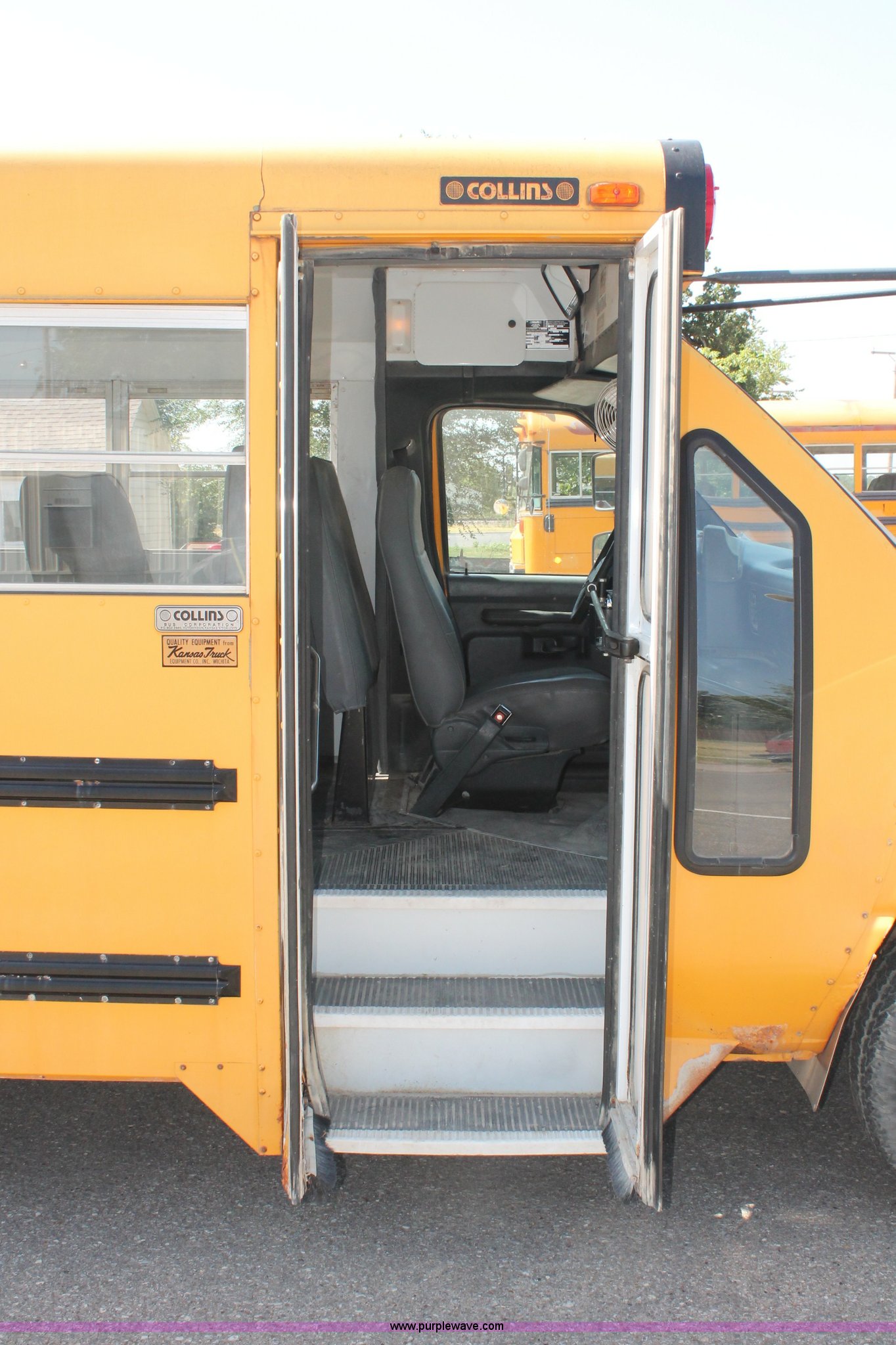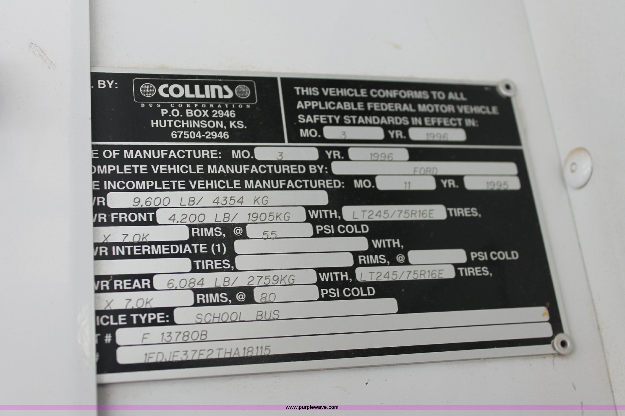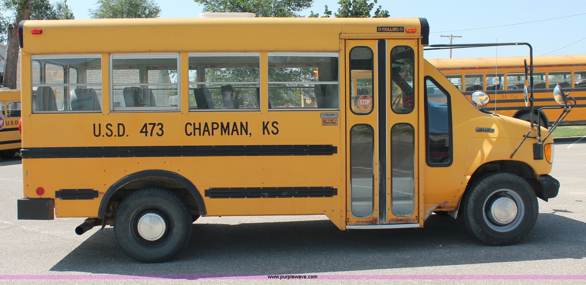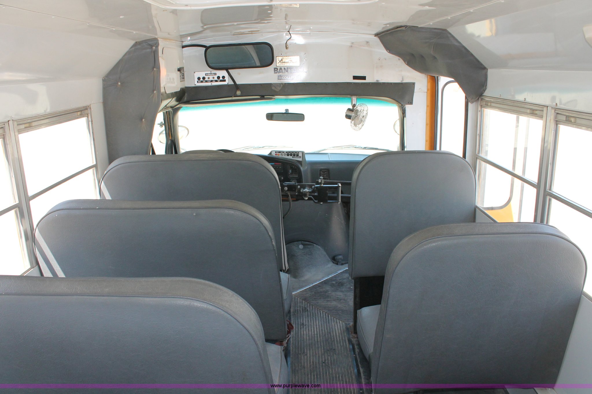 Purple Wave is selling a used Bus in Kansas. This item is a 1996 Ford E350 Econoline school bus with the following: 160,750 miles on odometer, 18 passenger, 7.3L V8 turbo diesel engine, Automatic transmission, Heat, AM/FM, Manual windows and locks, Mirror heater, Vinyl interior, Collins Bus Corporation instrumentation, Rear, roof, and window emergency egress, Seat belt equipped, Block heater, 245/75R16 tires