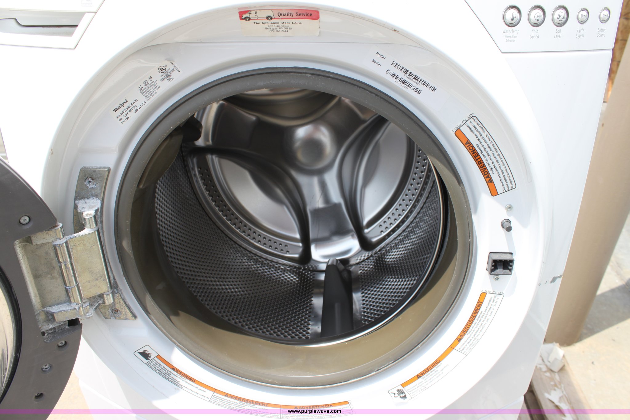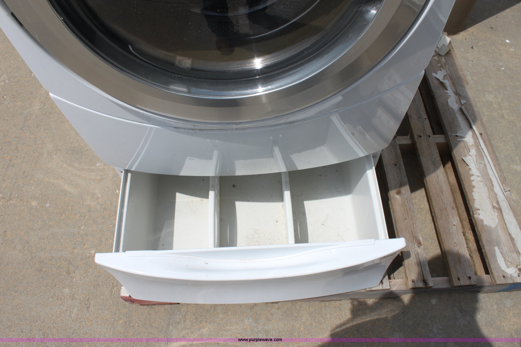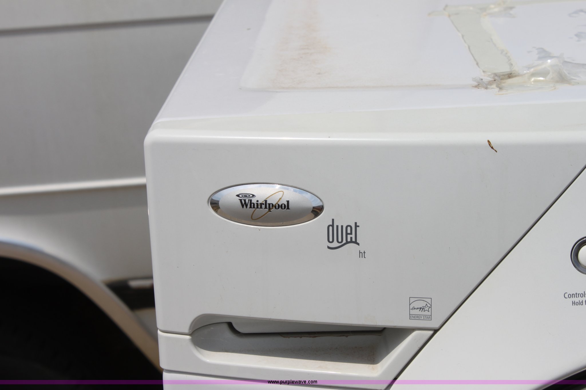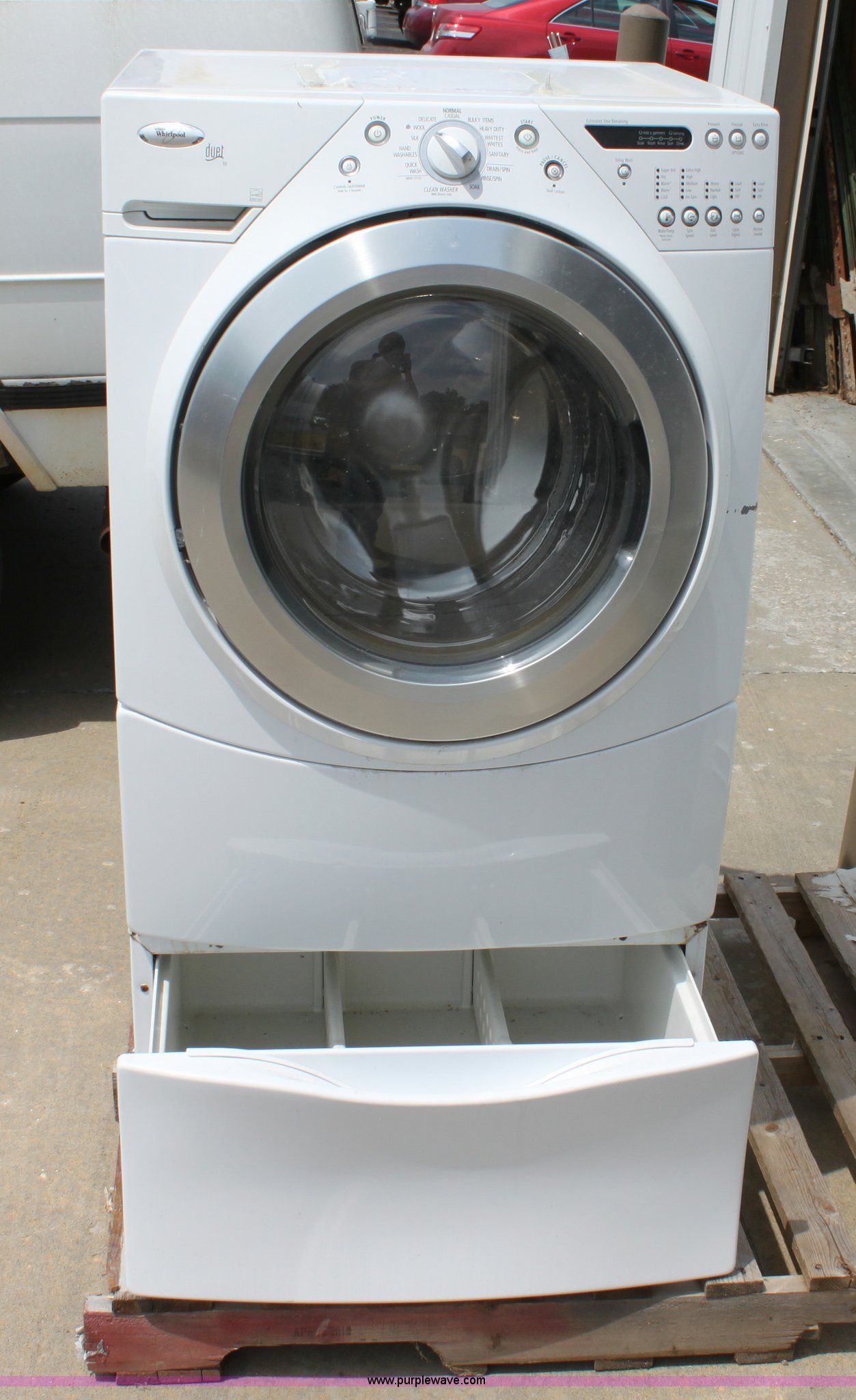 Purple Wave is selling a used Appliances in Kansas. This item is a Whirlpool duet washing machine with the following: Pedestal base, Drum and main bearing need replaced