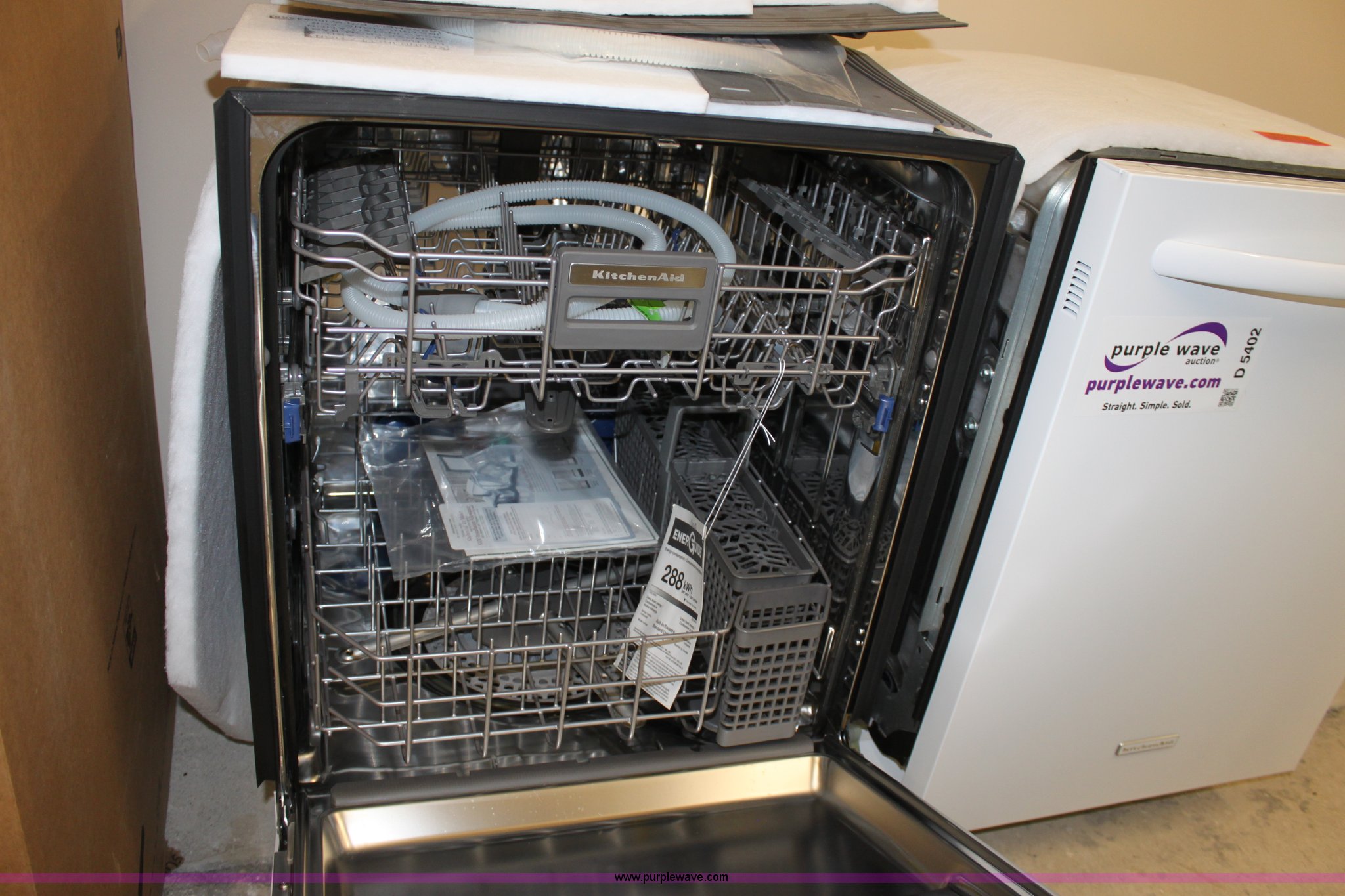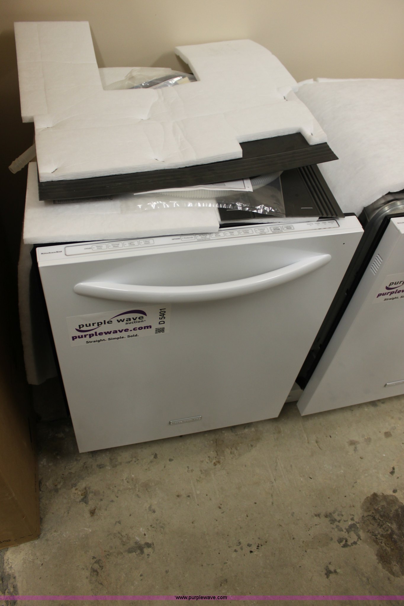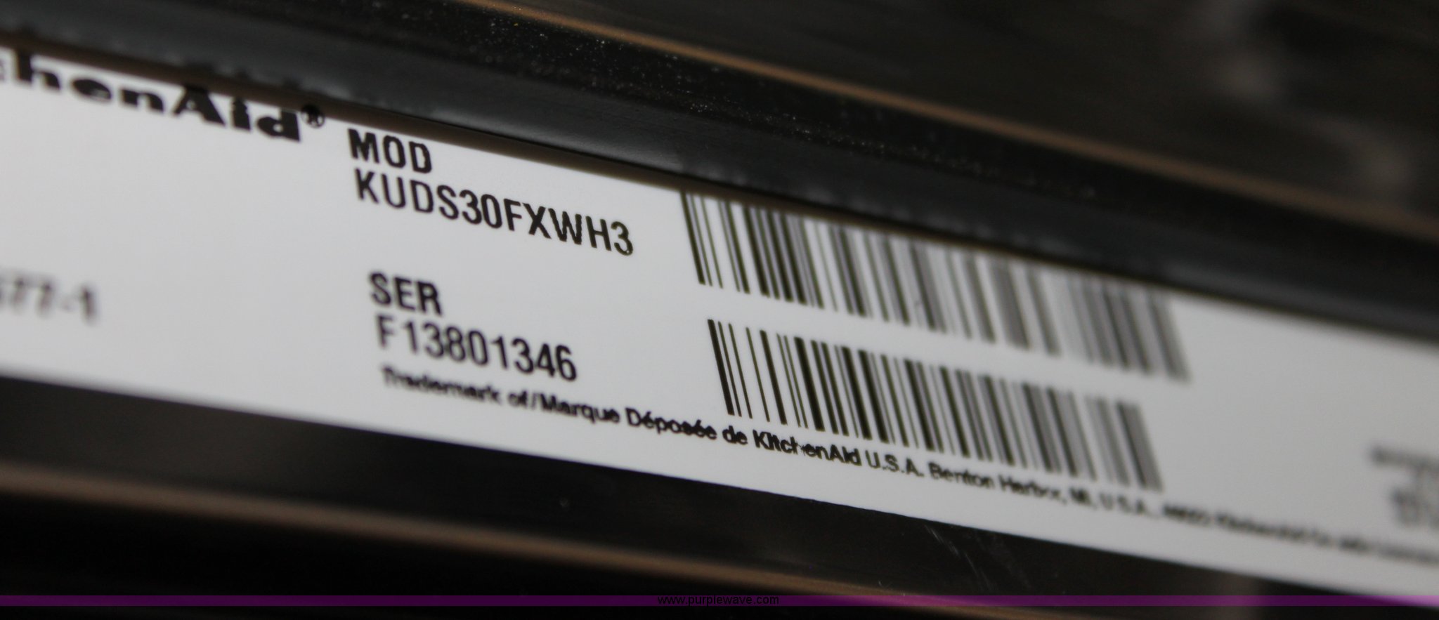 Purple Wave is selling a used Appliances in Kansas. This item is a Kitchen Aid dishwasher with the following: New, 23.5"W x 34.25"H, Model KUDS30FXWH3, Serial F13801346