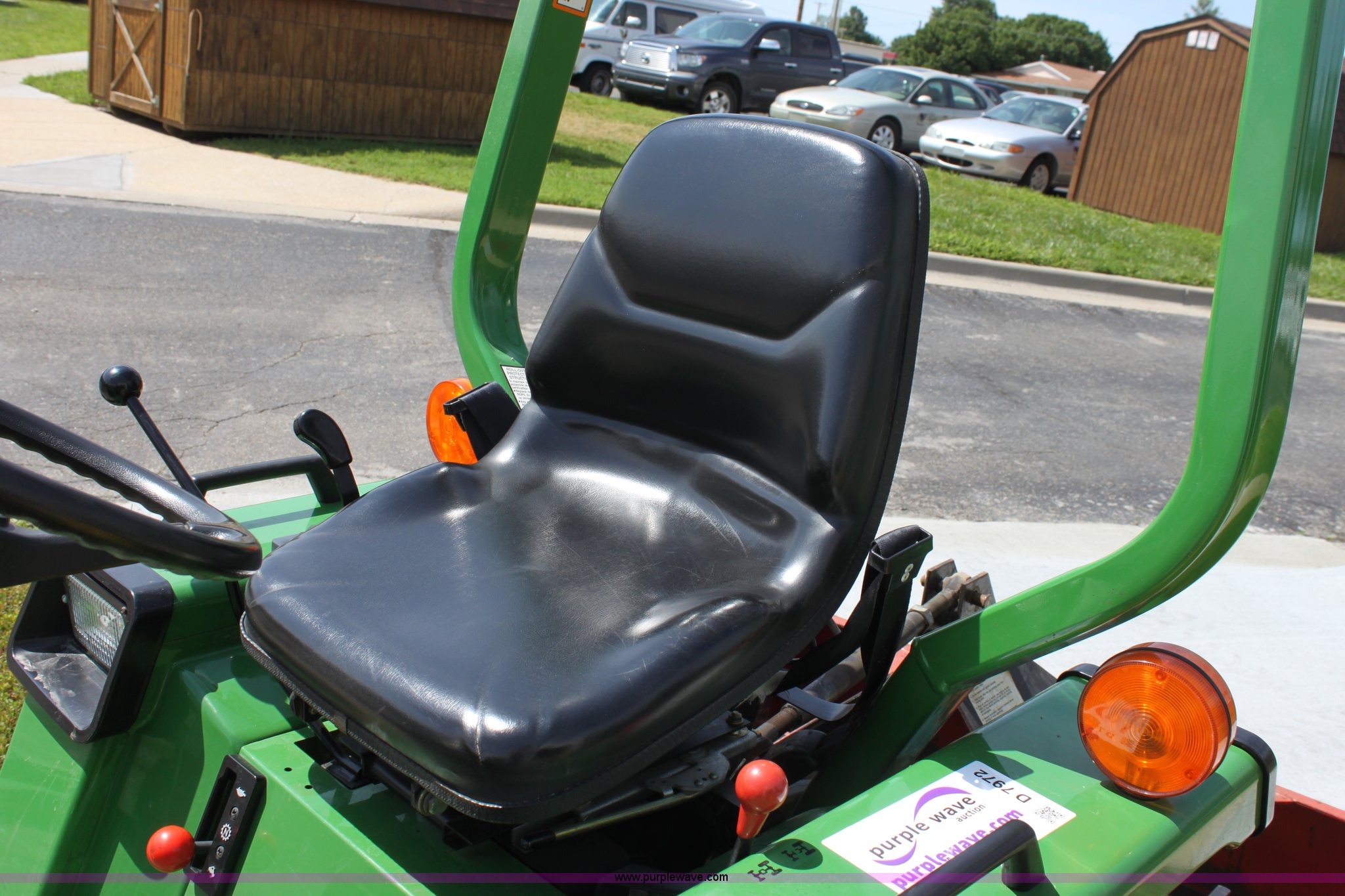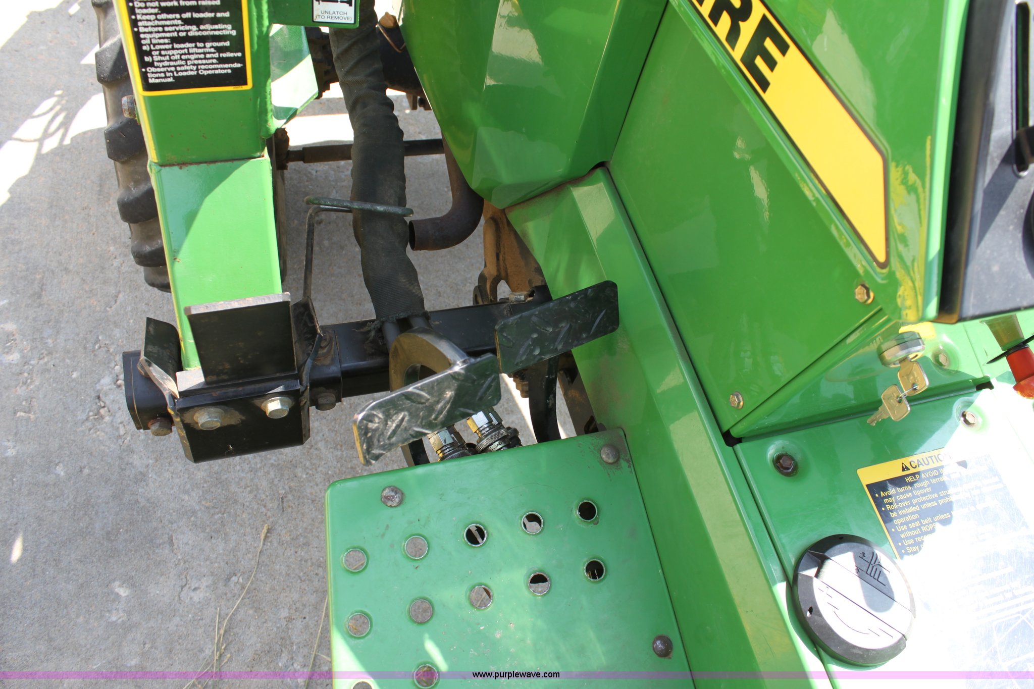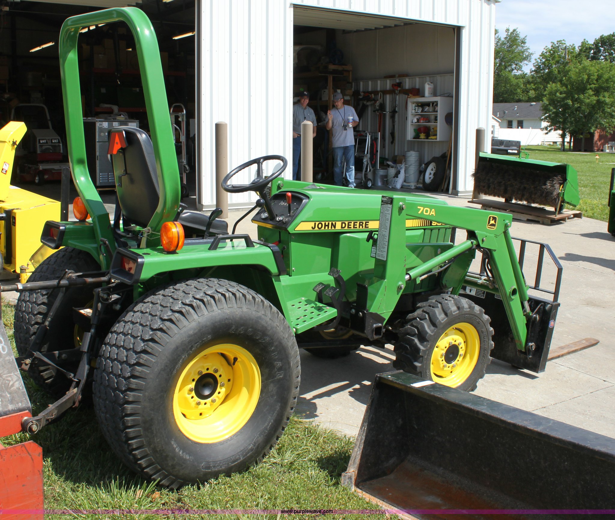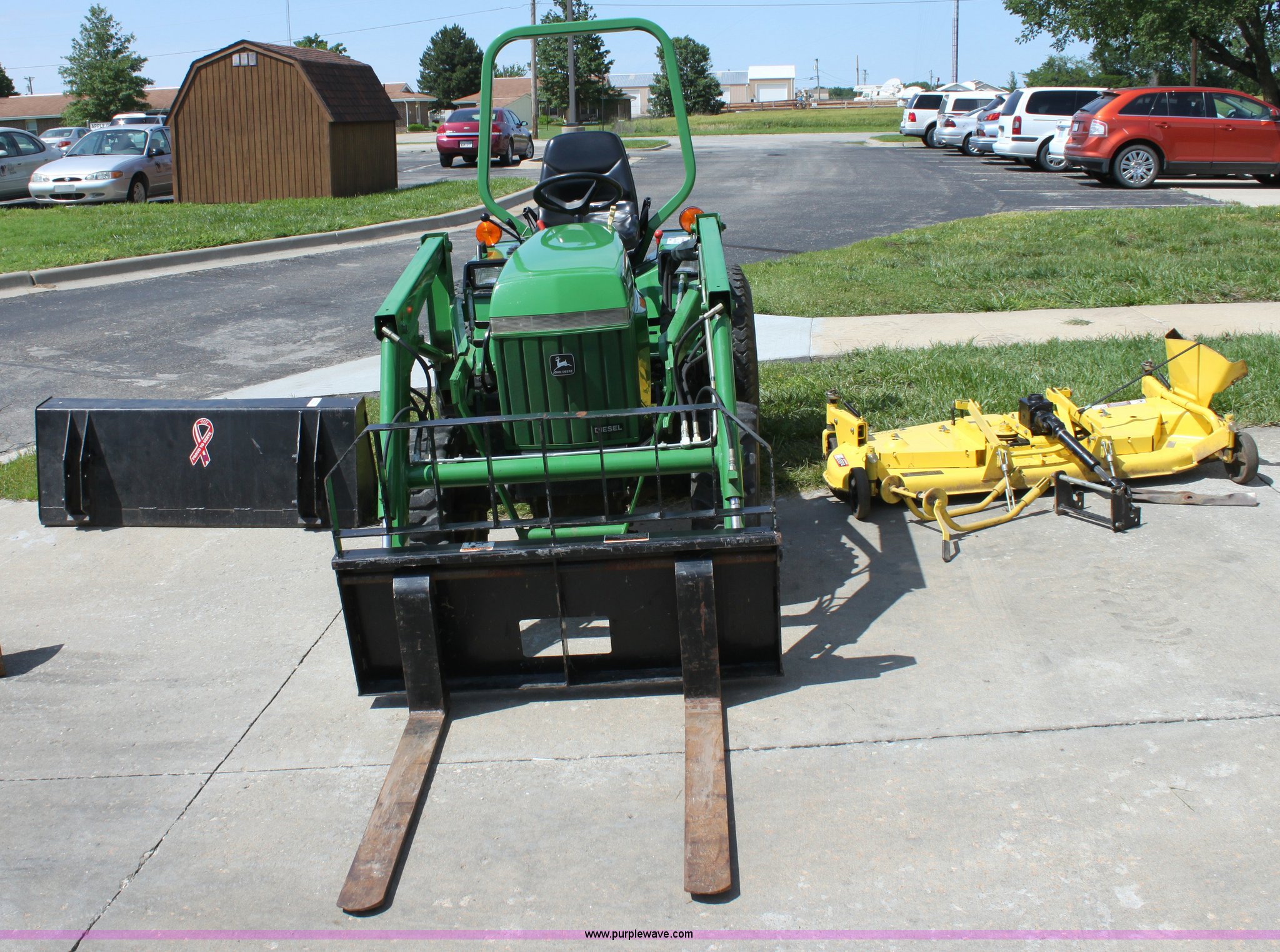 Purple Wave is selling a used Tractor in Kansas. This item is a 1996 John Deere 955 tractor with the following: 810 hours on meter, John Deere three cylinder diesel engine, Hydrostatic transmission, Suspension seat, Three point hitch, 540 PTO, John Deere 70A loader, Single stick loader controls, Pallet forks, 54" bucket, 60" mulch capable belly mower deck, Front work lights, Mid-mount rock shaft, 25x8.50-14NHS front tires, 36x13.50-15NHS rear tires, Box blade not included, Serial LV0955E190171