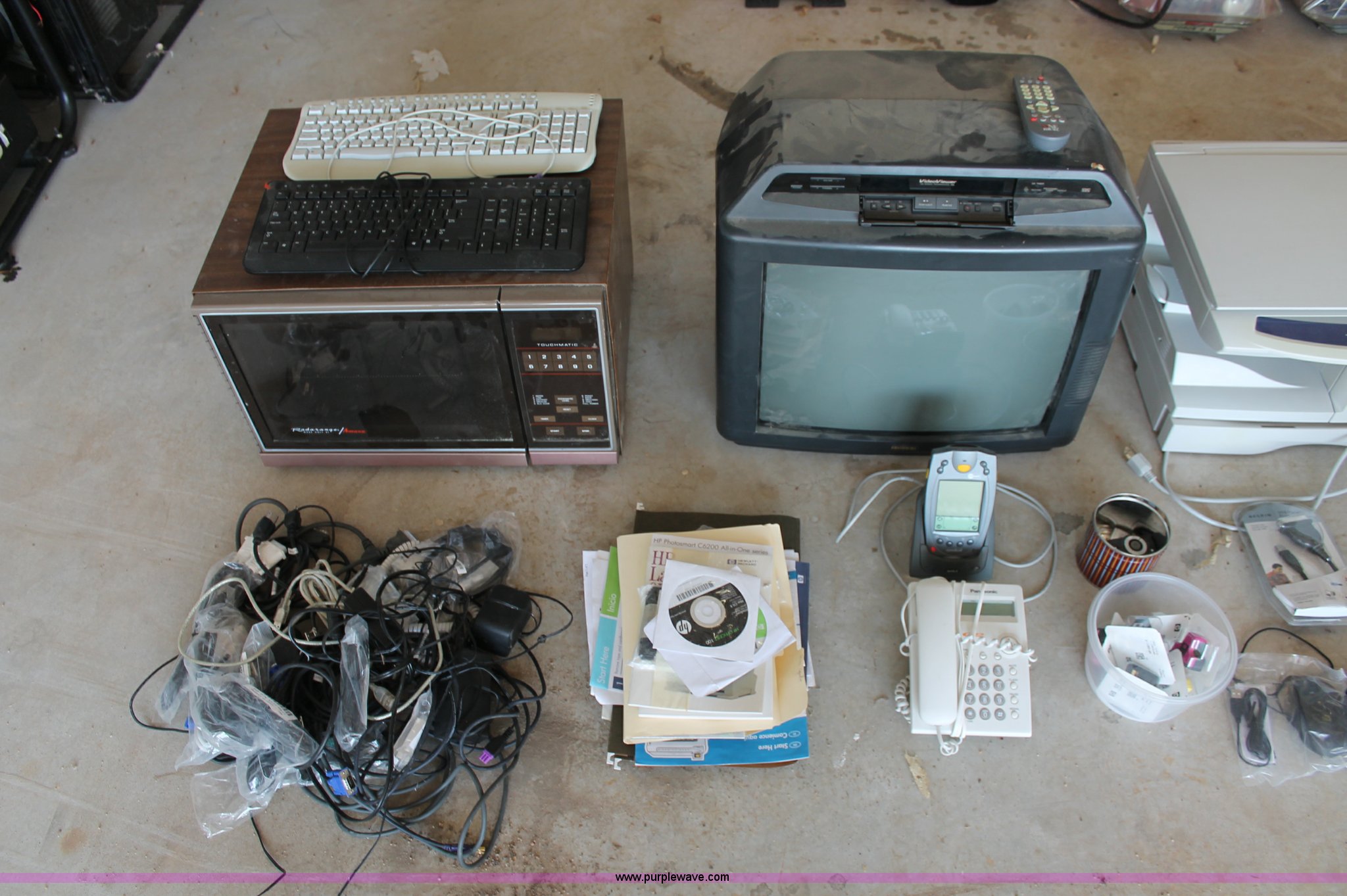 Purple Wave is selling a used Electronics in Kansas. This item is a Assorted electronics with the following: HP Photosmart C6280 All-in-One printer/scanner/copier, Brother HL-2040 laser printer, HP 1250 fax machine, HP DeskJet D4260 printer, Samsung CLP-K6608 toner, Zetron 15B multi-format encoder, Sharp AR-153E printer/scanner/copier, (3) computer mice, (6) HP "02" series ink cartridges, Belkin USB parallel printer adapter, Quasar TV/VCR combo, Radarange Amana microwave, (2) keyboards, Assorted cables, Plus more