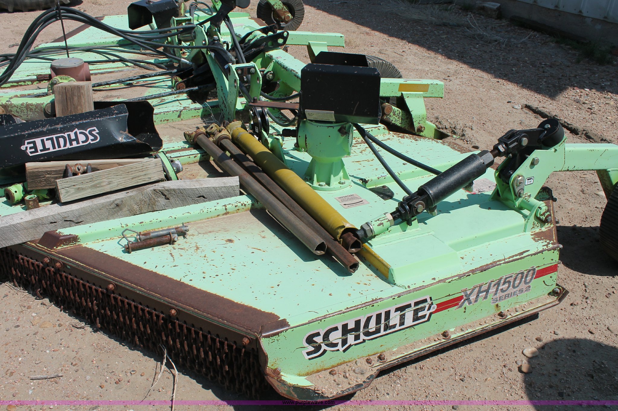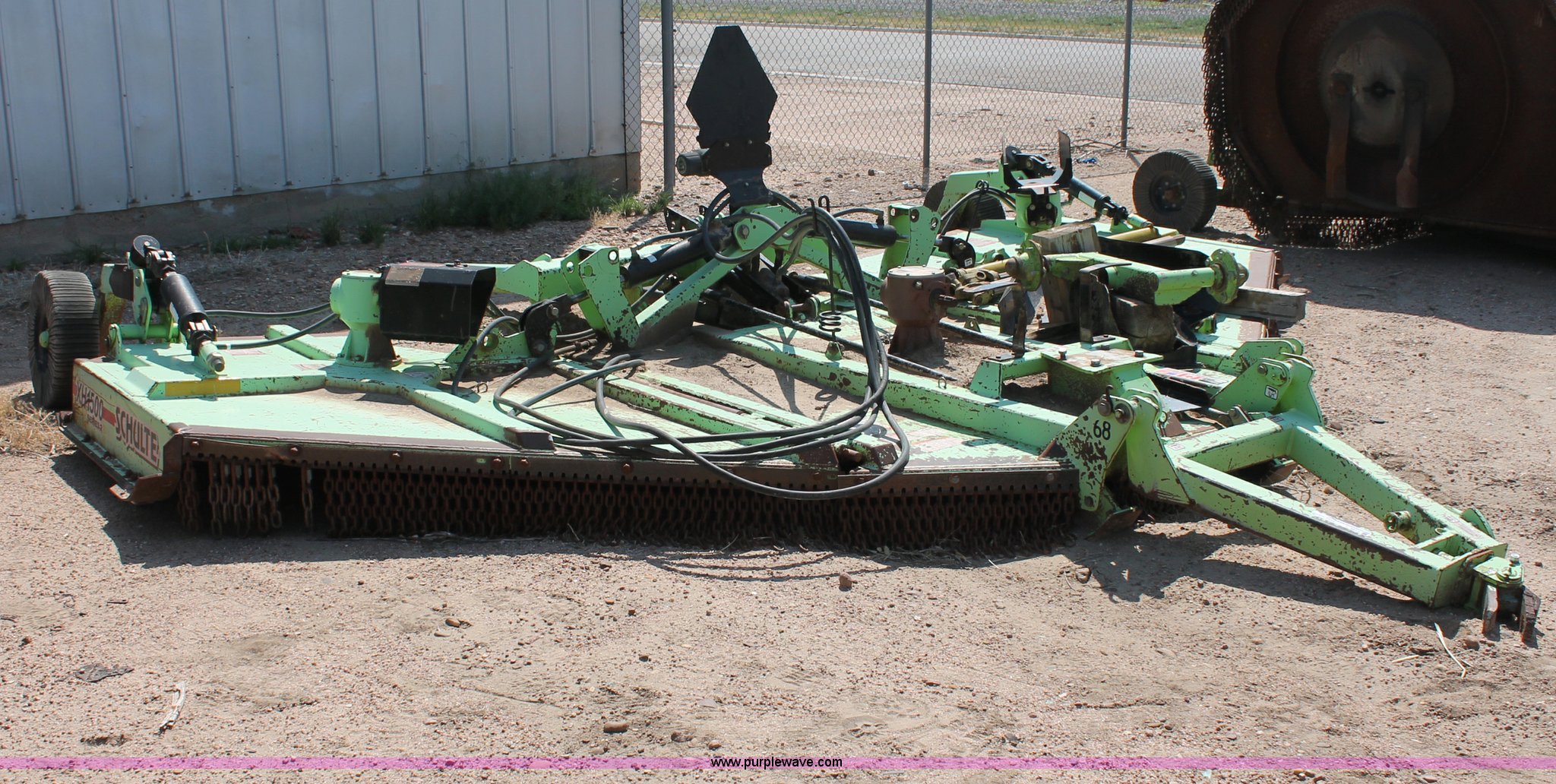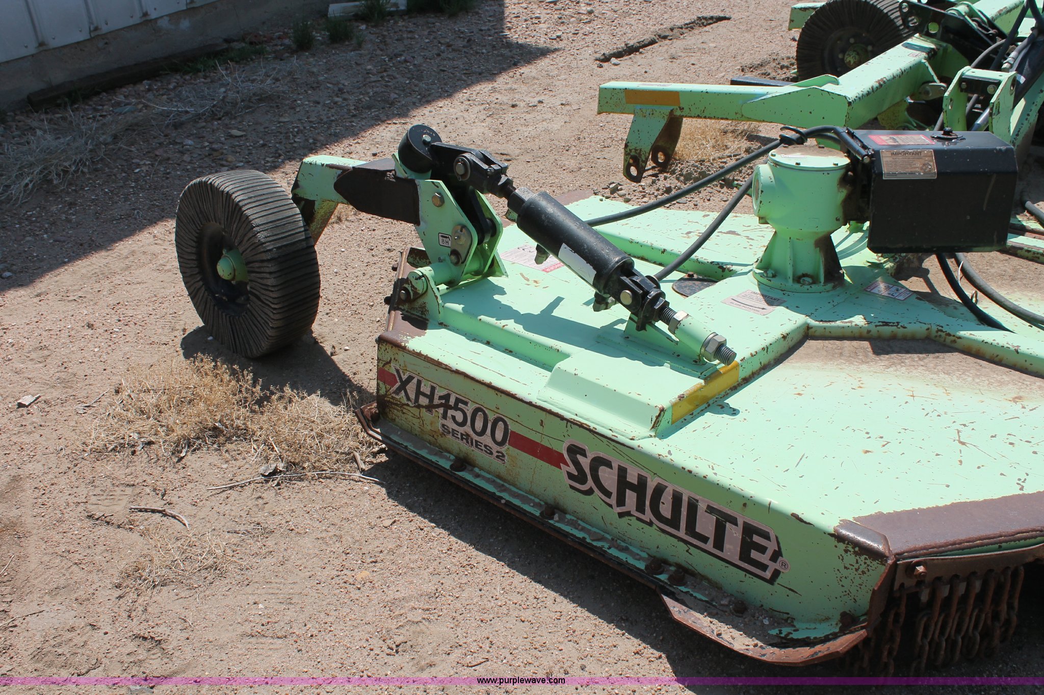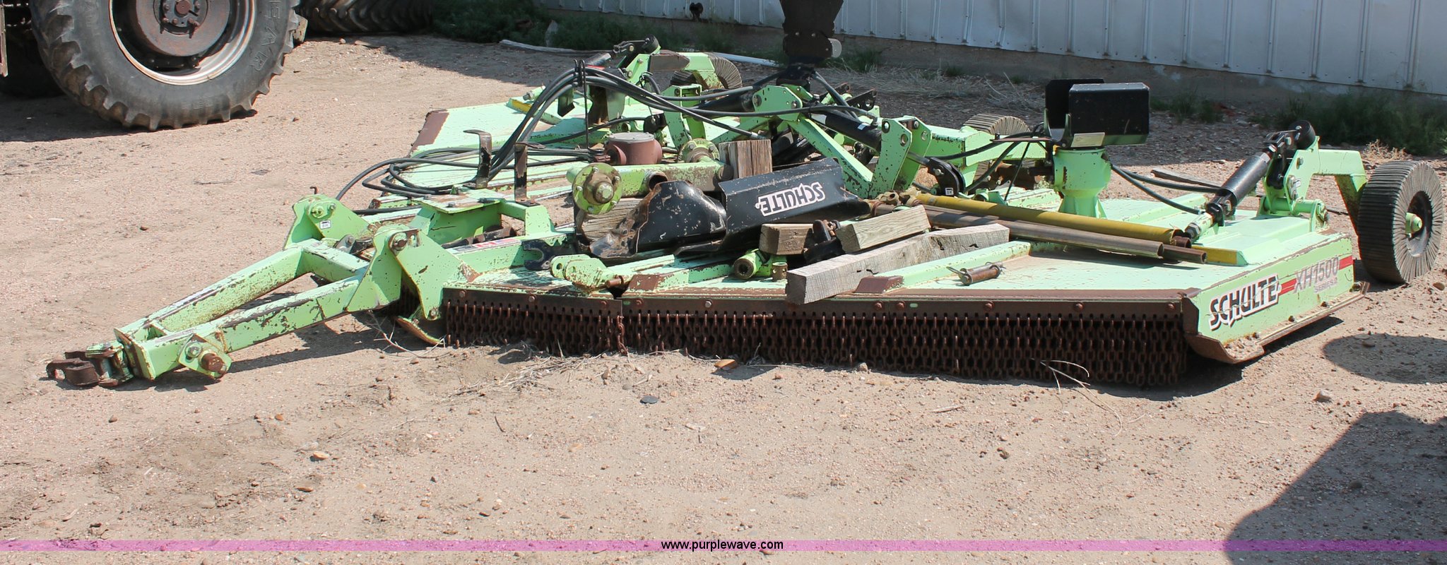 Purple Wave is selling a used Mower, Cutter, Shredder in Kansas. This item is a Schulte XH1500 rotary mower with the following: 15' cutting surface, Hydraulic folding wings, Hydraulic deck lift, 540 PTO, Pin hitch, Safety chains, Parts only, Serial C30102911407