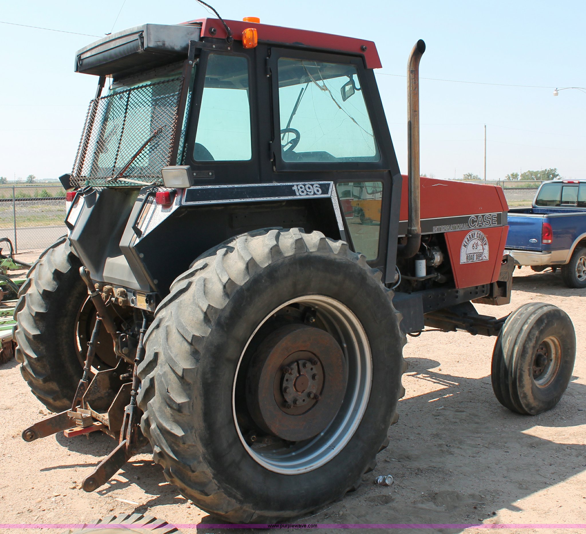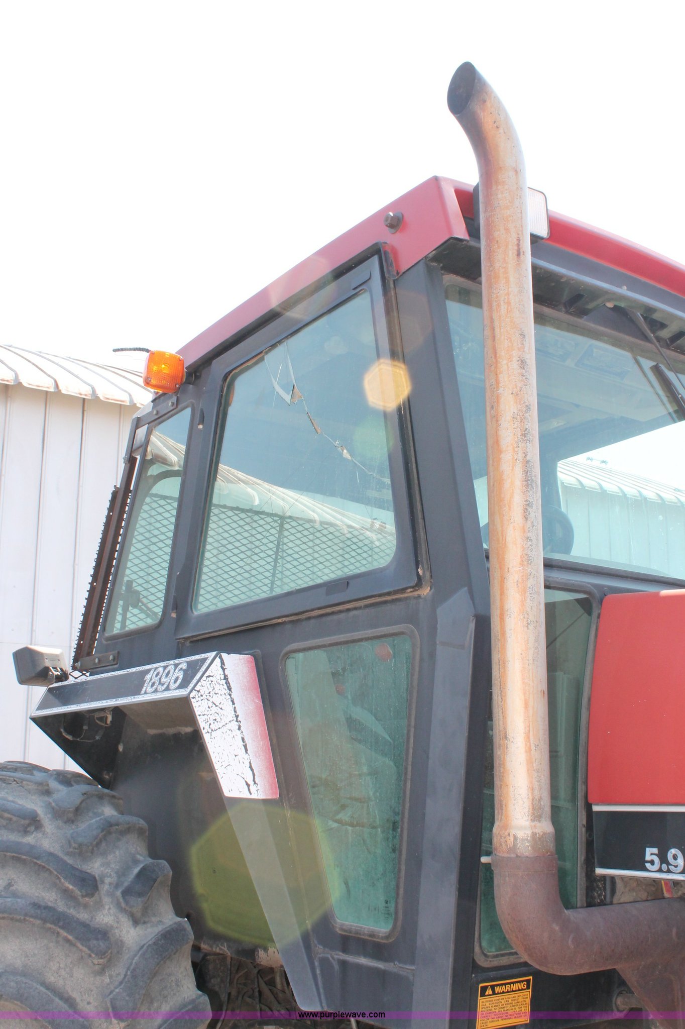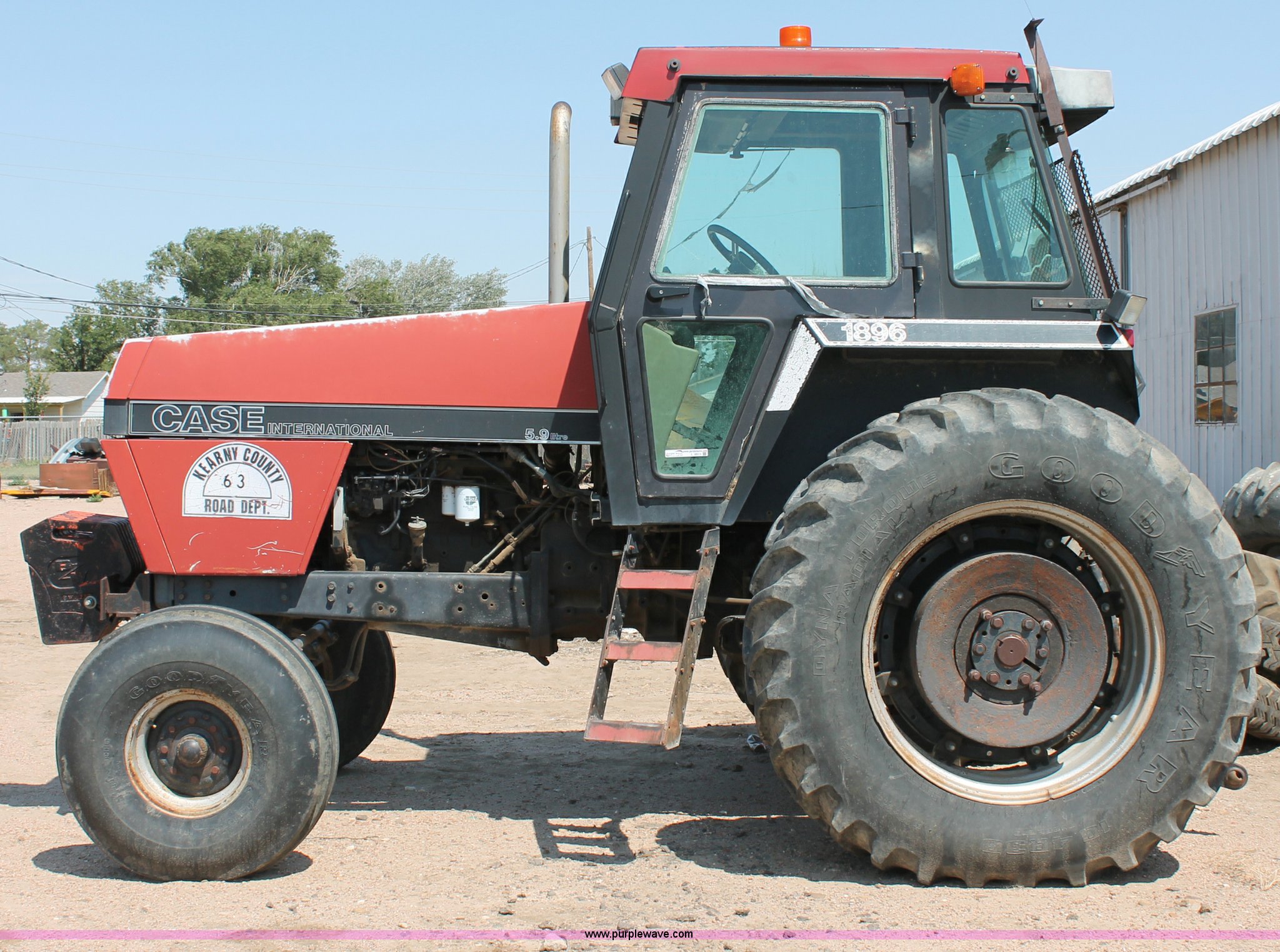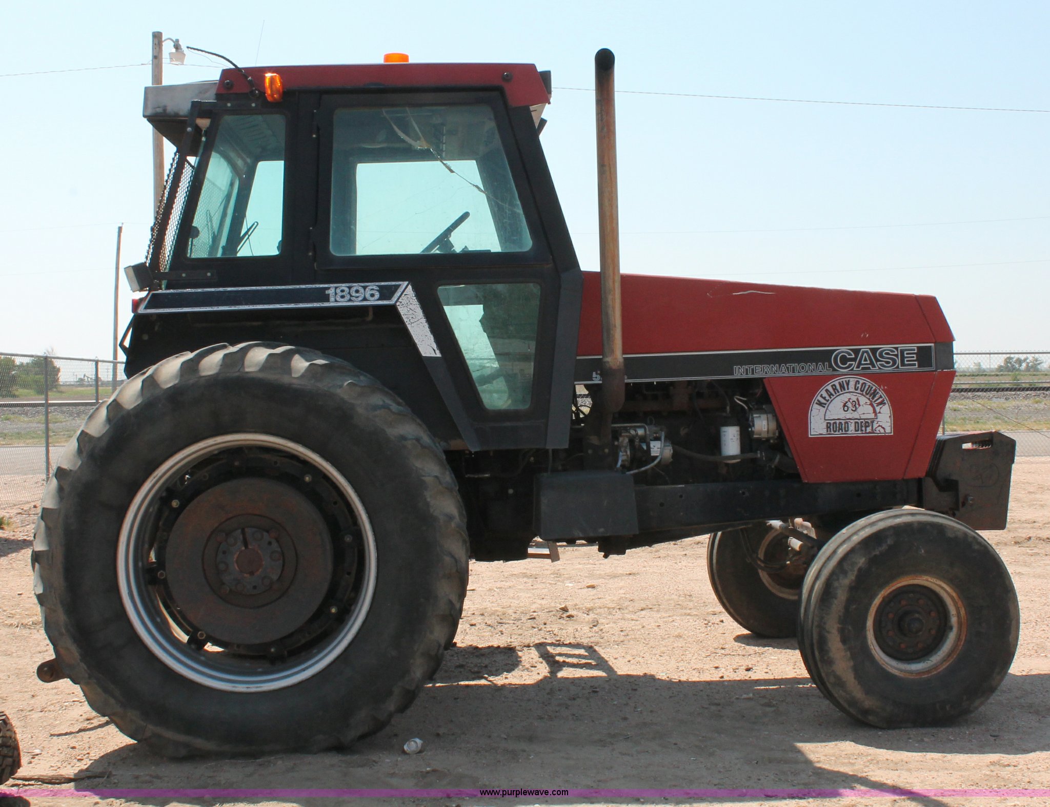 Purple Wave is selling a used Tractor in Kansas. This item is a 1987 Case IH Harvester 1896 tractor with the following: 7,366 hours on meter, Case 6T-590 5.9L six cylinder turbo diesel engine, Serial 21018385, Partial powershift transmission, 12F-3R gears, Unknown transmission issues, Differential lock, ROPS, Serial 17987501, AC and heat, AC blows warm, AM/FM/Cassette, Spring seat, Three point, Draw bar, 540/1000 PTO, Front and rear hydraulic remotes, (7) suitcase weights, Rear wheel weights, 108" wheelbase, Goodyear 11.00-16 front tires, Goodyear 18.4R38 rear tires, 13,495 lbs. base operating weight, Cracked glass, Unknown transmission issues, Serial 17895260