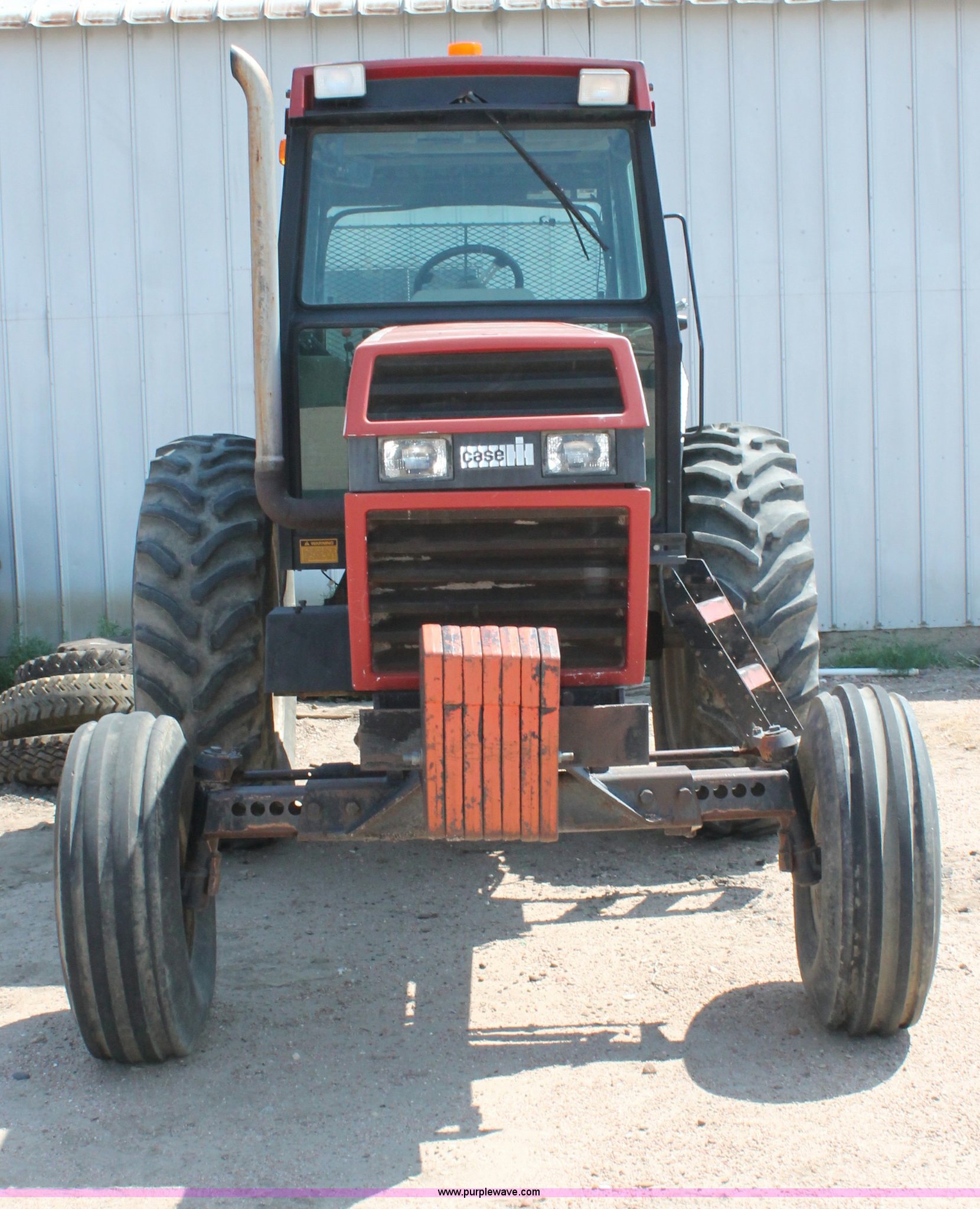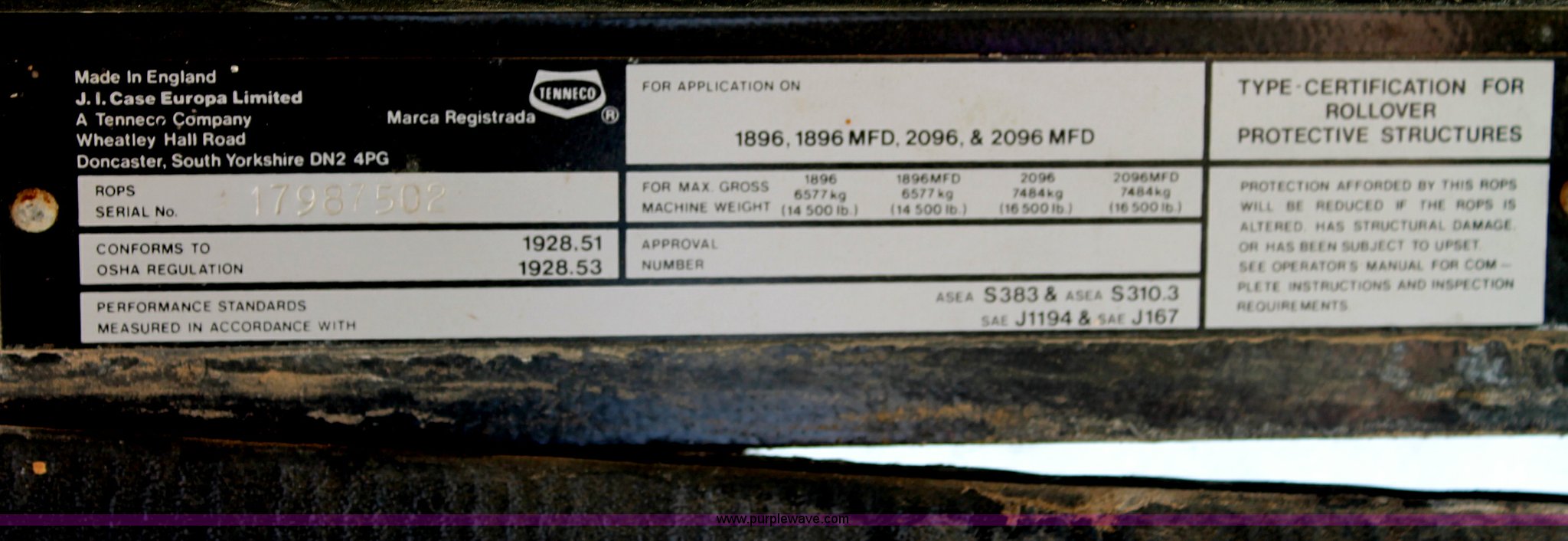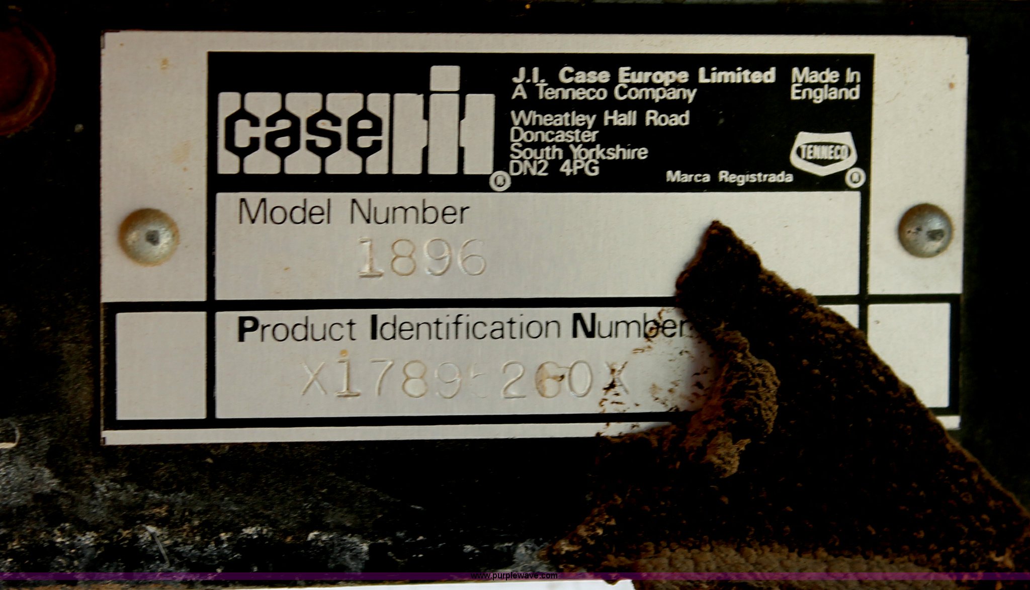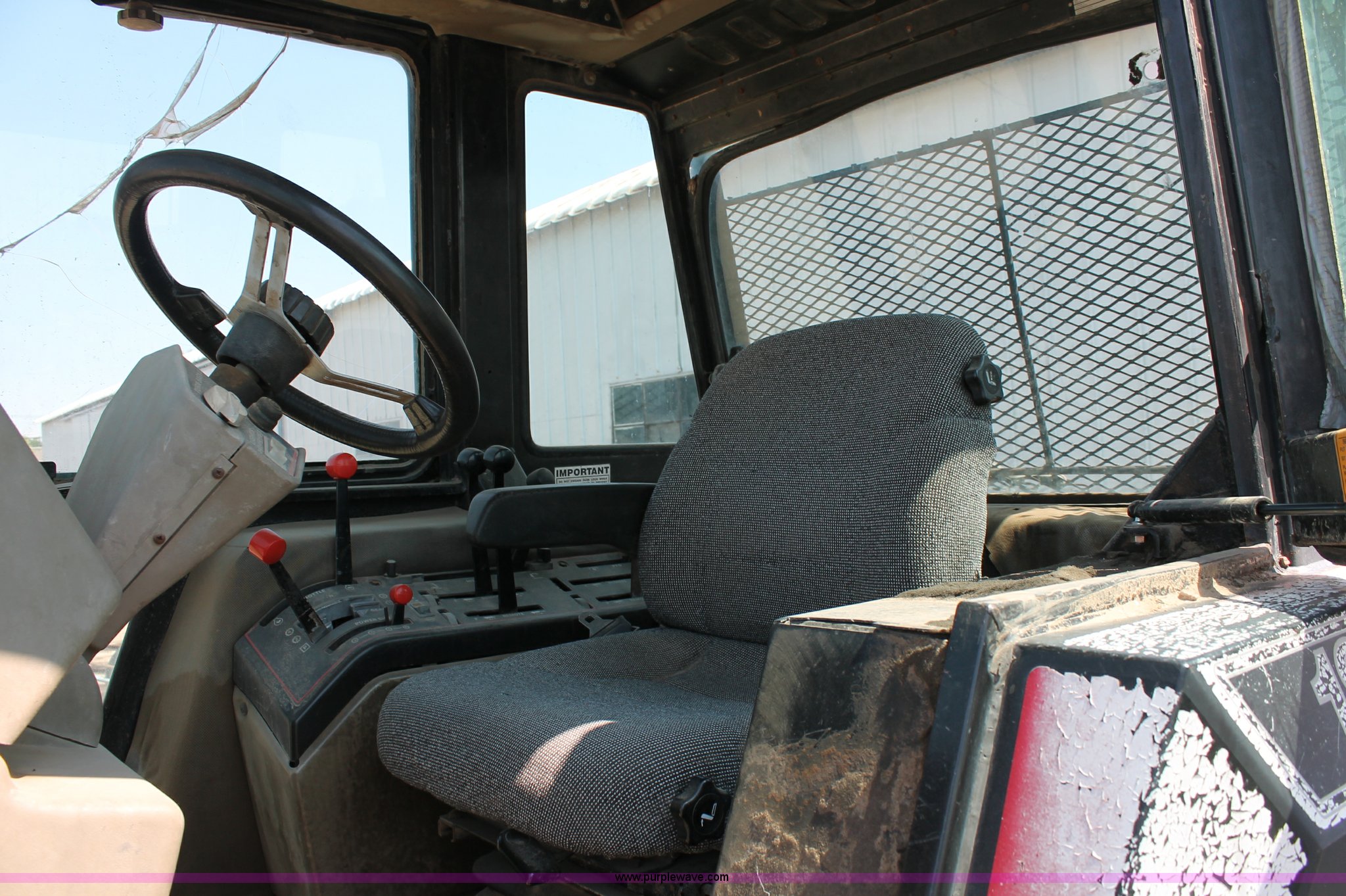 Purple Wave is selling a used Tractor in Kansas. This item is a 1987 Case IH Harvester 1896 tractor with the following: 7,366 hours on meter, Case 6T-590 5.9L six cylinder turbo diesel engine, Serial 21018385, Partial powershift transmission, 12F-3R gears, Unknown transmission issues, Differential lock, ROPS, Serial 17987501, AC and heat, AC blows warm, AM/FM/Cassette, Spring seat, Three point, Draw bar, 540/1000 PTO, Front and rear hydraulic remotes, (7) suitcase weights, Rear wheel weights, 108" wheelbase, Goodyear 11.00-16 front tires, Goodyear 18.4R38 rear tires, 13,495 lbs. base operating weight, Cracked glass, Unknown transmission issues, Serial 17895260