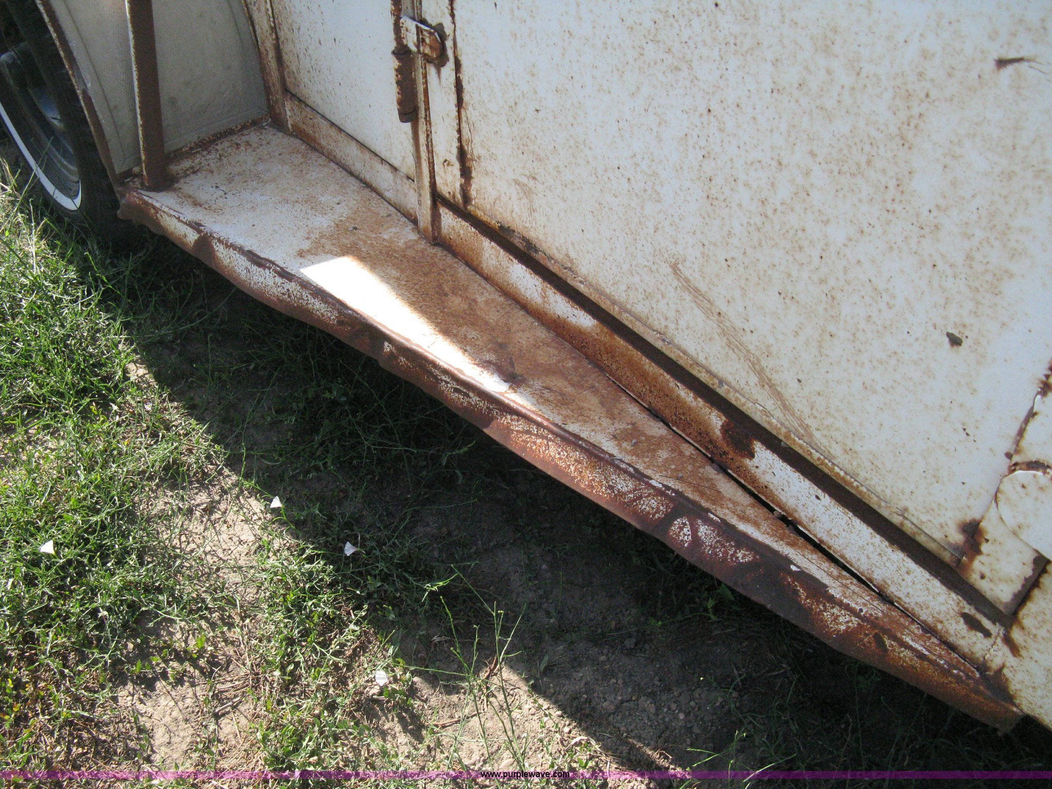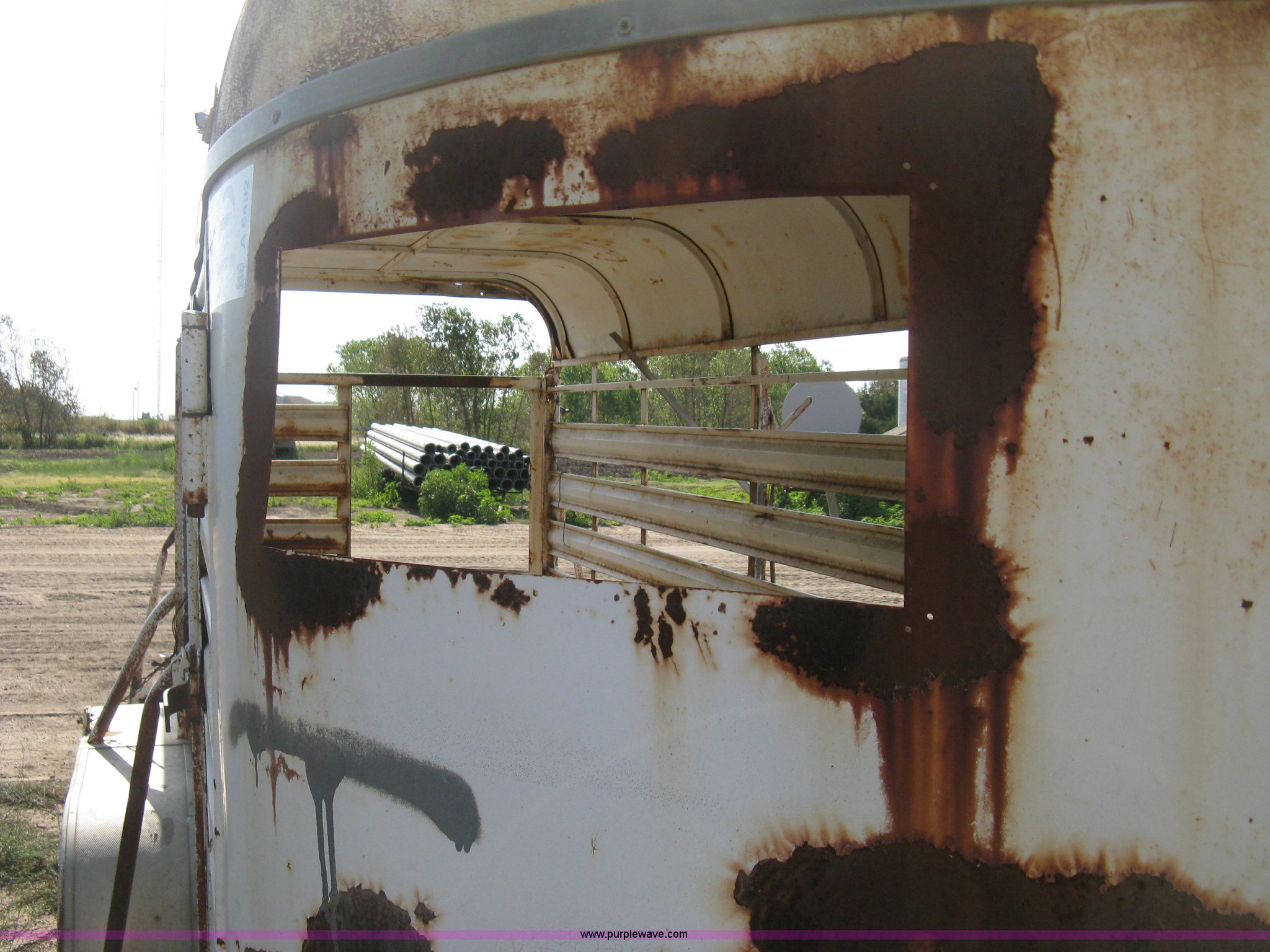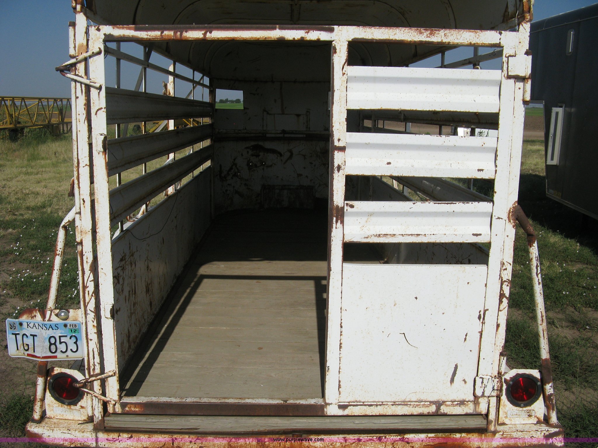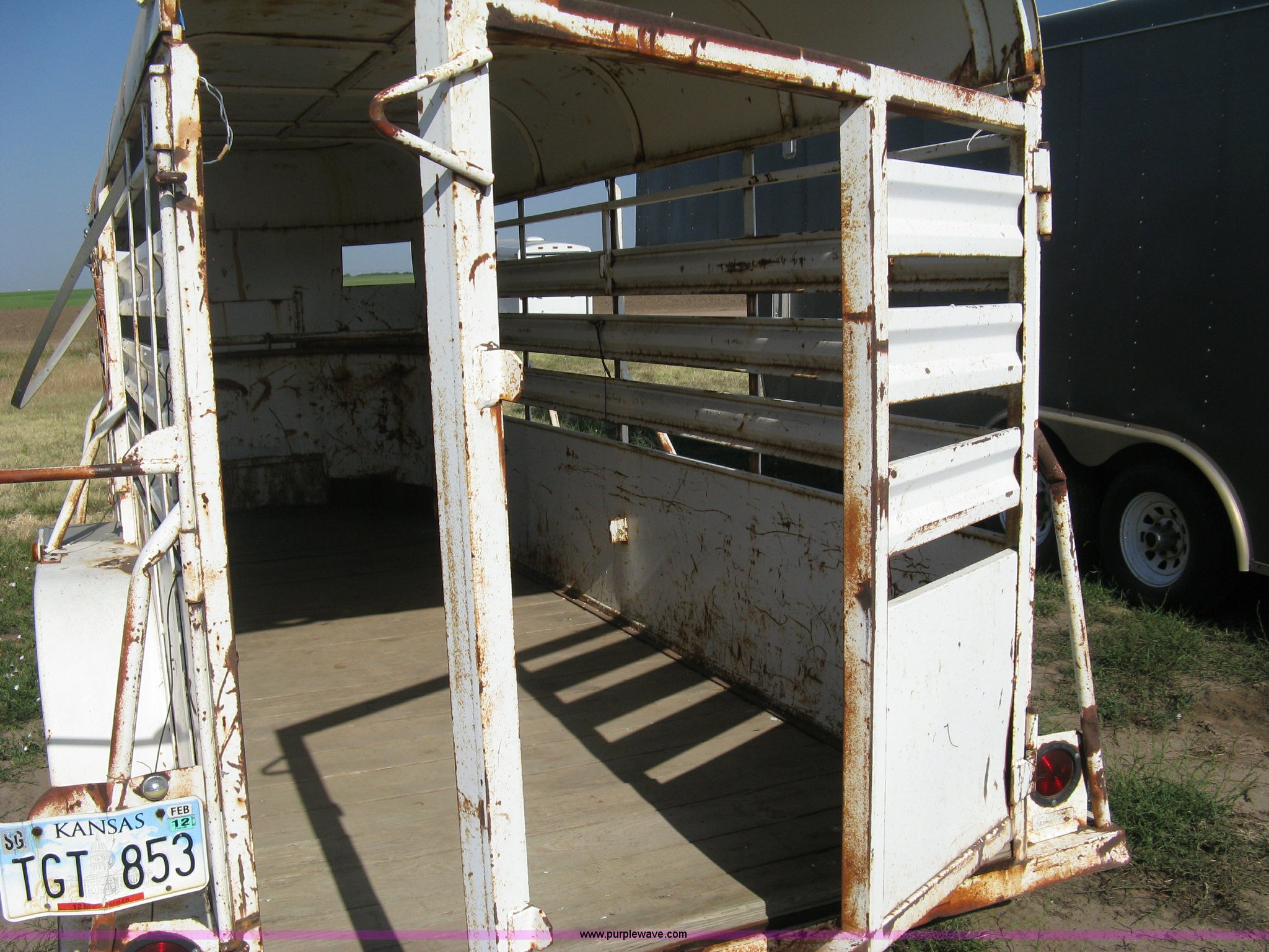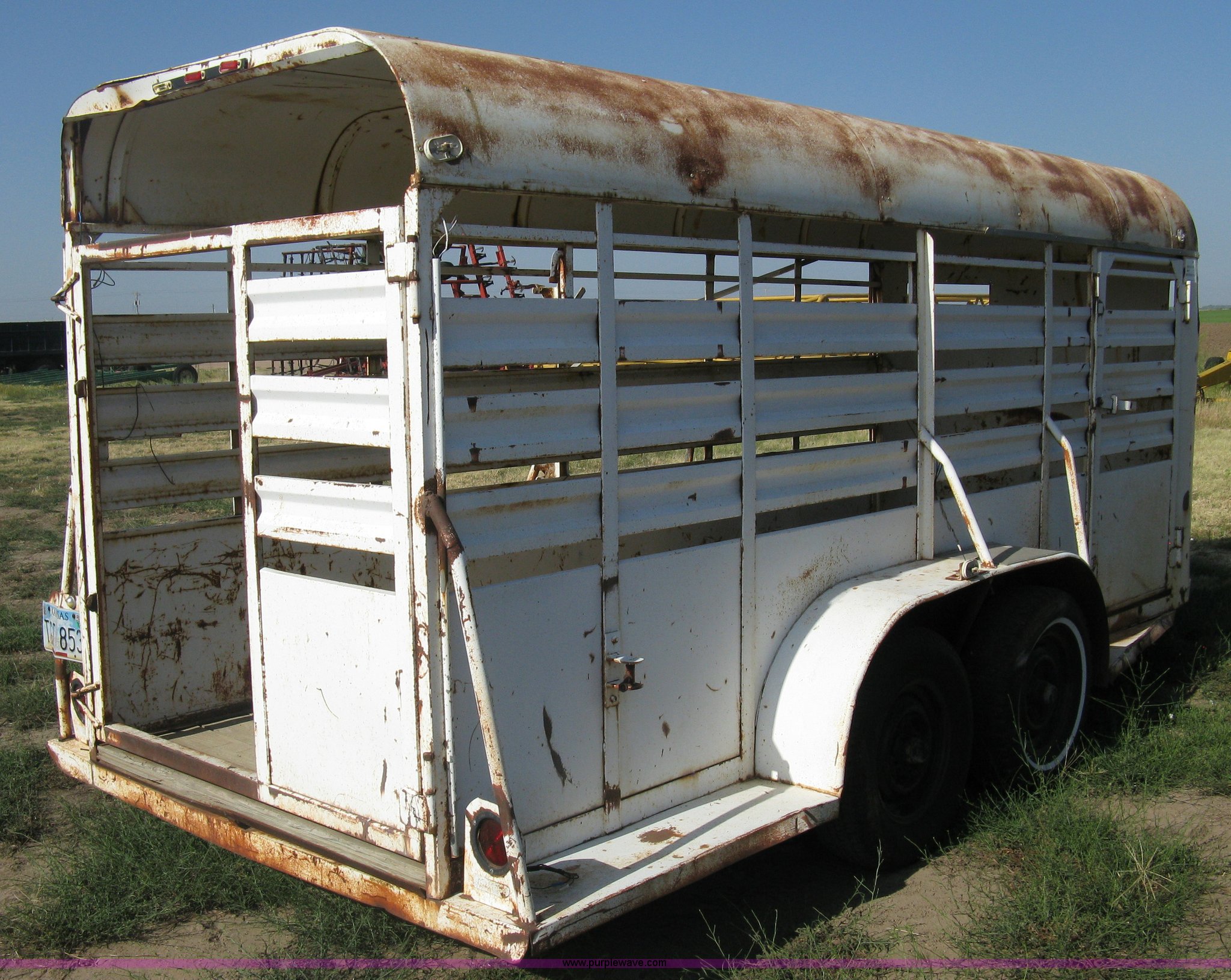 Purple Wave is selling a used Livestock Trailer in Kansas. This item is a 1978 Hale tandem axle stock trailer with the following: 16'L x 5'W, Side escape gate, Full rear gate, Missing slide gate, Wood floor, Trailer lights, Missing truck plug-in, 2" ball hitch, 15" wheels, six lug, Exterior body damage