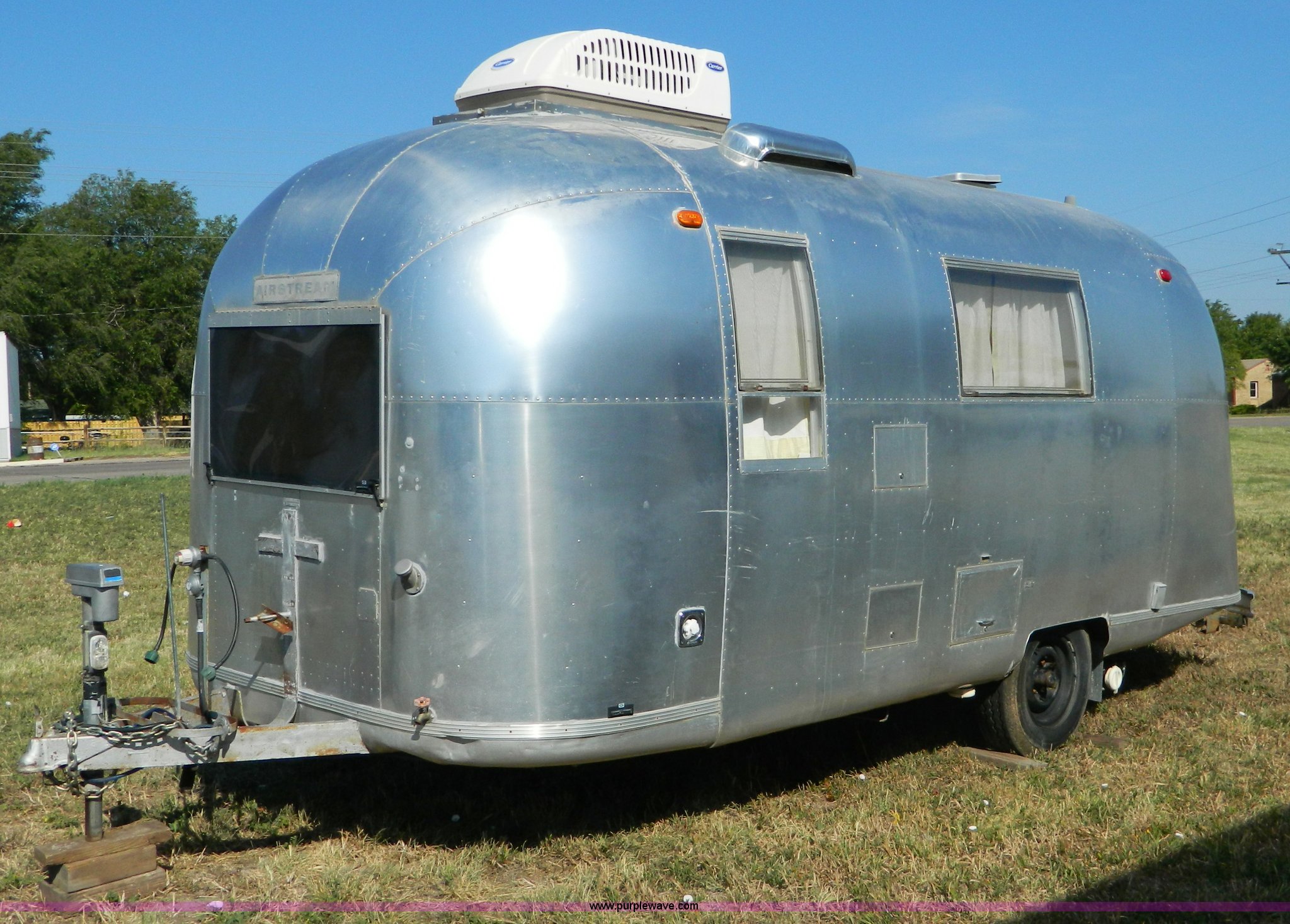 Purple Wave is selling a used RV in Kansas. This item is a 1966 Airstream Globe Trotter 20' camper with the following: Fresh water tank upgraded to 30 gallon, Gray water tank added, Recently replaced water pump and street water hookup, Recently replaced double door refrigerator, Recently replaced cook top, Re-done upholstery on couches, AC added with heating capabilities, Furnace replaced to forced air unit, Recently replaced water hoses, Astro foil insulation in various areas, Recently replaced tile floor under carpet, Slide out extension table, Corning glass windows, (2) LP tanks included, Original manuals, Non-smoker, no pets, Hail dents showing