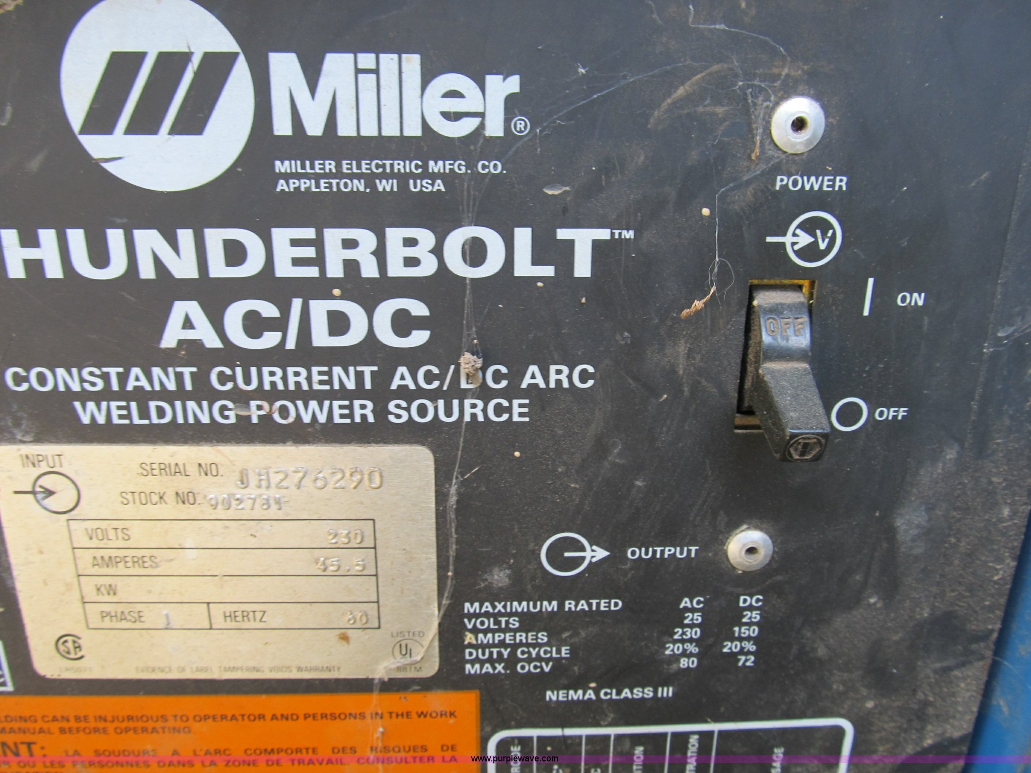 Purple Wave is selling a used Welder (Manual) in Missouri. This item is a Miller Thunderbolt AC/DC arc welder with the following: Constant current welding power source, 230V, single phase, 45.5 amps, 60 Hz, Positive and negative leads included, Stock No. 902781, Serial JH276290