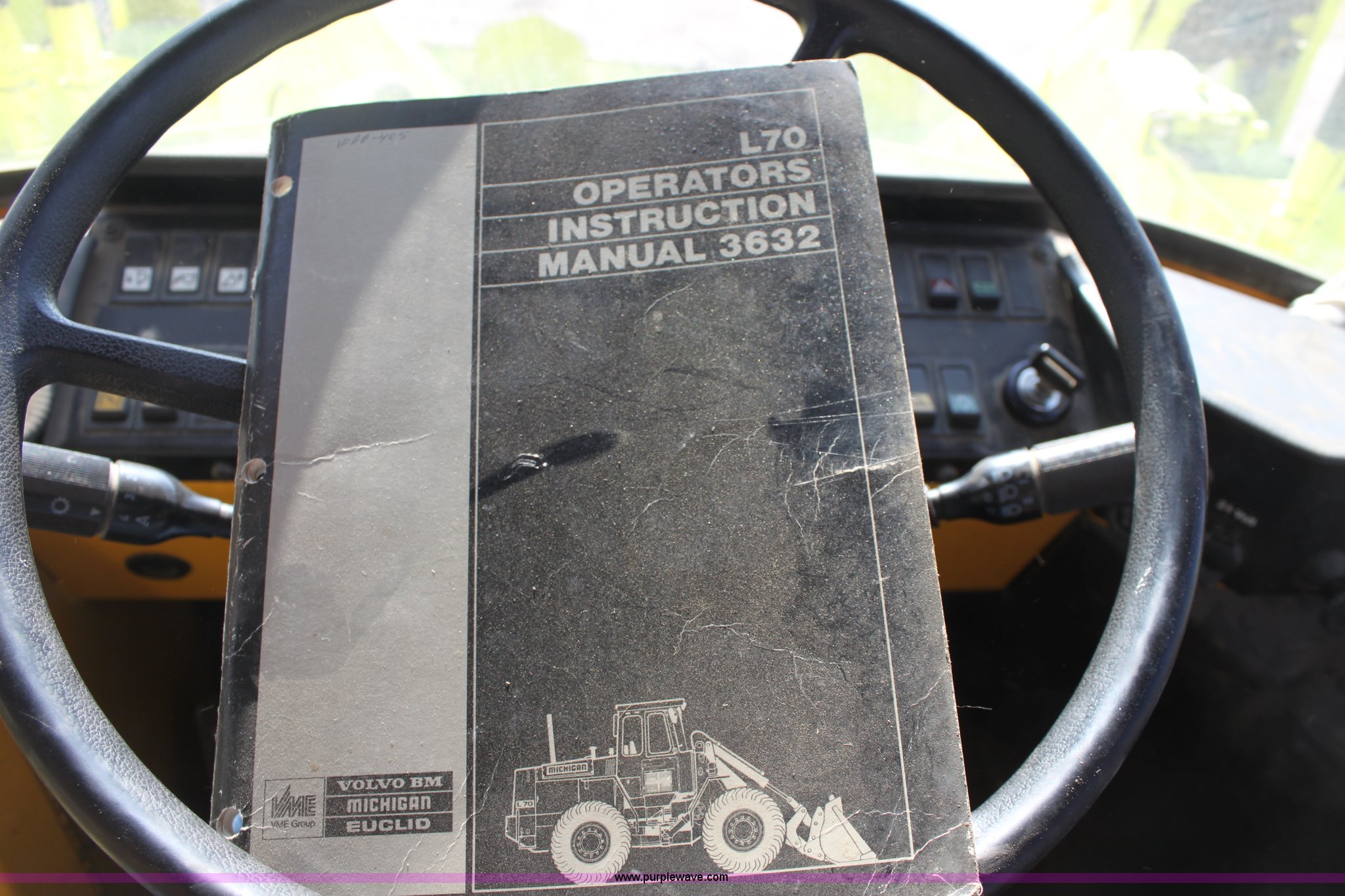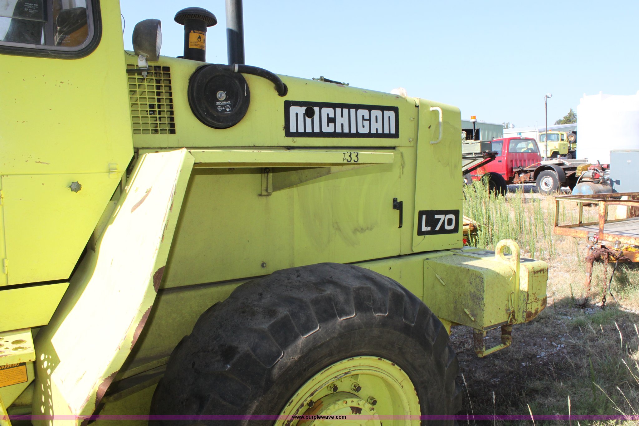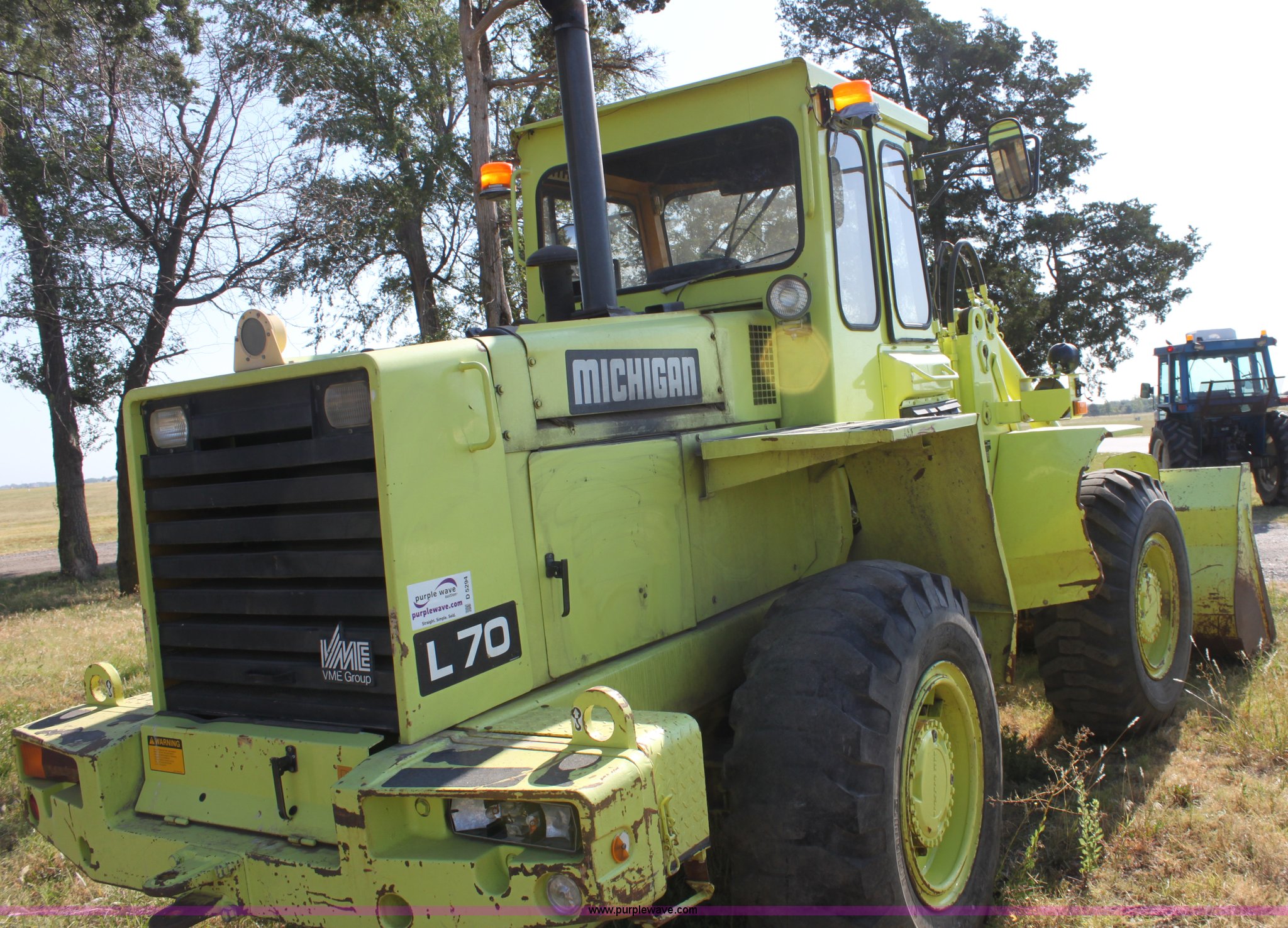 Purple Wave is selling a used Wheel Loader in Kansas. This item is a 1987 Michigan L70 wheel loader with the following: 3,566 hours on meter, International four cylinder diesel engine, Four speed shuttle shift transmission, Volvo ROPS, Serial 33120/60086, AC and heat, Suspension seat, Three stick loader controls, Front and rear work lights, Front windshield wiper, 93.5" loader bucket, Front mounted auxiliary hydraulics, Rear pin hitch, 17.5-25 tires, Serial 70/60084