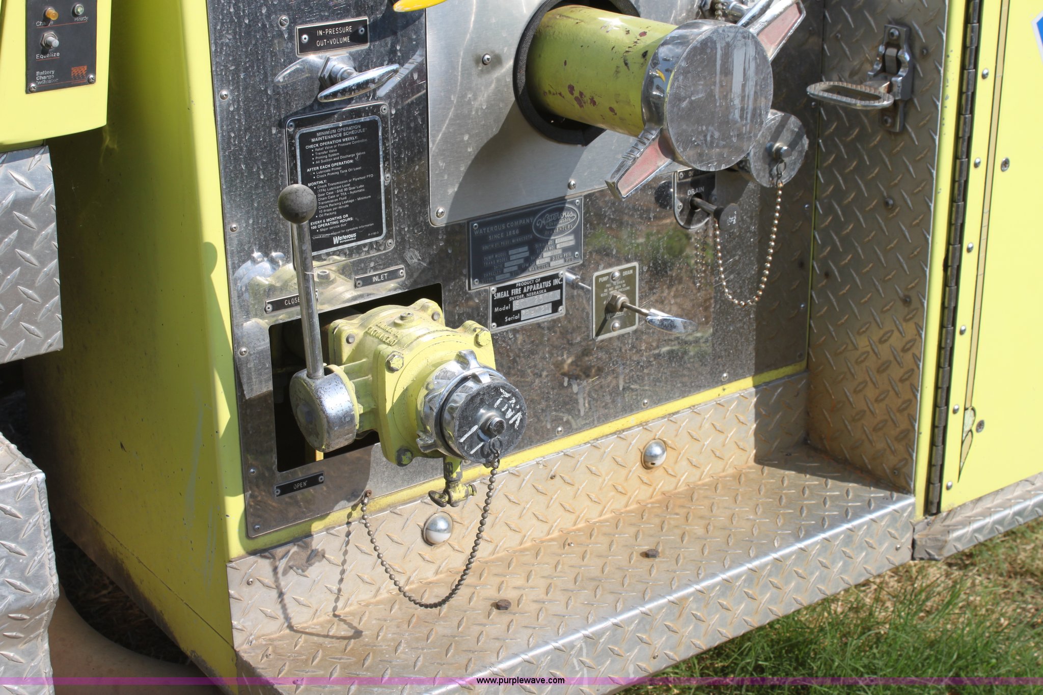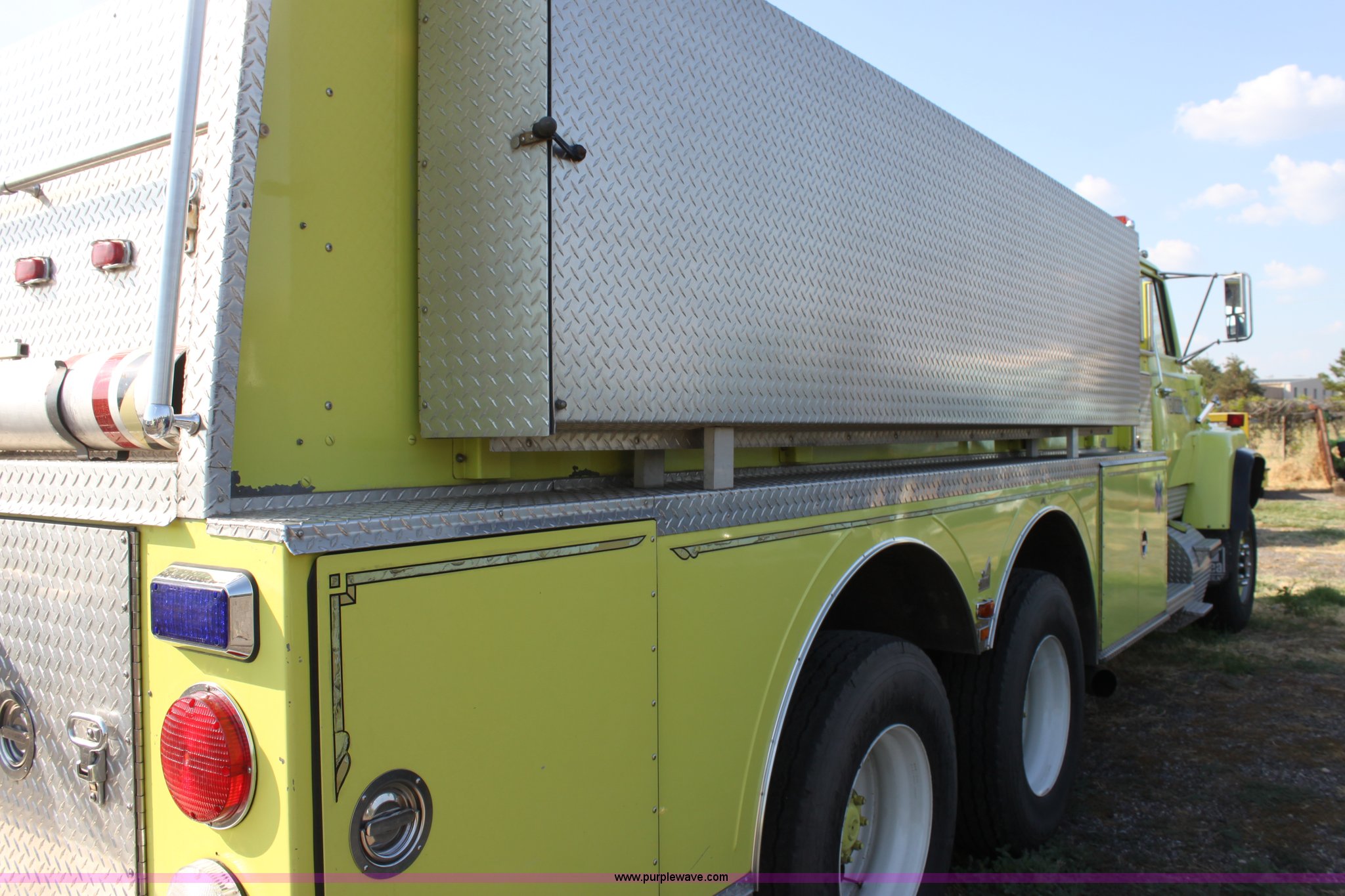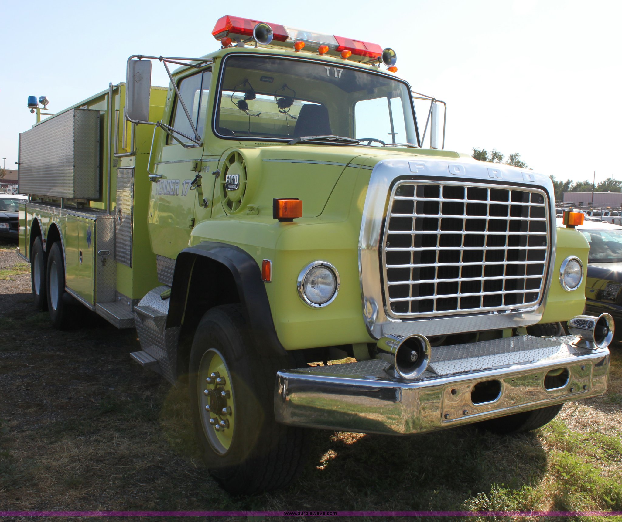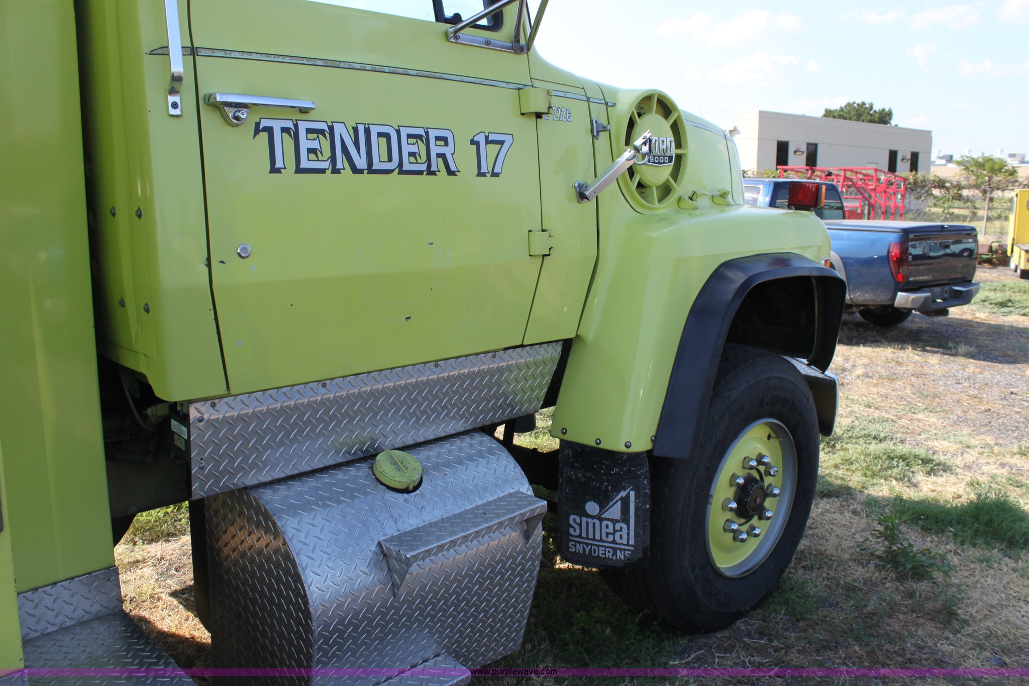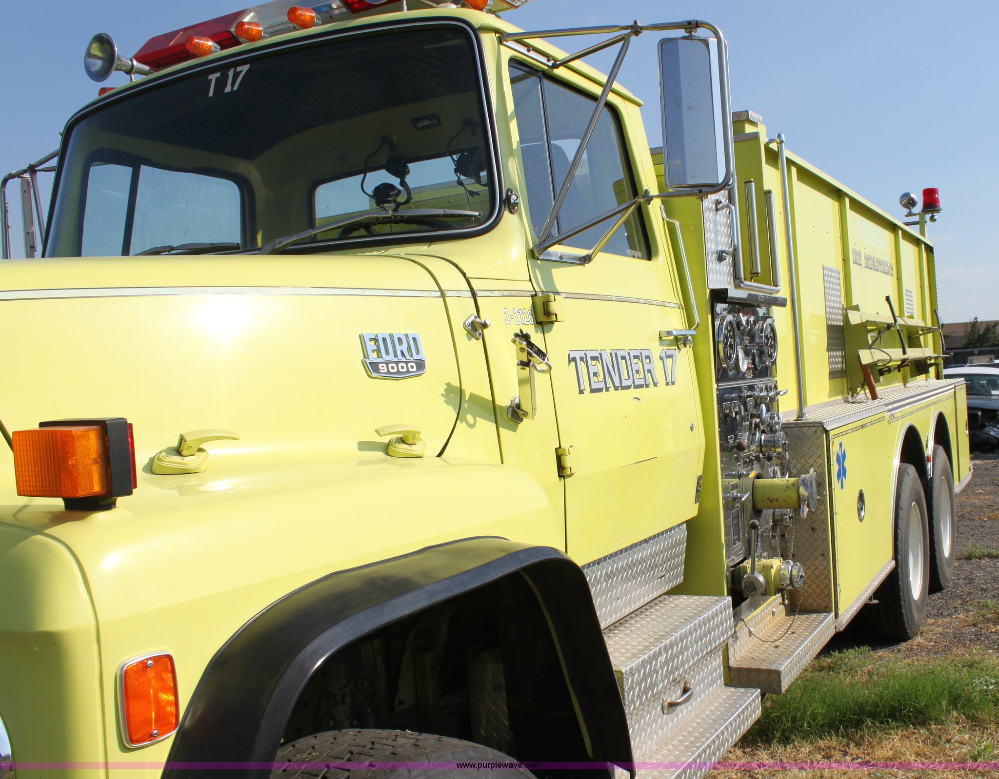 Purple Wave is selling a used Fire Truck or Emergency Vehicle in Kansas. This item is a 1983 Ford 9000 water tender truck with the following: 25,091 miles on odometer, 1,047 hours on meter, Detroit V8 diesel engine, Automatic transmission, Locking differential, Heat, Suspension seat, Firecom intercom system, Federal Signal PA controls, Smeal light controls, Waterous C-3 pump, 500 gpm at 150 PSIG, 6" rear discharge, Chelsea PTO, Air brakes, 12R22.5 tires, GVWR 60,000 lbs, FAWR 16,000 lbs, RAWR 22,000 lbs