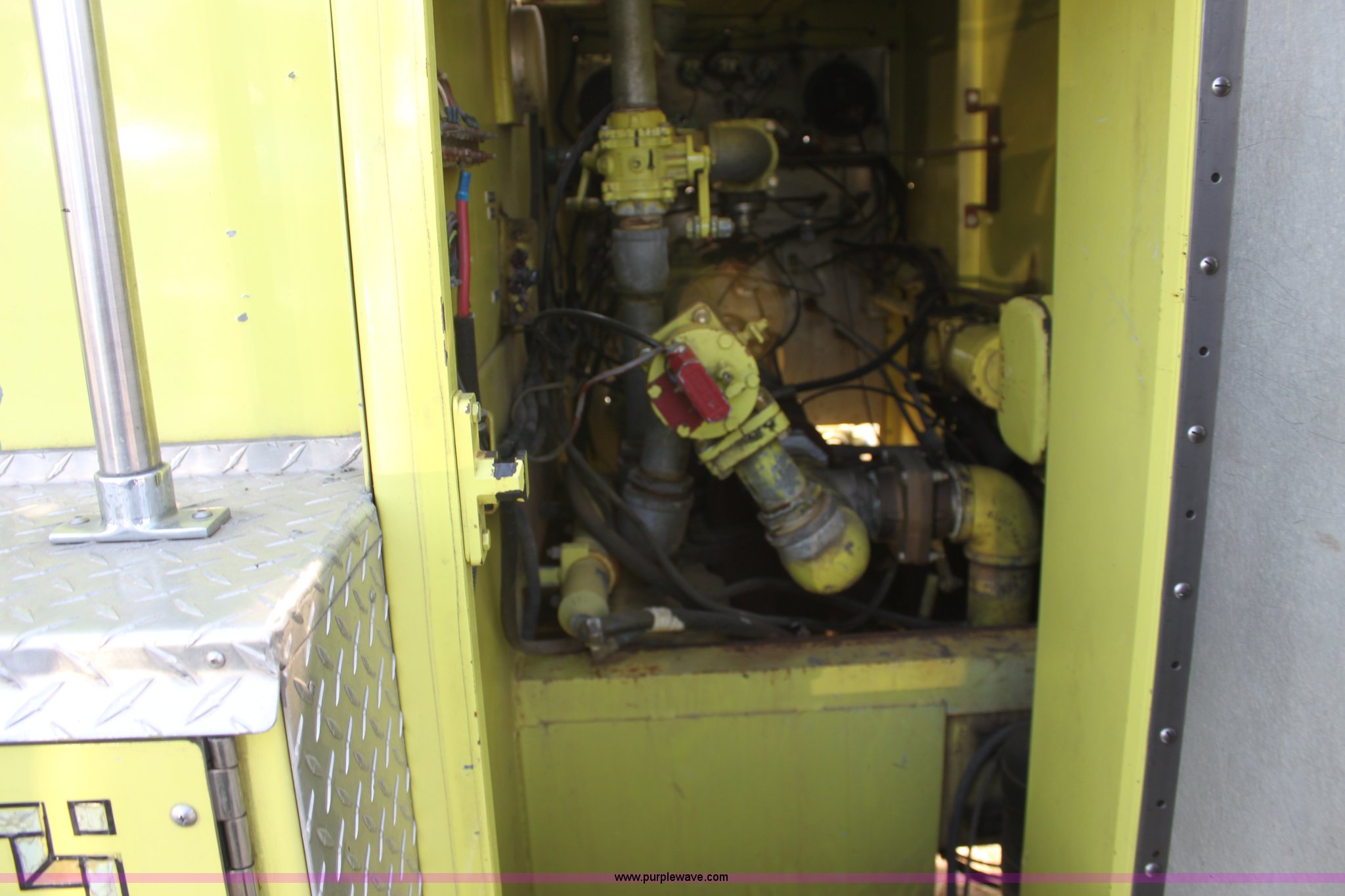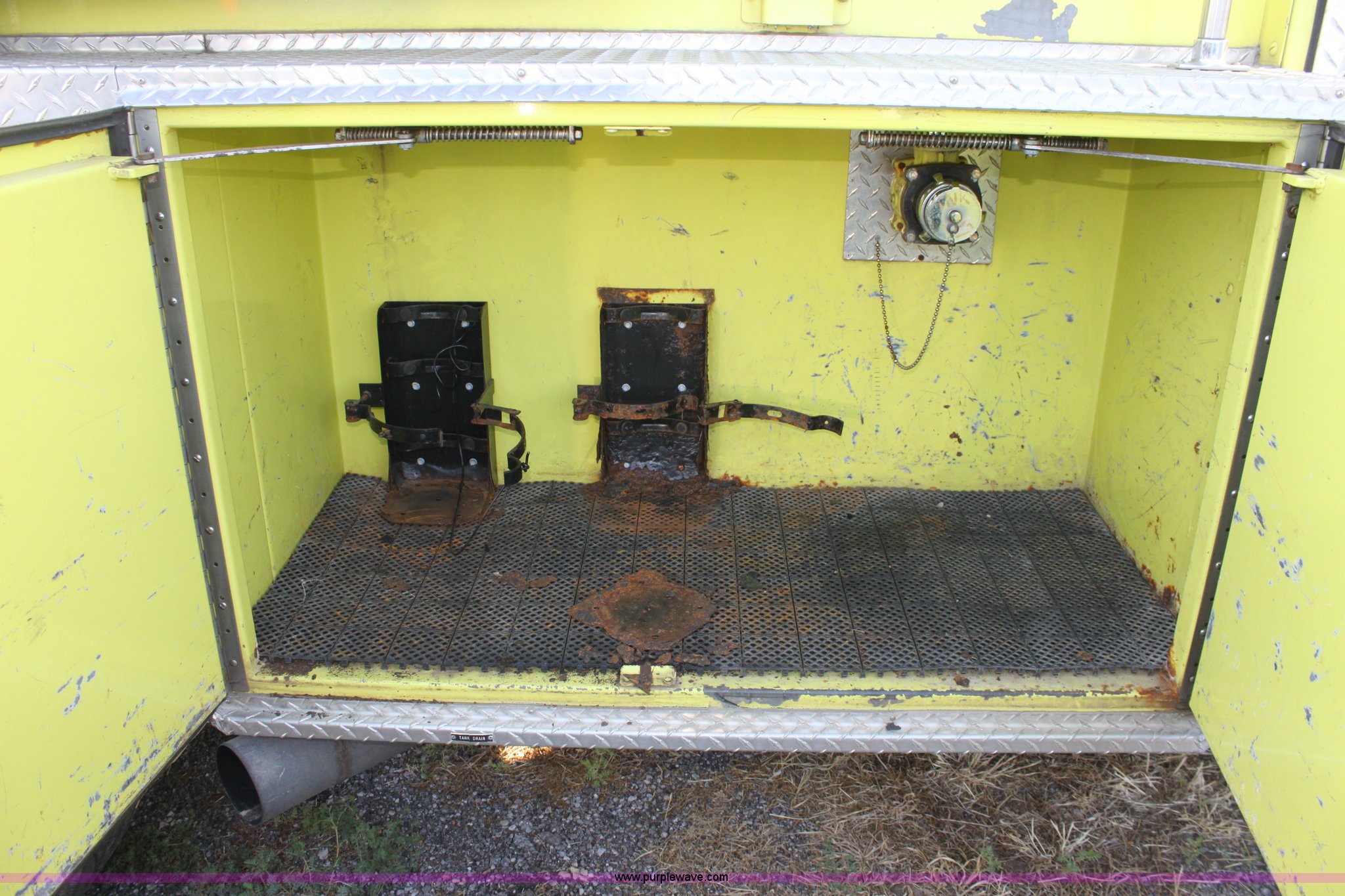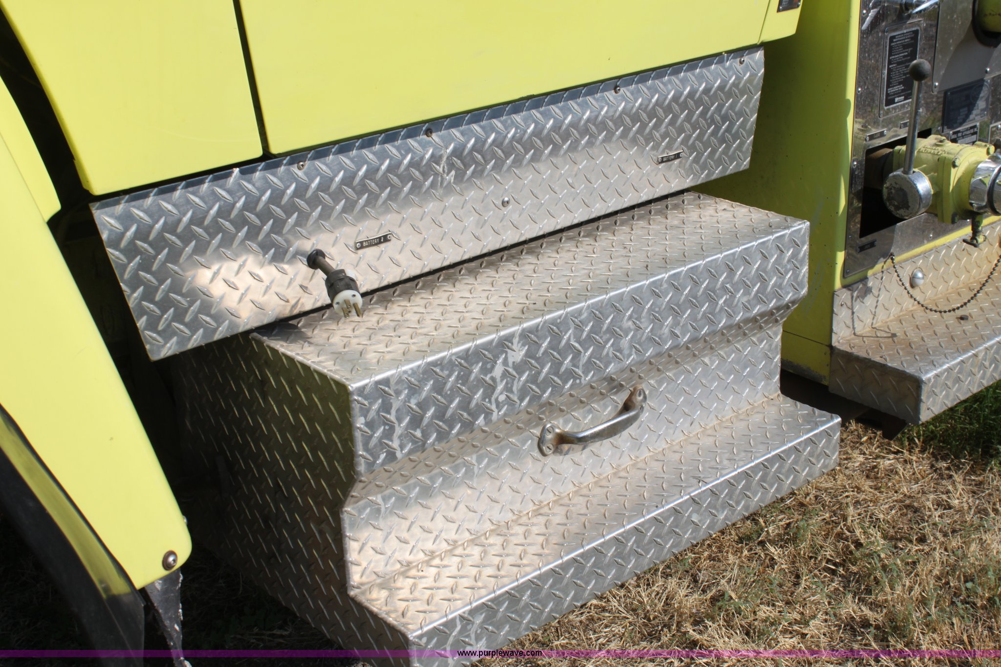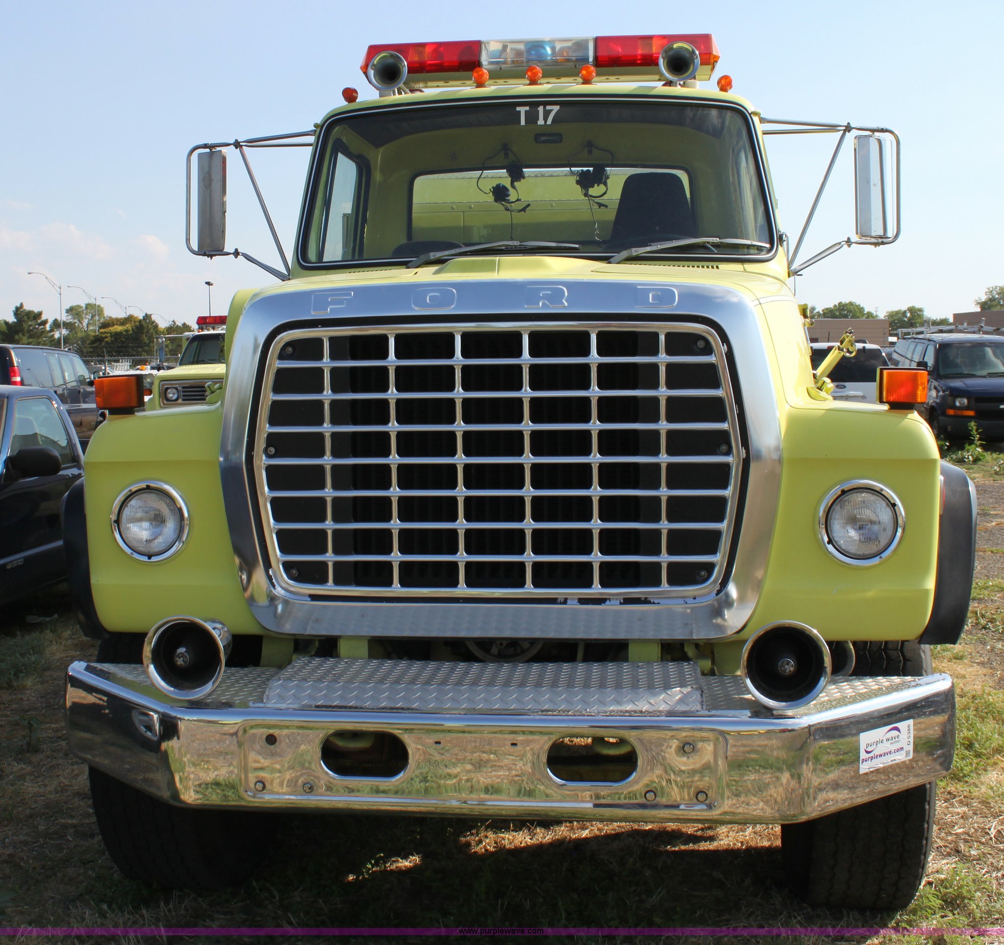 Purple Wave is selling a used Fire Truck or Emergency Vehicle in Kansas. This item is a 1983 Ford 9000 water tender truck with the following: 25,091 miles on odometer, 1,047 hours on meter, Detroit V8 diesel engine, Automatic transmission, Locking differential, Heat, Suspension seat, Firecom intercom system, Federal Signal PA controls, Smeal light controls, Waterous C-3 pump, 500 gpm at 150 PSIG, 6" rear discharge, Chelsea PTO, Air brakes, 12R22.5 tires, GVWR 60,000 lbs, FAWR 16,000 lbs, RAWR 22,000 lbs