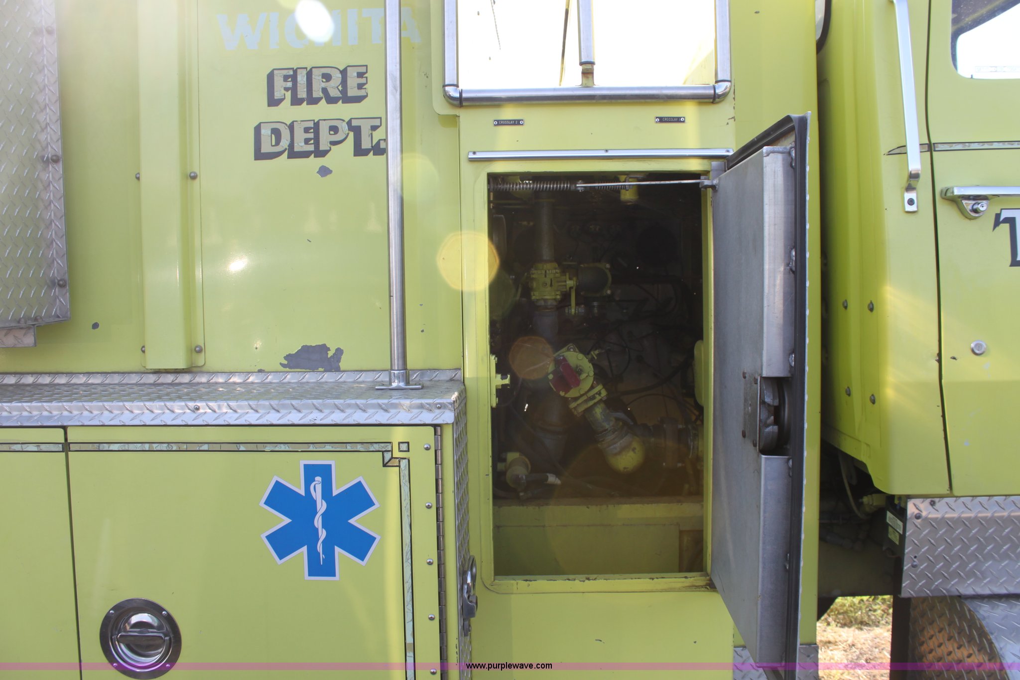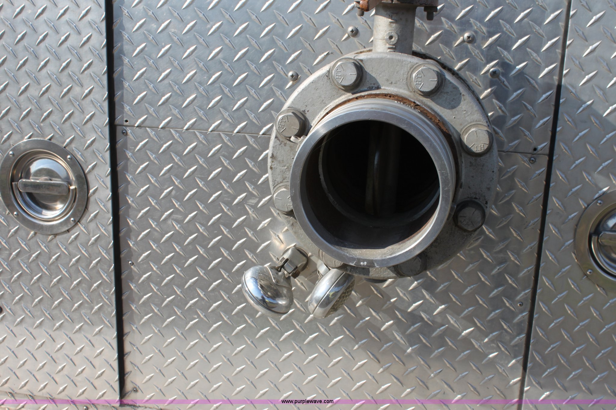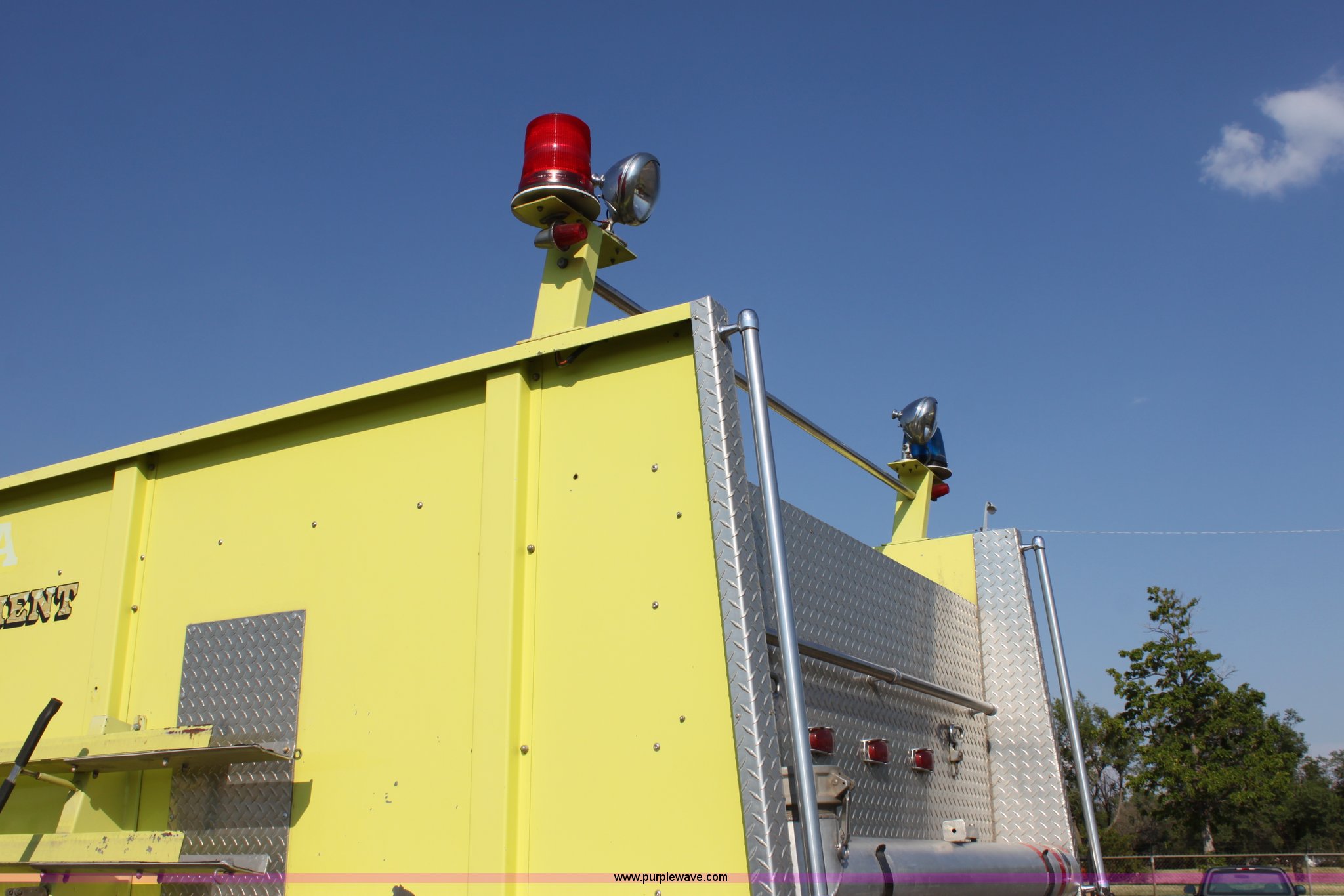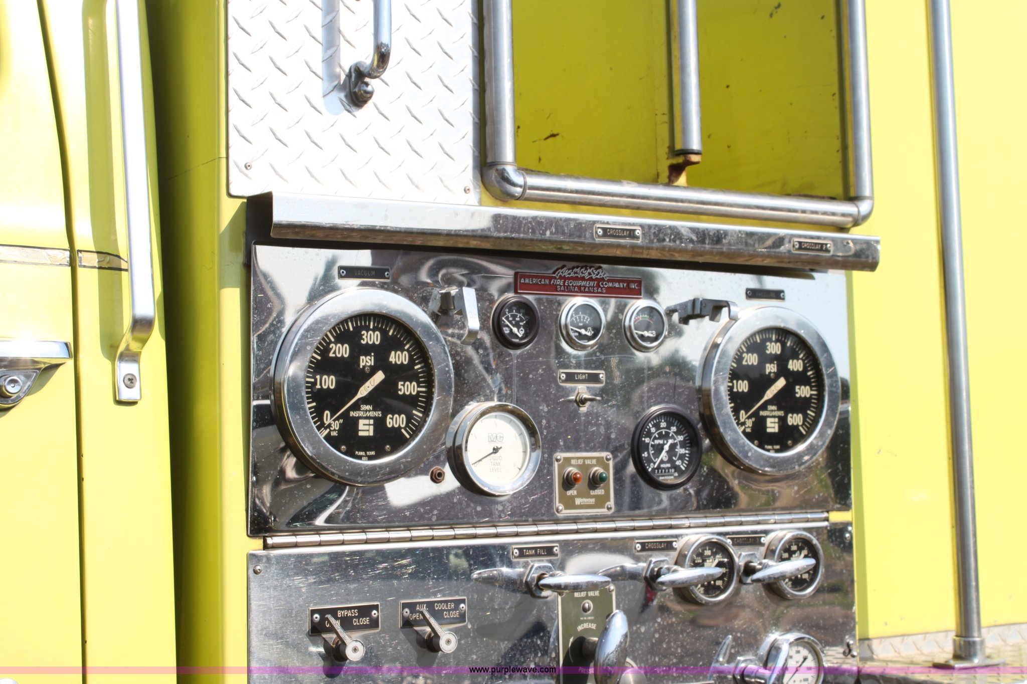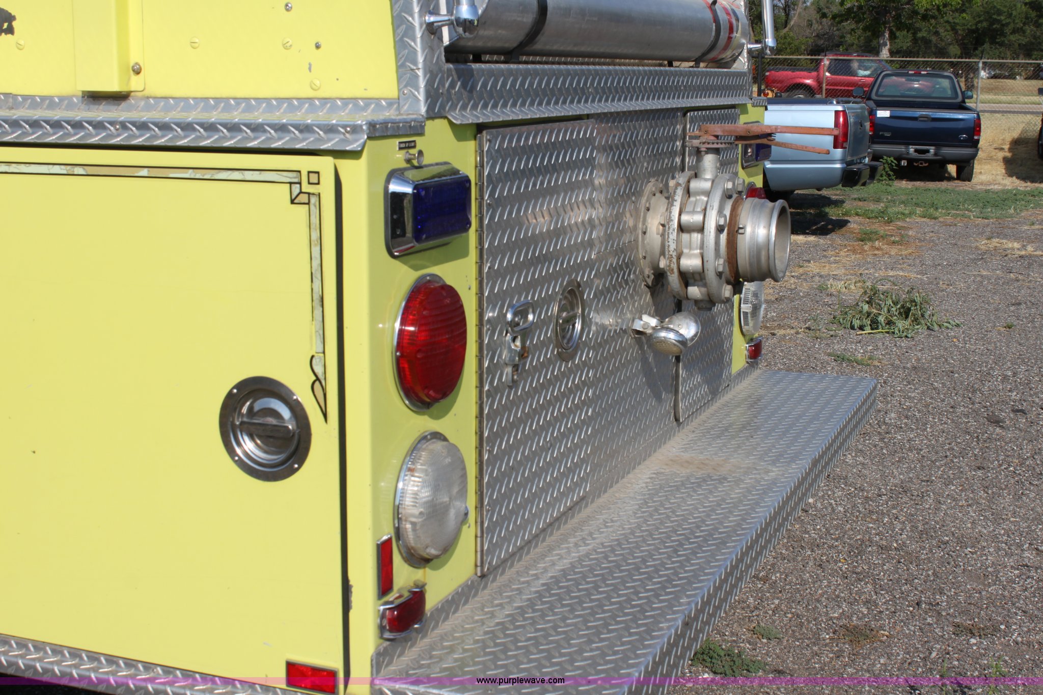 Purple Wave is selling a used Fire Truck or Emergency Vehicle in Kansas. This item is a 1983 Ford 9000 water tender truck with the following: 25,091 miles on odometer, 1,047 hours on meter, Detroit V8 diesel engine, Automatic transmission, Locking differential, Heat, Suspension seat, Firecom intercom system, Federal Signal PA controls, Smeal light controls, Waterous C-3 pump, 500 gpm at 150 PSIG, 6" rear discharge, Chelsea PTO, Air brakes, 12R22.5 tires, GVWR 60,000 lbs, FAWR 16,000 lbs, RAWR 22,000 lbs