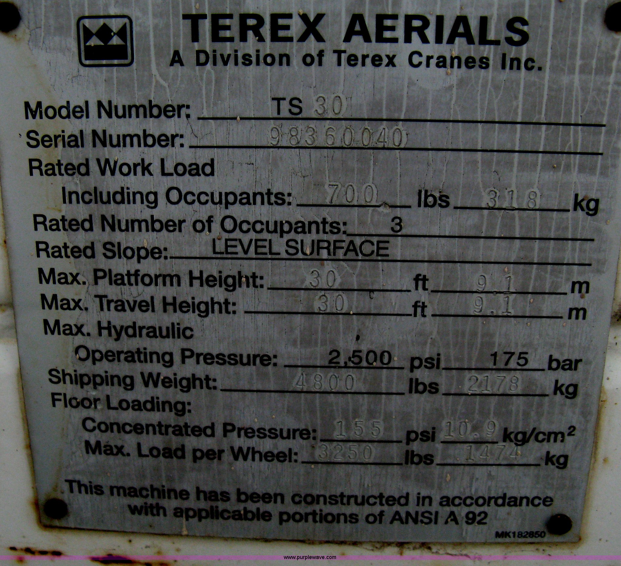 Purple Wave is selling a used Scissor or Vertical Lift in Kansas. This item is a Terex TS30 scissor lift with the following: 30' maximum platform height, 700 lb maximum lifting capacity, 48" x 115" platform, 48" slide-out platform extensions, No batteries, Missing platform control box, Parts only, Serial 98360040
