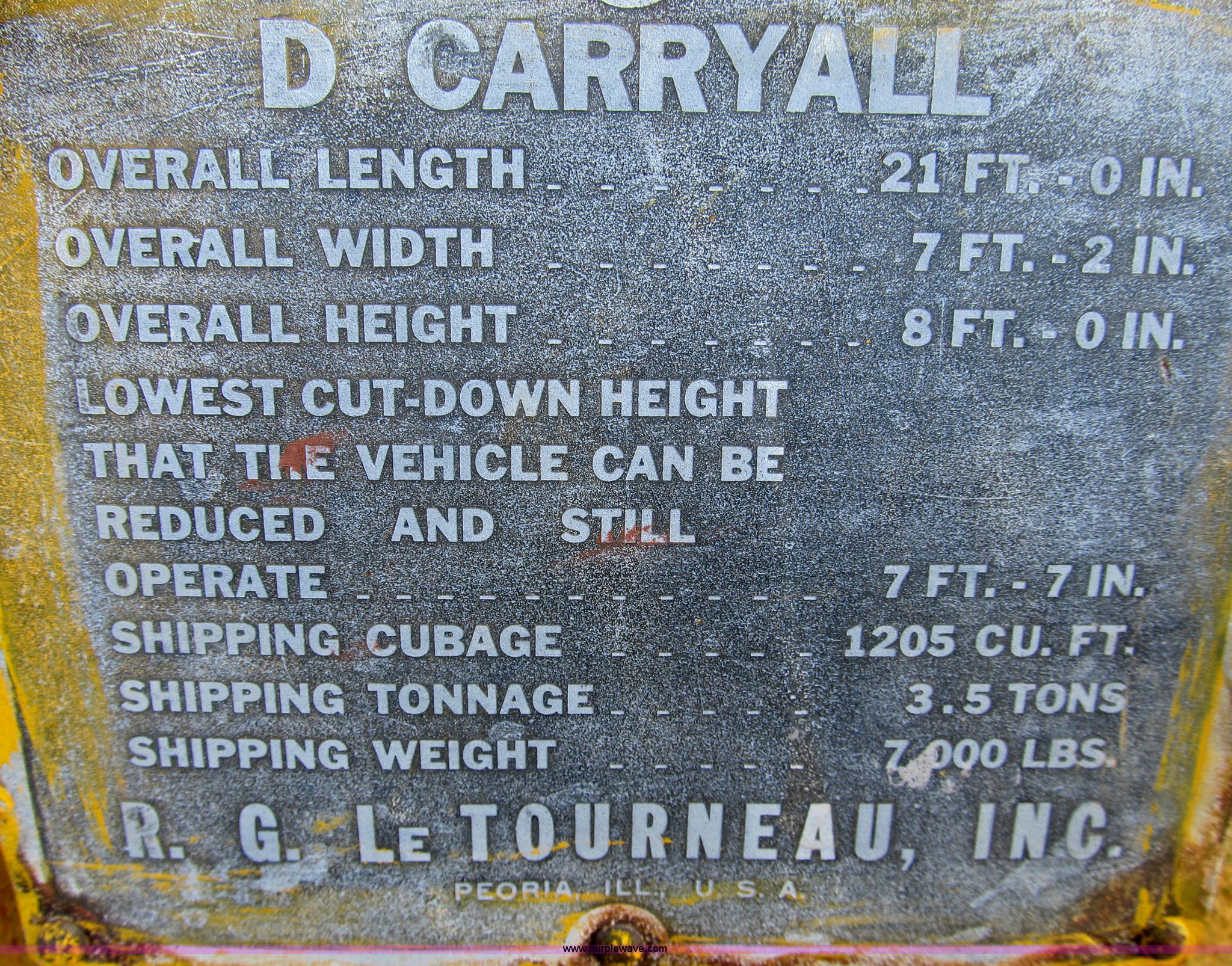 Purple Wave is selling a used Pull Type Scraper in Illinois. This item is a Letourneau D 5.5 yd. pull behind scraper with the following: 21'L x 7'2"W x 8'H, Hydraulic ejection, Three point, Require three auxiliary hydraulics to operate at maximum capacity, 7,000 lbs. base operating weight, In-service last year, Serial S-20955-D