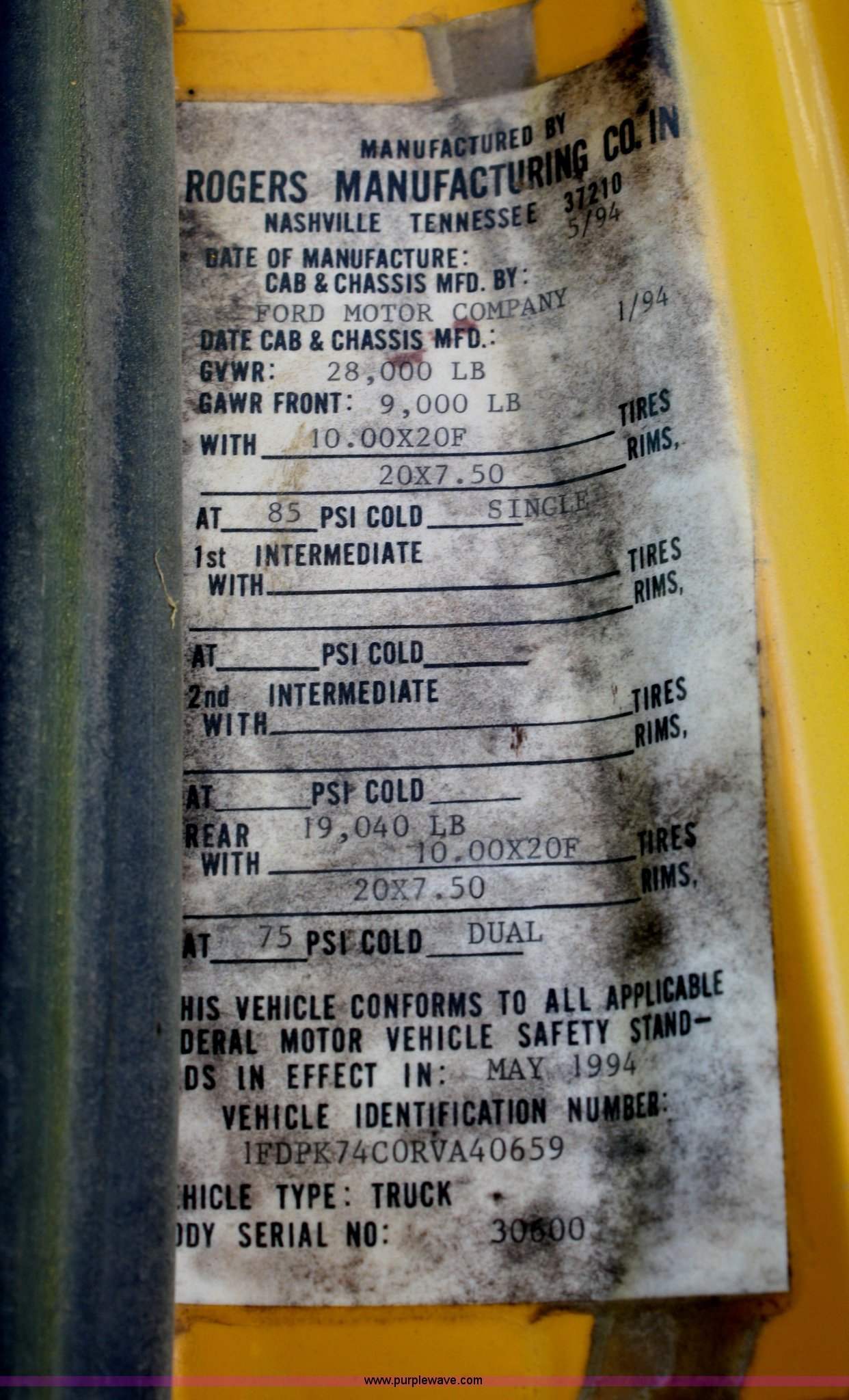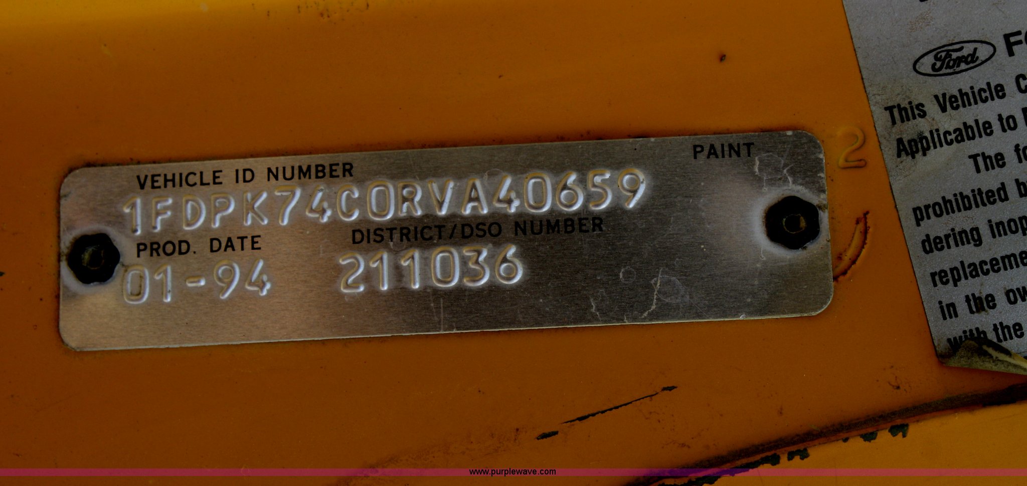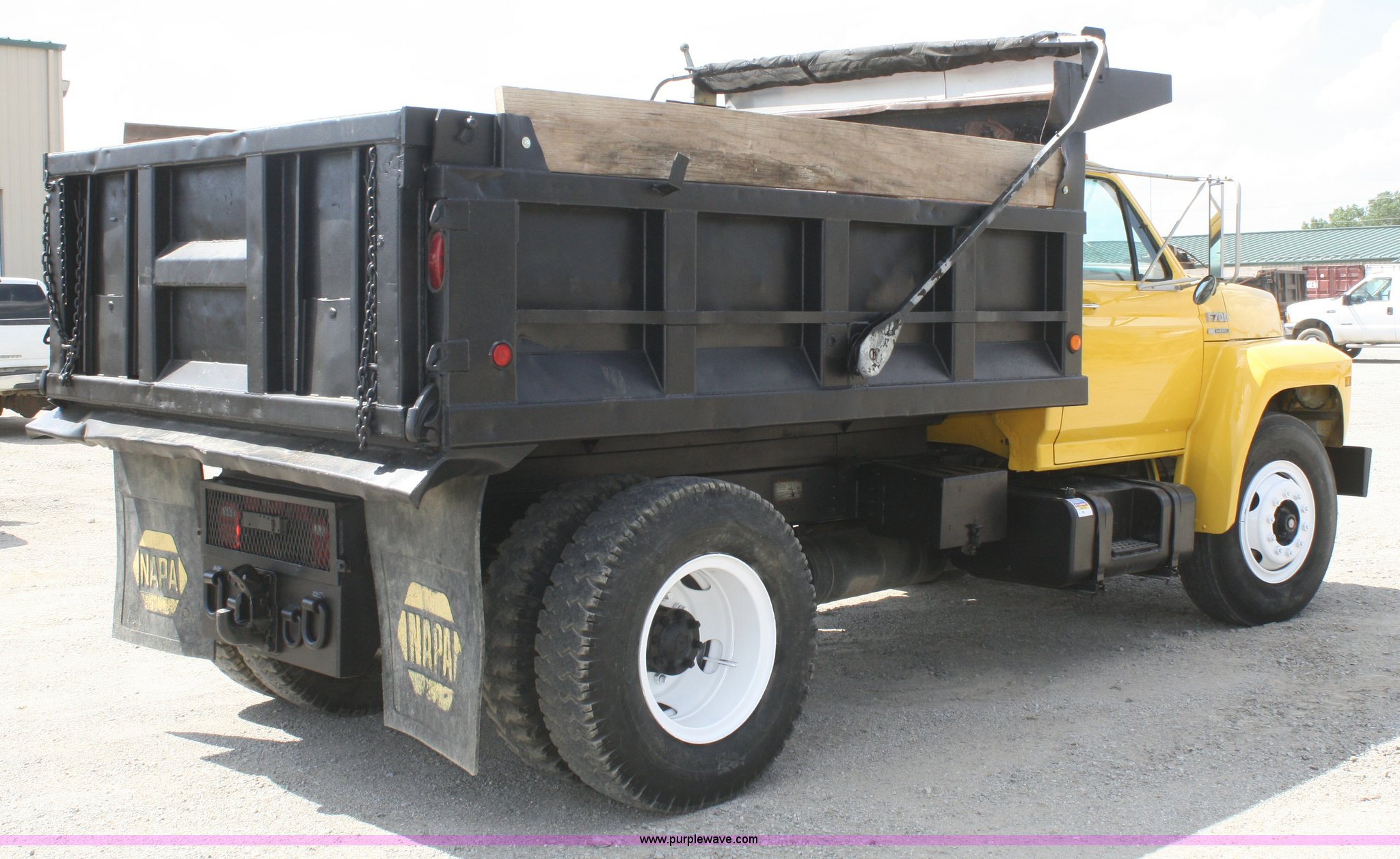Purple Wave is selling a used Construction Dump Truck in Kansas. This item is a 1994 Ford F700 dump truck with the following: 72,843 miles on odometer, 5,023 hours on meter, Cummins 5.9L L6 diesel engine, Four speed manual transmission, Two speed axle, Heater, 10' bed, Manual end gate, Three stage single ram, Tarp, Toolbox, Pintle hitch, 50 gallon fuel tank, PTO, Spring suspension, Hydraulic brakes, 11R22.5 tires, GVWR 28,000 lbs, FAWR 9,000 lbs, RAWR 19,000 lbs