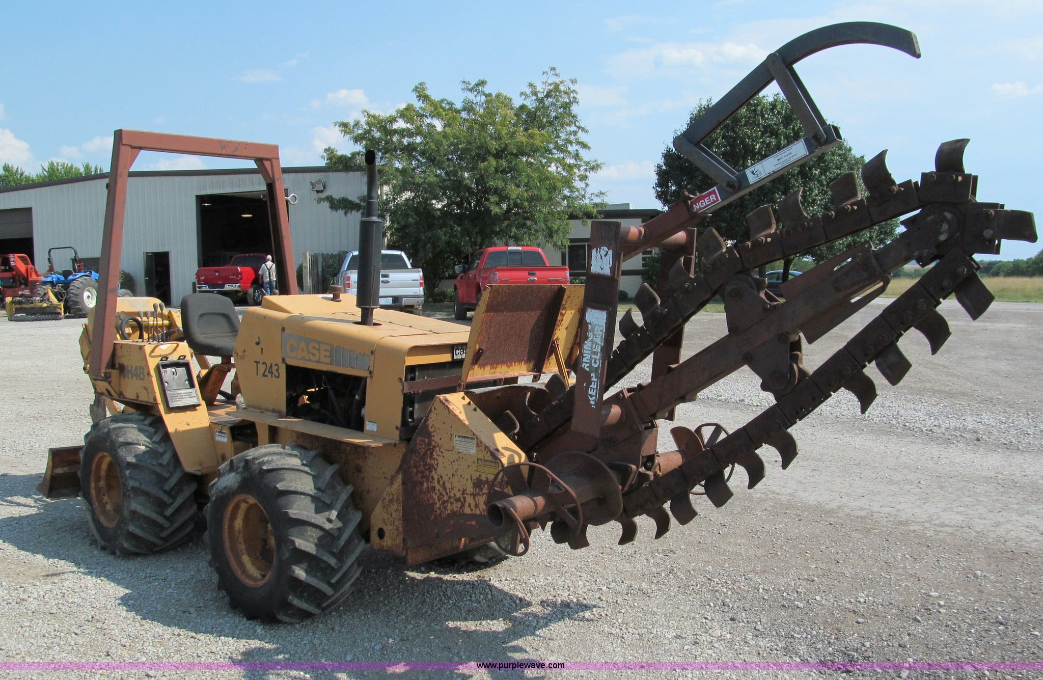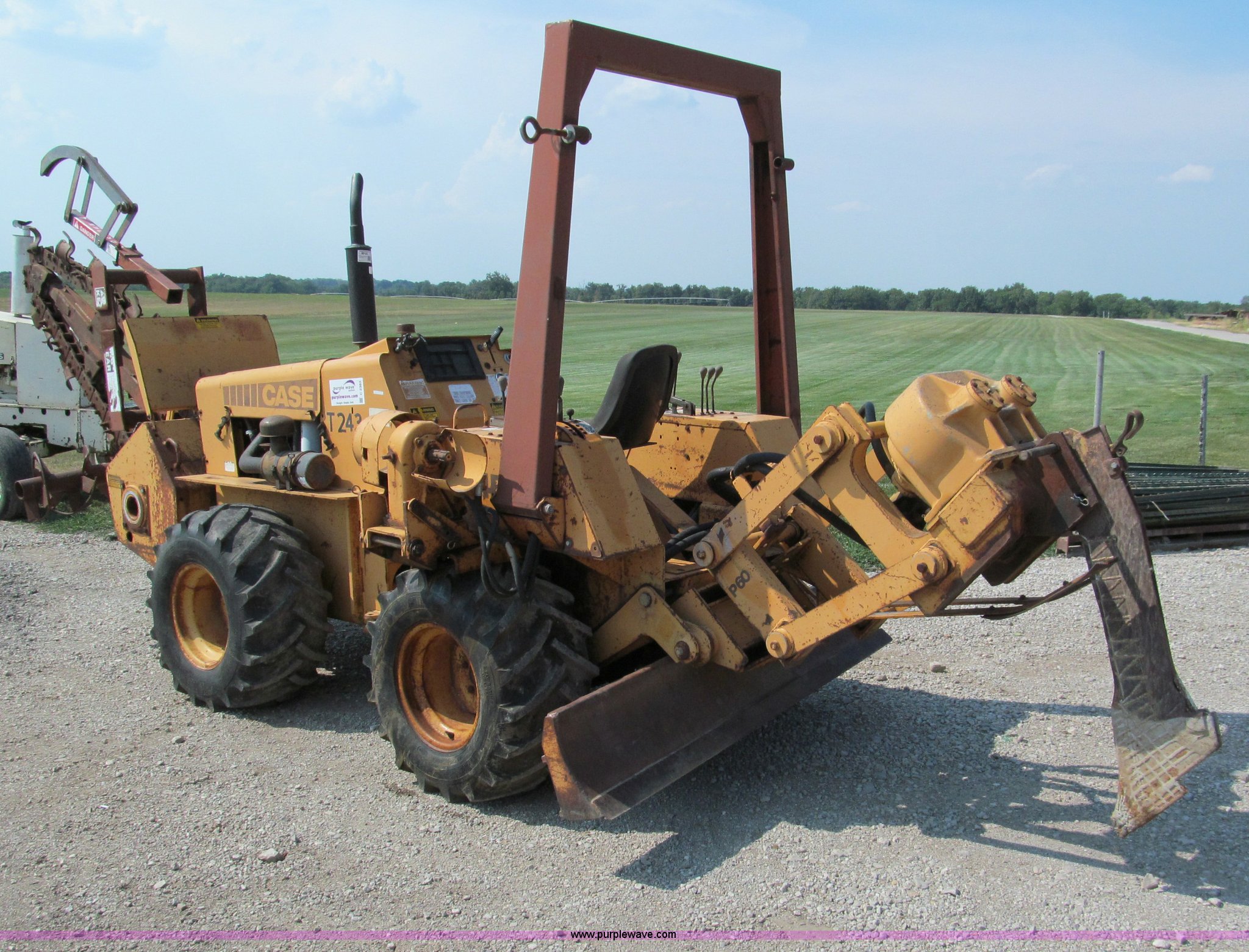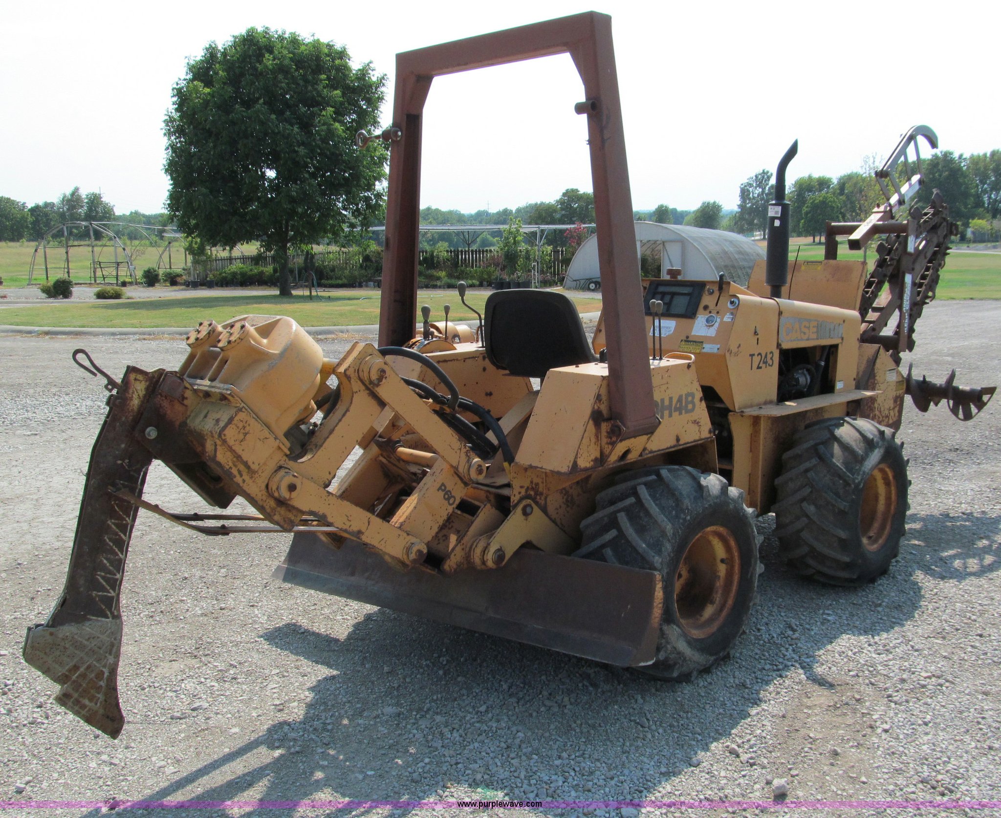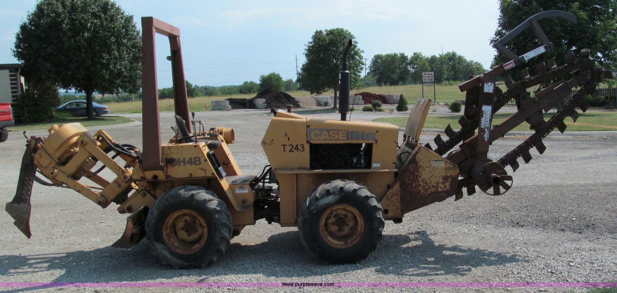 Purple Wave is selling a used Trencher or Rock Saw in Missouri. This item is a 1990 Case DH4B articulating trencher with the following: Four cylinder diesel engine, Four wheel drive, ROPS, 72" trencher boom, Set-up for 6"W, Extra teeth that will dig 1'W, Blocks included, Crumbers on both sides, 4' dig depth, Four-way 6' back fill blade, 24"L blade on vibratory plow, Directional, 31-15.50-15 tires, 5,000 lbs. base operating weight, Recently replaced muffler, seat, alternator, and bearing in stinger, Serial JAF0049201