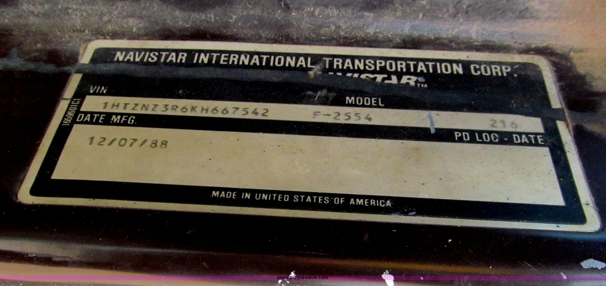 Purple Wave is selling a used Construction Dump Truck in Missouri. This item is a 1989 International F2554 tandem axle dump truck with the following: 282,600 miles on odometer, Miles may vary, Cummins six cylinder turbo diesel engine, Eaton Fuller FT6613 18 speed manual transmission, Twin screw, Heater, AM radio, Air suspension seat, Heil 15' dump bed, Manual end gate, Model HPT1-0YD15, Bumper, Block heater, Approx. 100 gallon fuel tank, PTO, Hendrickson spring suspension, Air brakes, Air trailer brakes, Pintle hitch, Trailer wiring, 216" wheelbase, 10.00R20 tires, GVWR 48,000 lbs, FAWR 10,000 lbs, IAWR 19,000 lbs, RAWR 19,000 lbs, Unit# 6