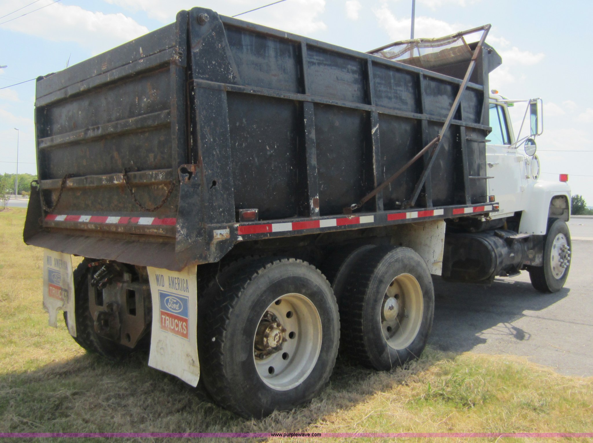 Purple Wave is selling a used Construction Dump Truck in Oklahoma. This item is a 1977 Ford dump truck with the following: 604,791 miles on odometer, Cummins 855 CID turbo diesel engine, 350 HP, 13 speed manual transmission, Twin screw, AC and heat, AC inoperable, AM/FM/Cassette, Air suspension seat, 14' bed, Air end gate, Electric roll over tarp, Exterior visor, Chrome bumper, Block heater, Trailer wiring, Toolbox, Pintle hitch, Dual 75 gallon fuel tanks, PTO, Air suspension, Air brakes, Jake brake, Brake controller, 163" wheelbase, 11R24.5 tires