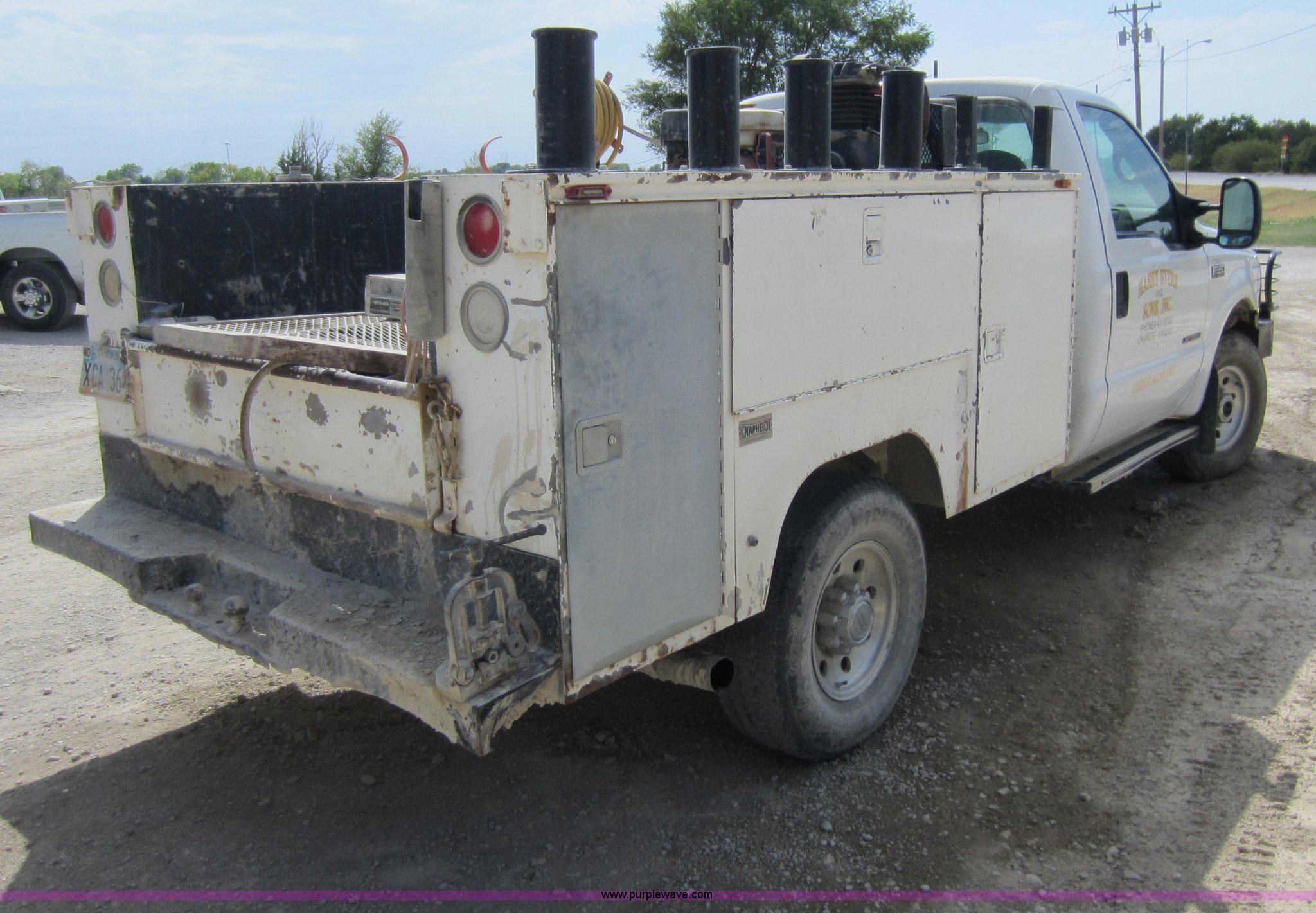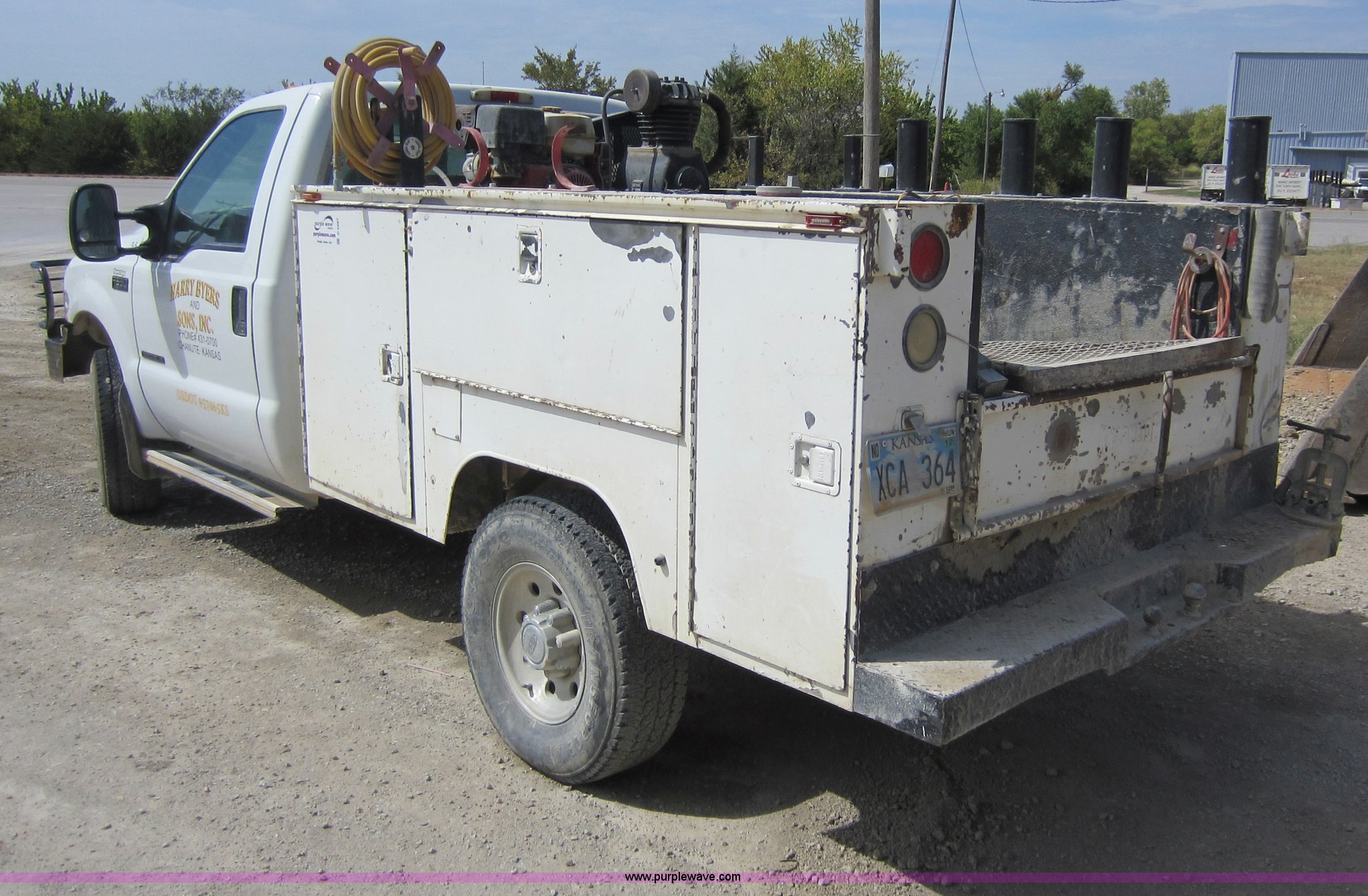 Purple Wave is selling a used Service Truck in Kansas. This item is a 2000 Ford F350 Super Duty utility pickup truck with the following: 177,258 miles on odometer, Powerstroke 7.3L V8 turbo diesel engine, Manual transmission, Four wheel drive, Manual lockout hubs, AC and heat, Tilt, Cruise, AM/FM/CD, Manual windows and locks, Vinyl interior, Air compressor, hose reel, and other contents not included, Needs batteries