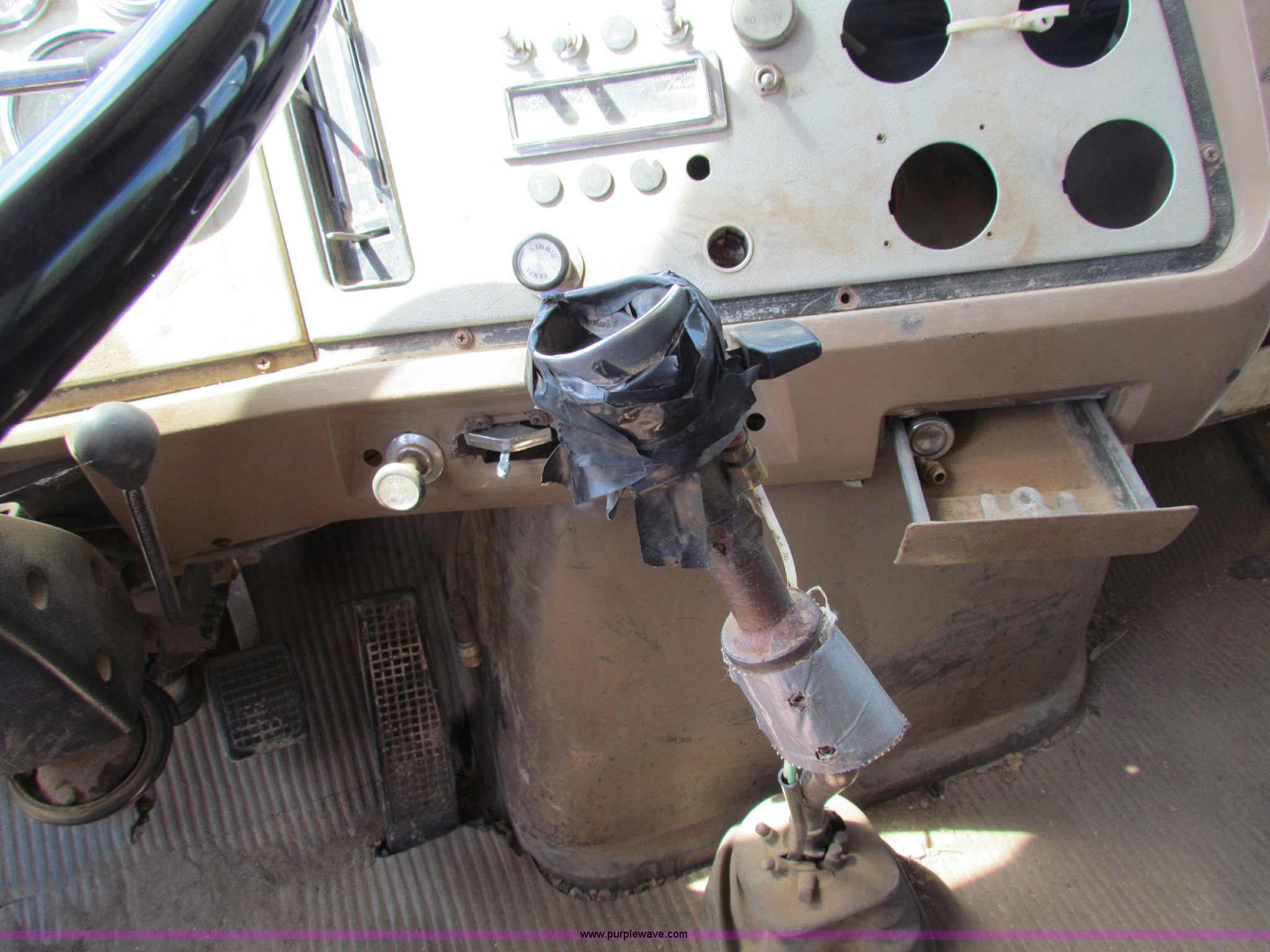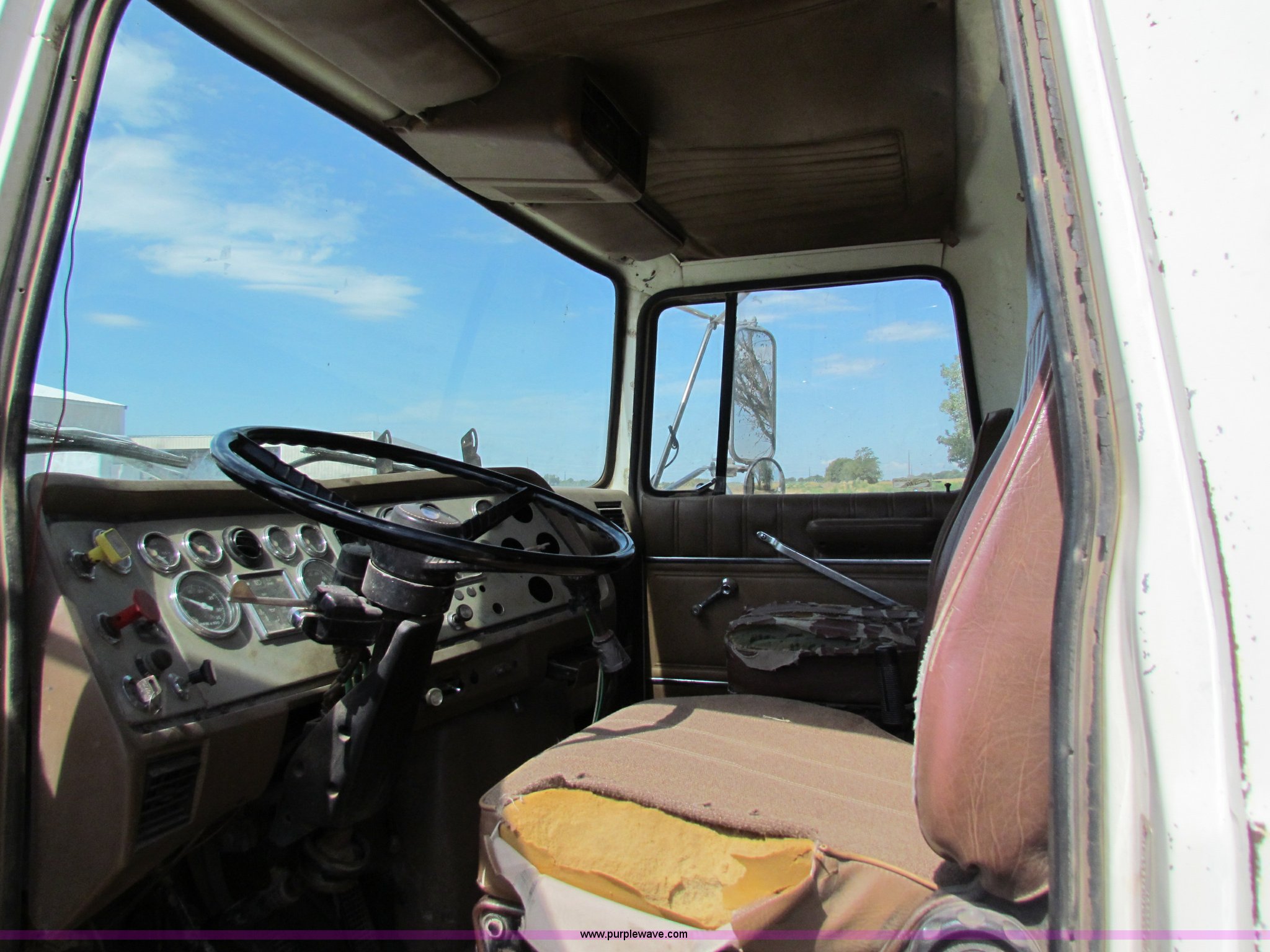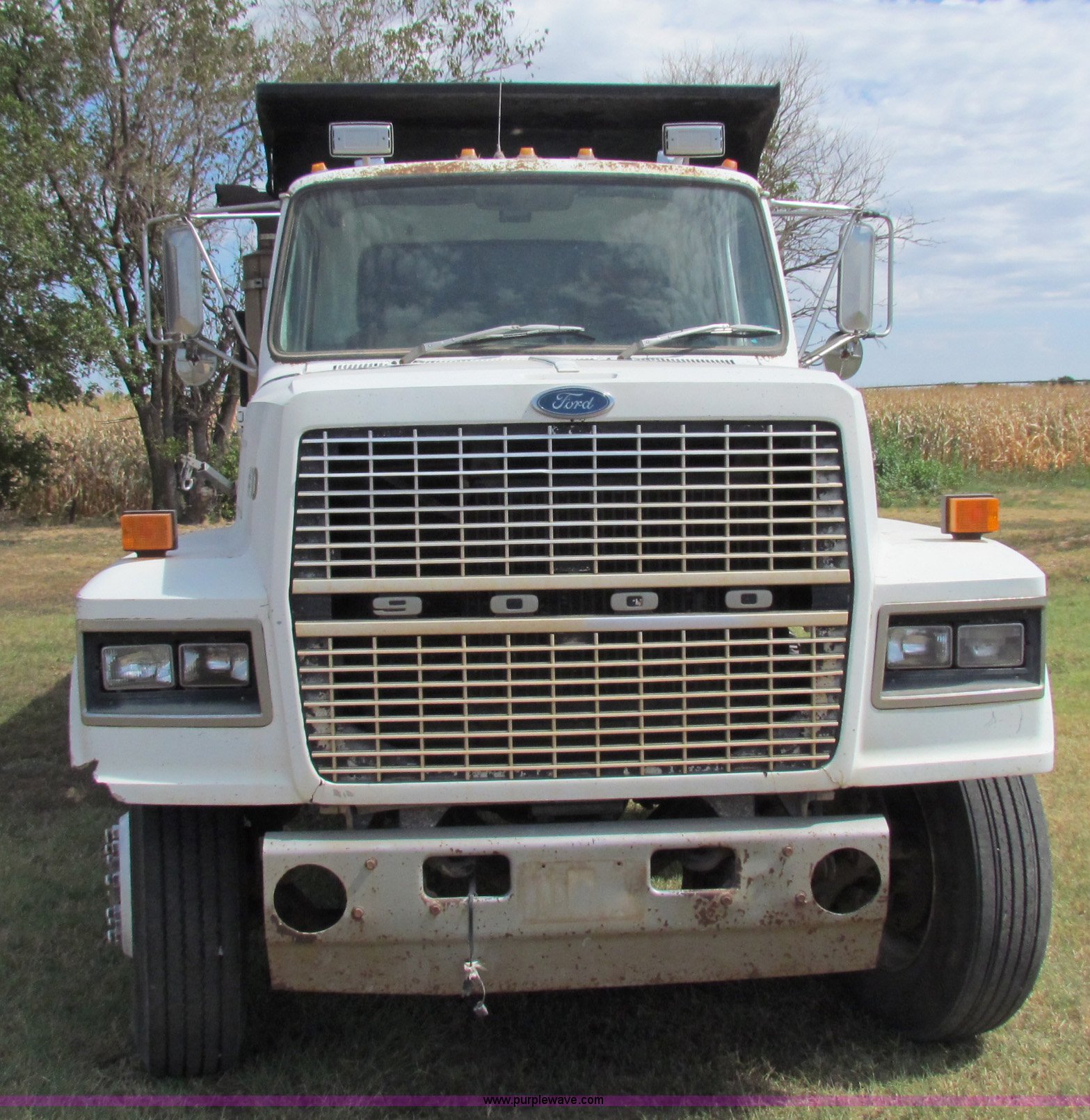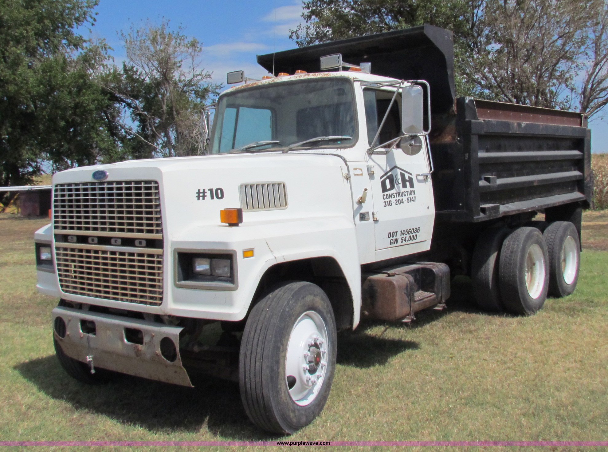 Purple Wave is selling a used Construction Dump Truck in Kansas. This item is a 1989 Ford L9000 dump truck with the following: 659,666 miles on odometer, Cummins L10 diesel engine, 300 HP, Nine speed manual transmission, Twin screw, AC and heat, AC need charged, 13' steel dump bed, Air latch end gate, Air brakes, 11R22.5 front tires, 275/80R24.5 rear tires, Rebuilt lift cylinders
