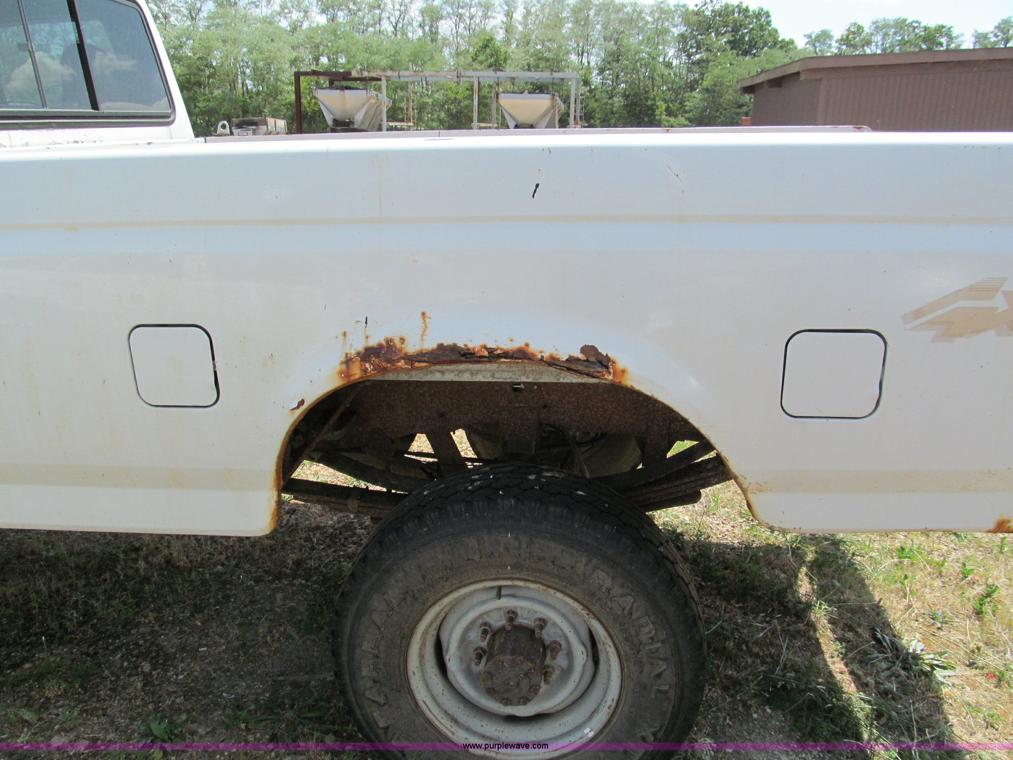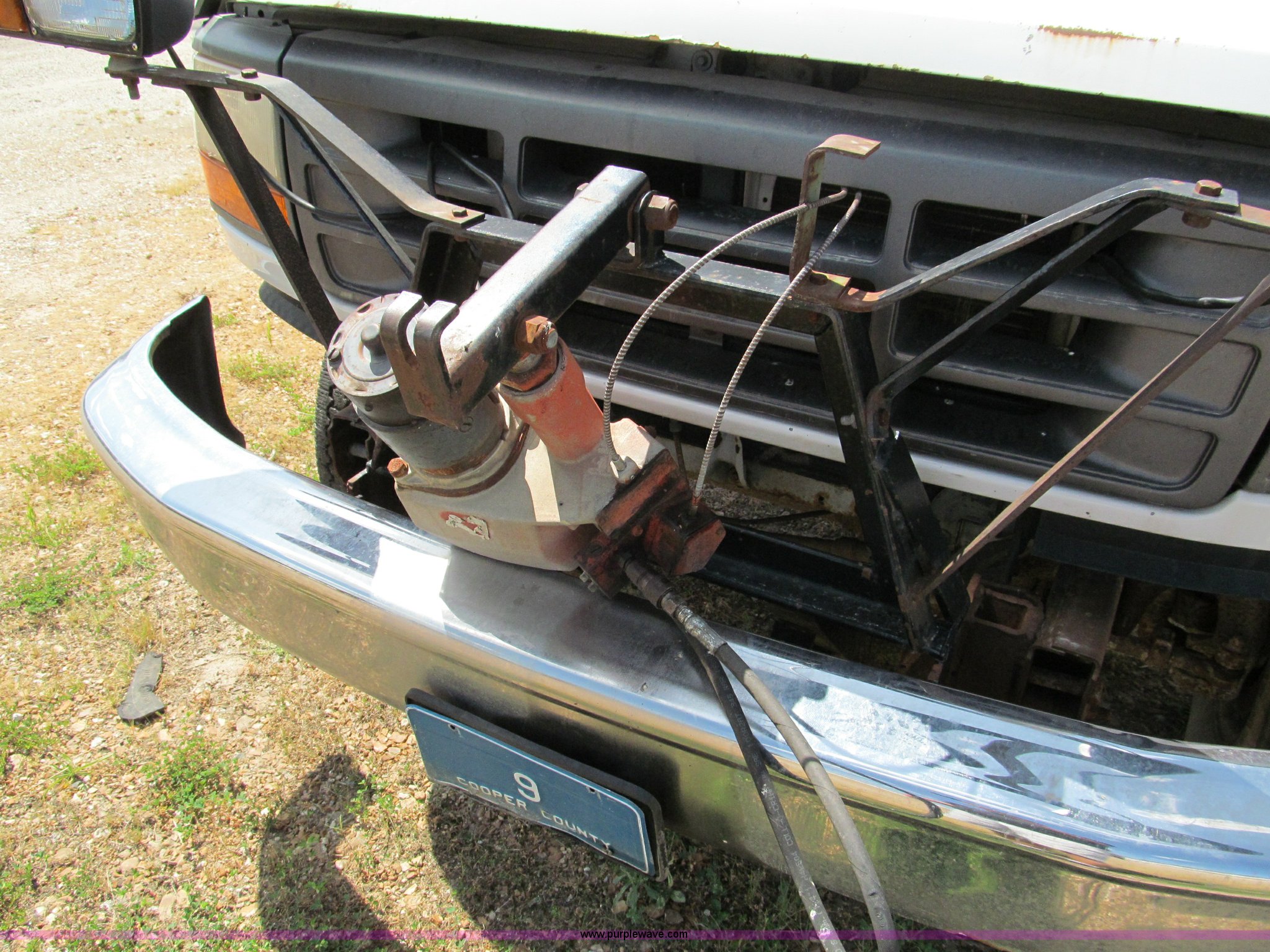 Purple Wave is selling a used Passenger Vehicle in Missouri. This item is a 1997 Ford F350 XL pickup truck with the following: 121,003 miles on odometer, Miles may vary, 7.5L V8 EFI gas engine, Automatic transmission, Four wheel drive, AC and heat, Tilt, Cruise, AM/FM/Cassette, Manual windows and locks, Vinyl interior, Sliding rear glass, Dual fuel tanks, Front end setup for snow plow with in-cab controls, Receiver hitch, Trailer wiring, 235/85R16 tires, No tailgate, Dents and body rust, Police radio will be removed