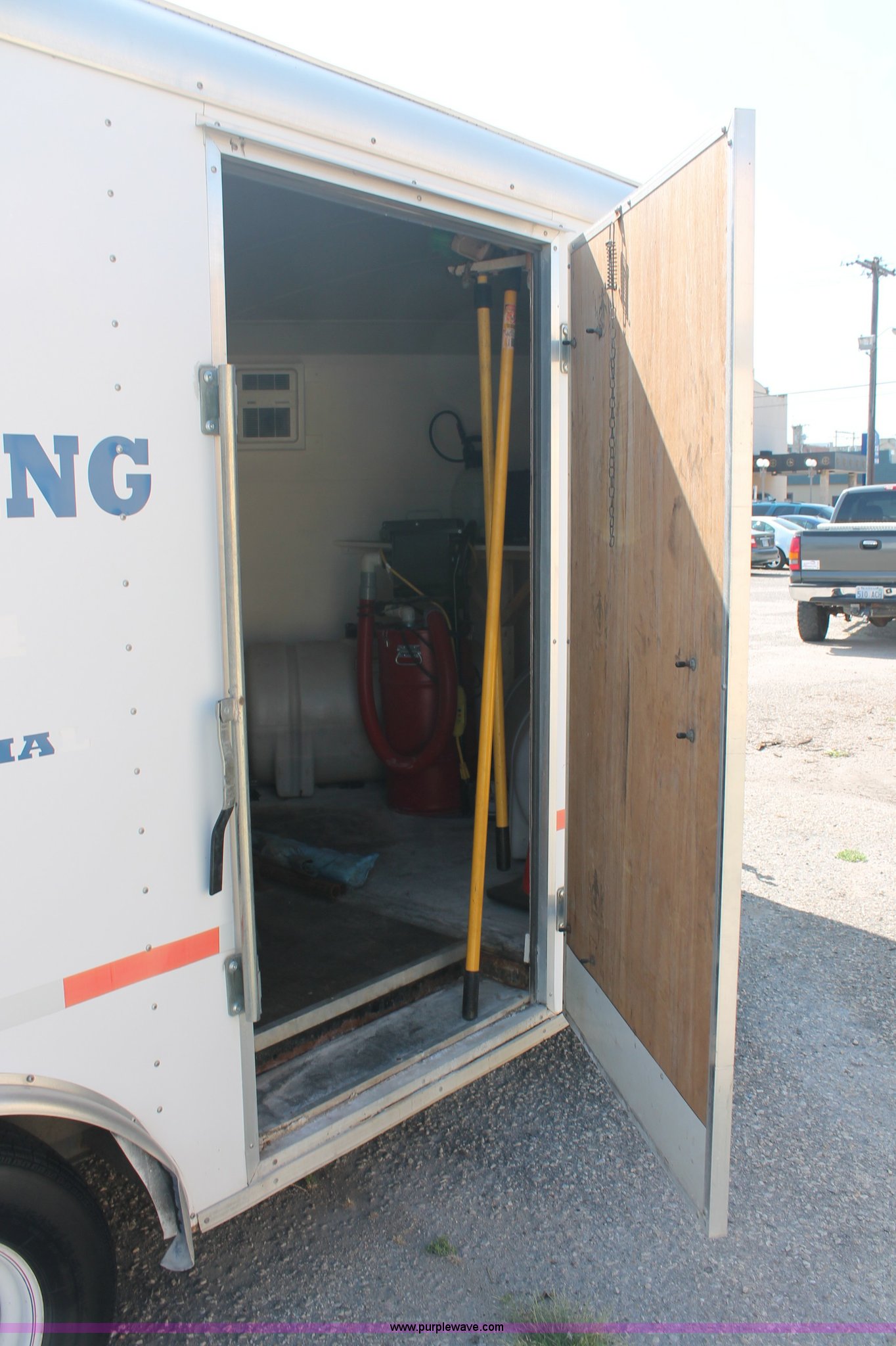 Purple Wave is selling a used Enclosed Cargo Trailer in Kansas. This item is a Mobile Power enclosed washing trailer with the following: 24'L overall, 18'L x 100"W box, 4' 45 degree nose, 2' tongue, Landa PGHW 5-3000 Platinum Series pressure washer, 1,915 hours on meter, Briggs & Stratton Vanguard 16 HP gas engine, Temperature control, (2) Farenheat heaters, 550, 65, 65 gallon poly tanks, Clarke Metalworker 4.5" bandsaw, Wet-Vac, Northstar pressure washer, Honda GX270 gas engine, Landa water jet, Assorted wands, hoses, reels, accessories, and tools included, 2 5/16" ball, 225/75R15 tires, GVWR 9,900 lbs