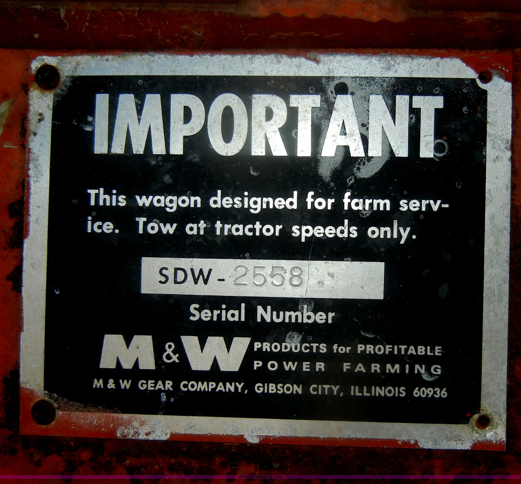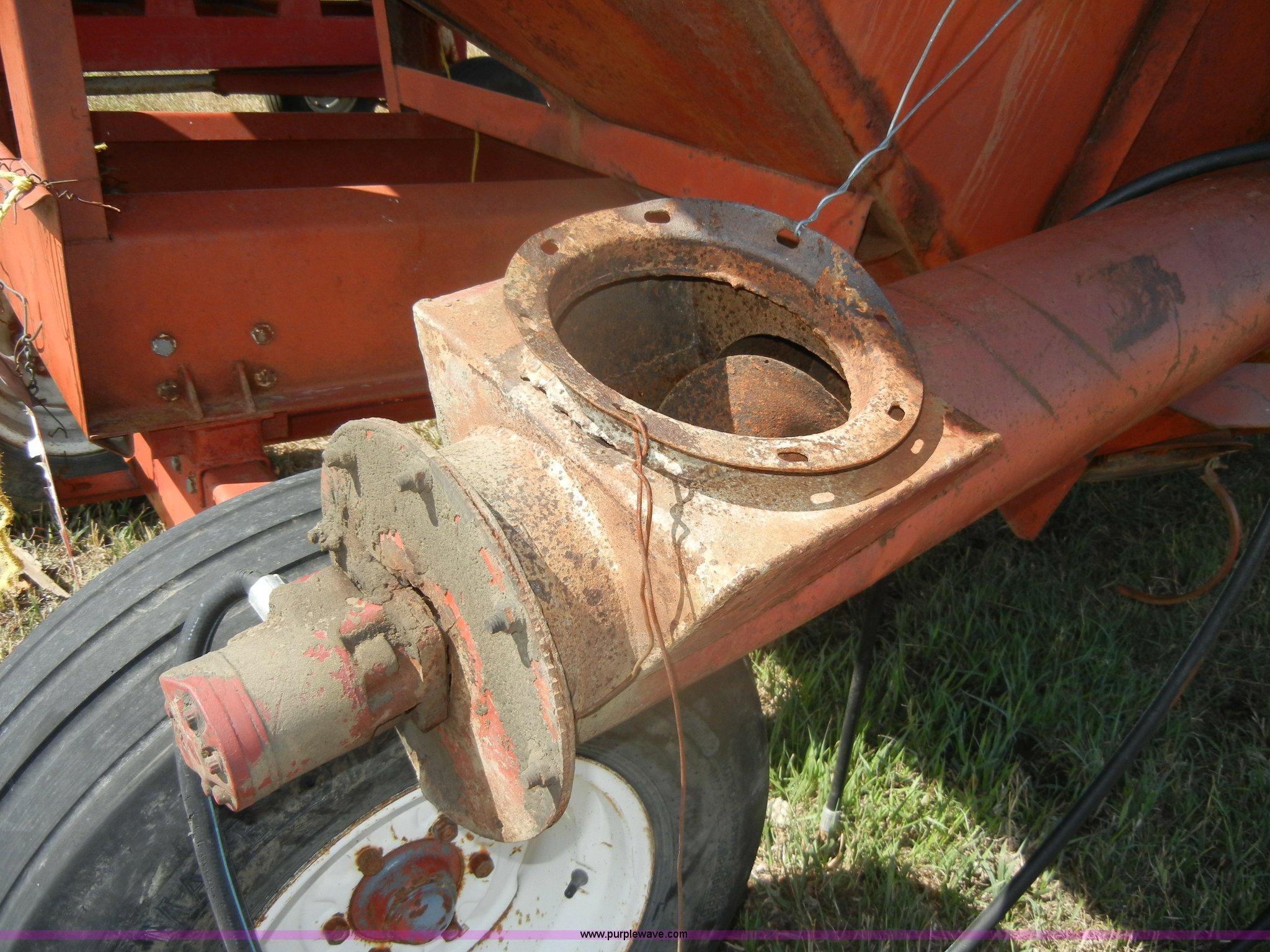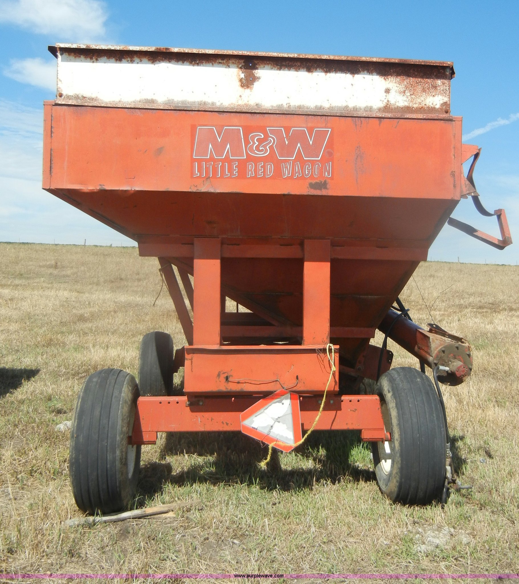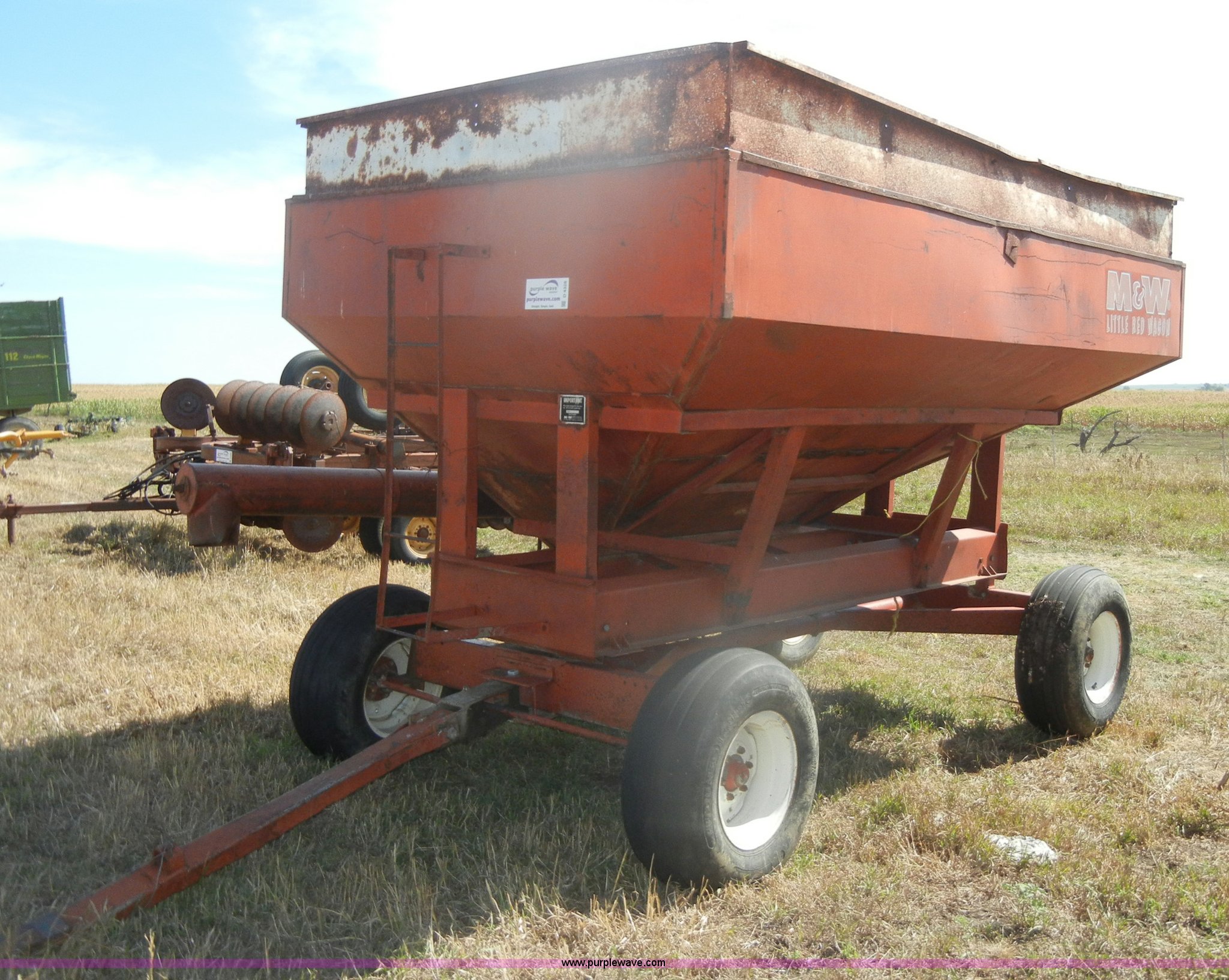 Purple Wave is selling a used Grain Cart or Gravity Wagon in Kansas. This item is a M & W Little Red gravity wagon with the following: 12' x 7', Pin hitch, Hitch is twisted, 12.5L-16 tires, Unattached 12' auger included, Serial SDW-2558