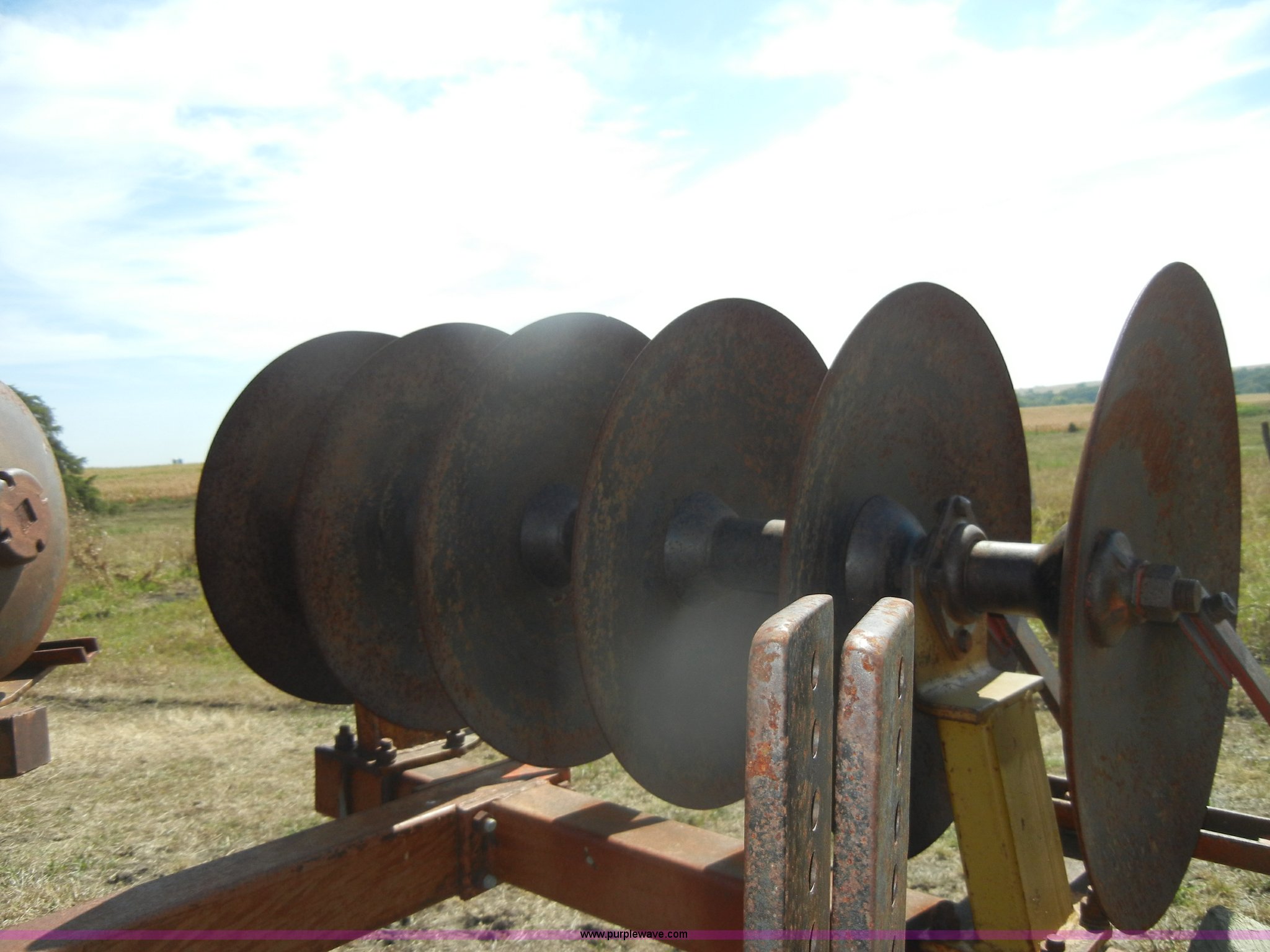 Purple Wave is selling a used Disk in Kansas. This item is a Kewanee 1010 batwing disk with the following: 18'W overall, 3.5'W wings, Hydraulic lift and fold, Pin hitch, 11L-15 tires, Anhydrous applicator controller
