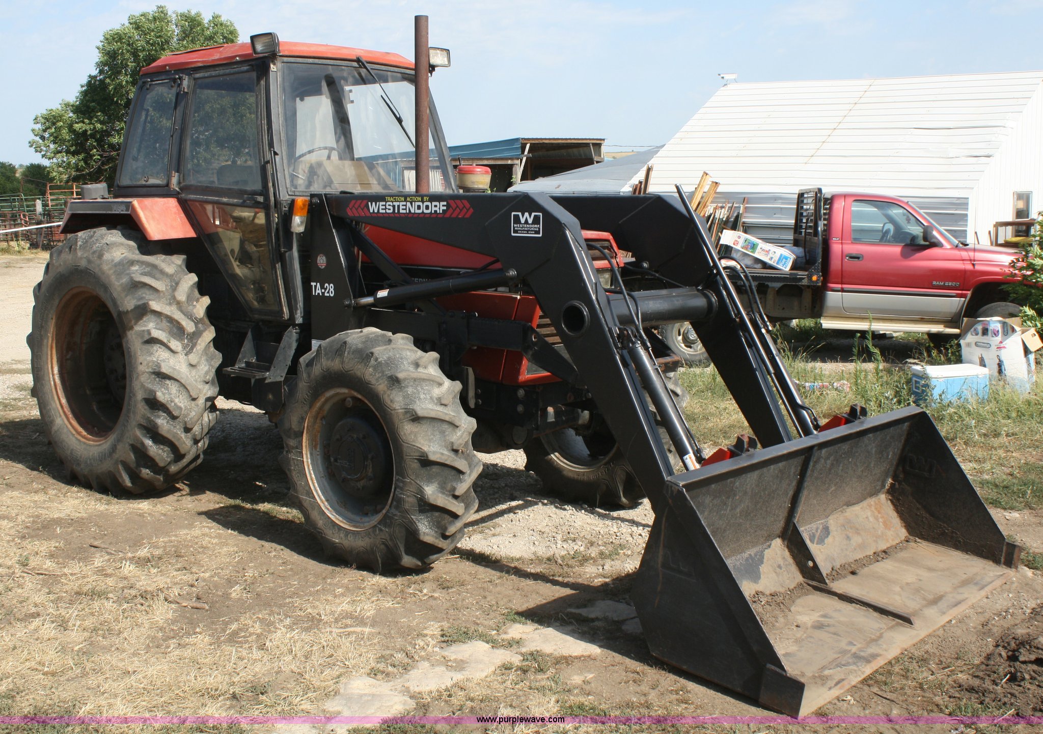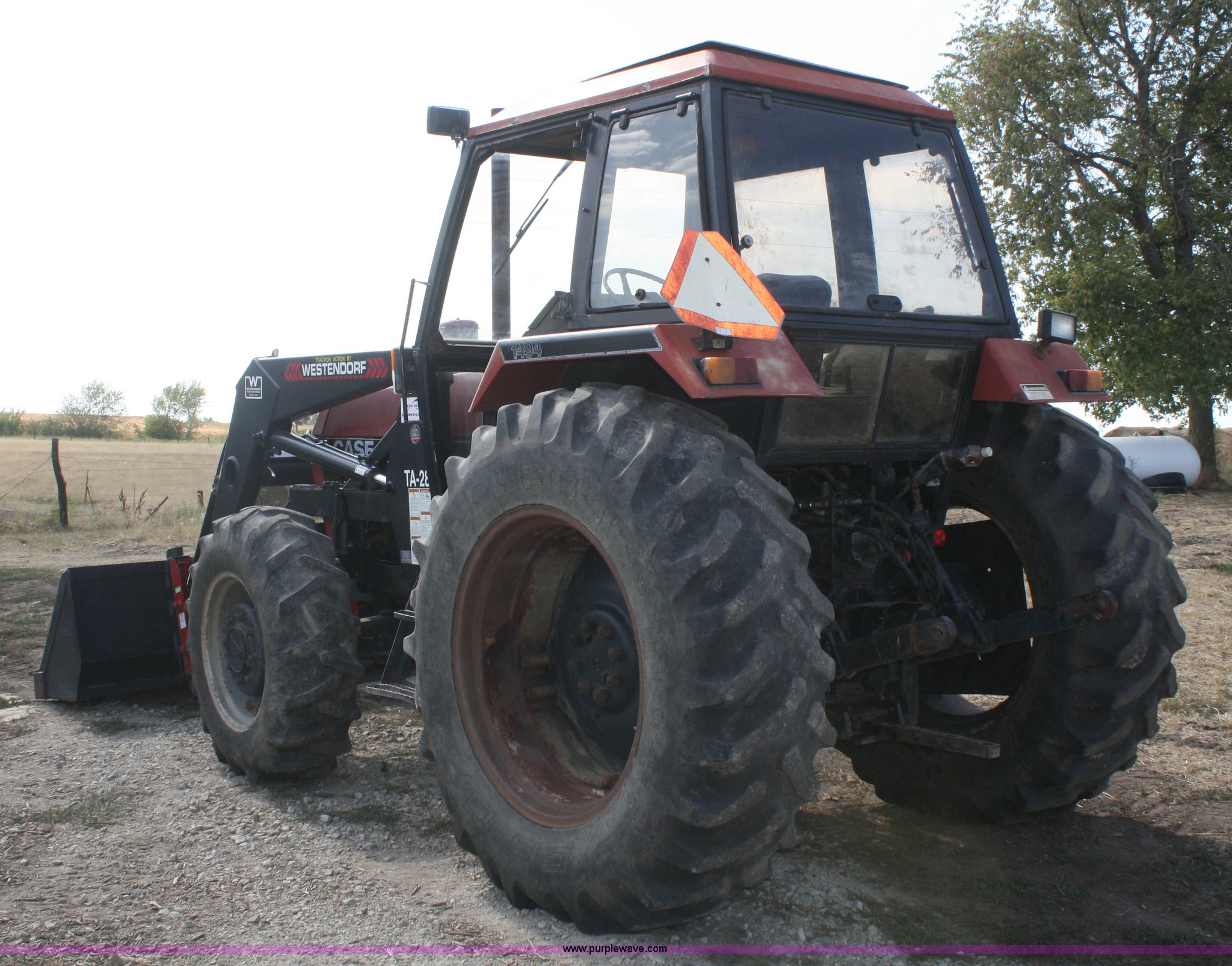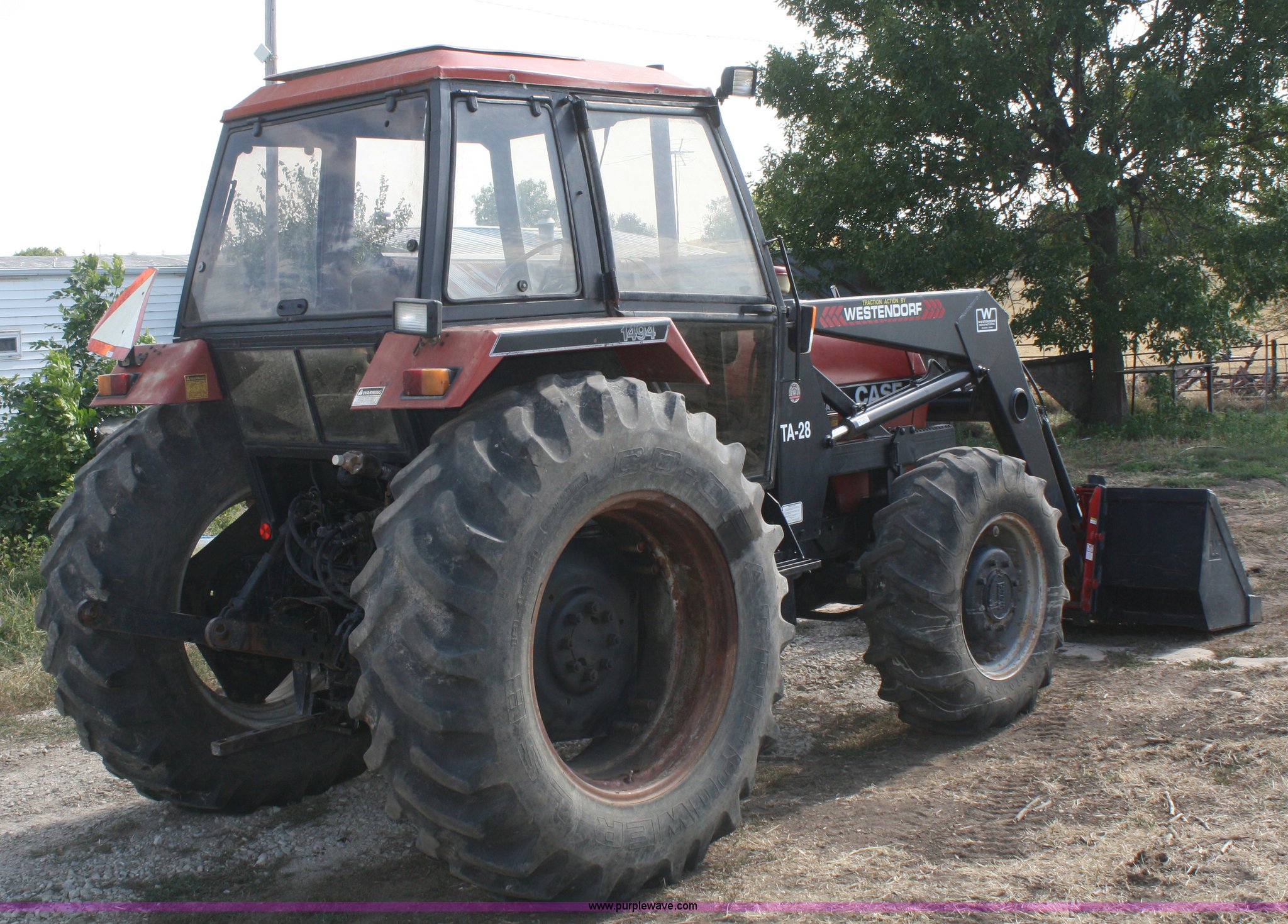 Purple Wave is selling a used Tractor in Kansas. This item is a 1986 Case IH 1494 MFWD tractor with the following: 1,638 hours on meter, Case four cylinder turbo diesel engine, 85 HP, Manual transmission, 12F-4R gears, Enclosed cab, AC and heat, AC does not cool, Spring seat, Westendorf TA-28 loader, Self-leveling for loader included but not installed, 7' bucket, Two-lever control, Three point, Draw bar, 540/1000 PTO, (2) rear hydraulic remotes, 13.6-24 front tires, 18.4-34 rear tires, Less than 10 hours on resurfaced head and valve work, Recently replaced fuel filters, Right rear wheel seal leaks, Left cab door is included but bent on the bottom, Serial 11520351