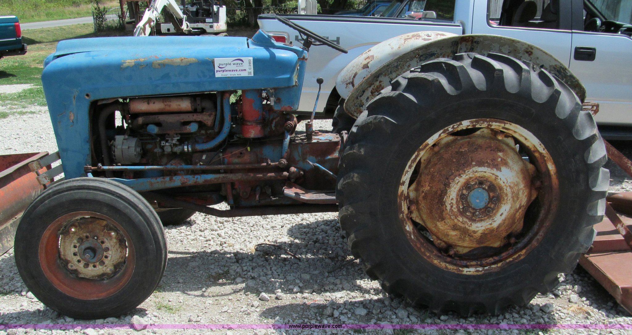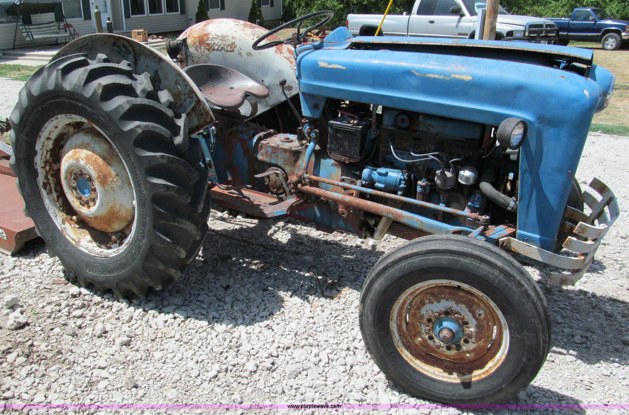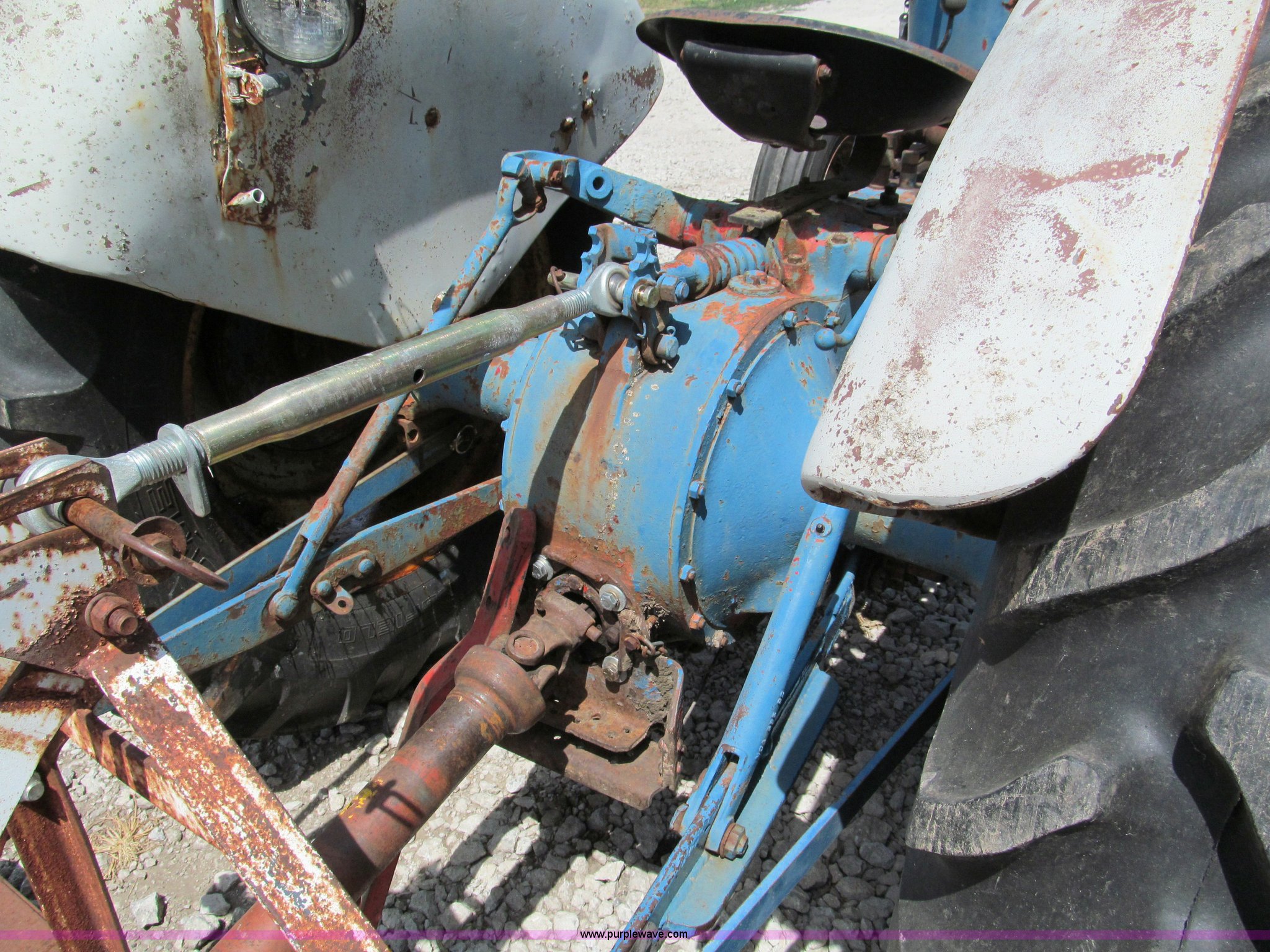 Purple Wave is selling a used Tractor in Missouri. This item is a Ford 860 tractor with the following: Four cylinder gas engine, 50 HP, Manual transmission, 5F-1R gears, Live power, Spring seat, 540 PTO, Draw bar, Three point hitch, 6.00-16 front tires, 13.6-28 rear tires, Battery replaced July 2011, Block repaired 15 years ago, Needs starter solenoid, Tachometer nonfunctional, Rotary mower not included