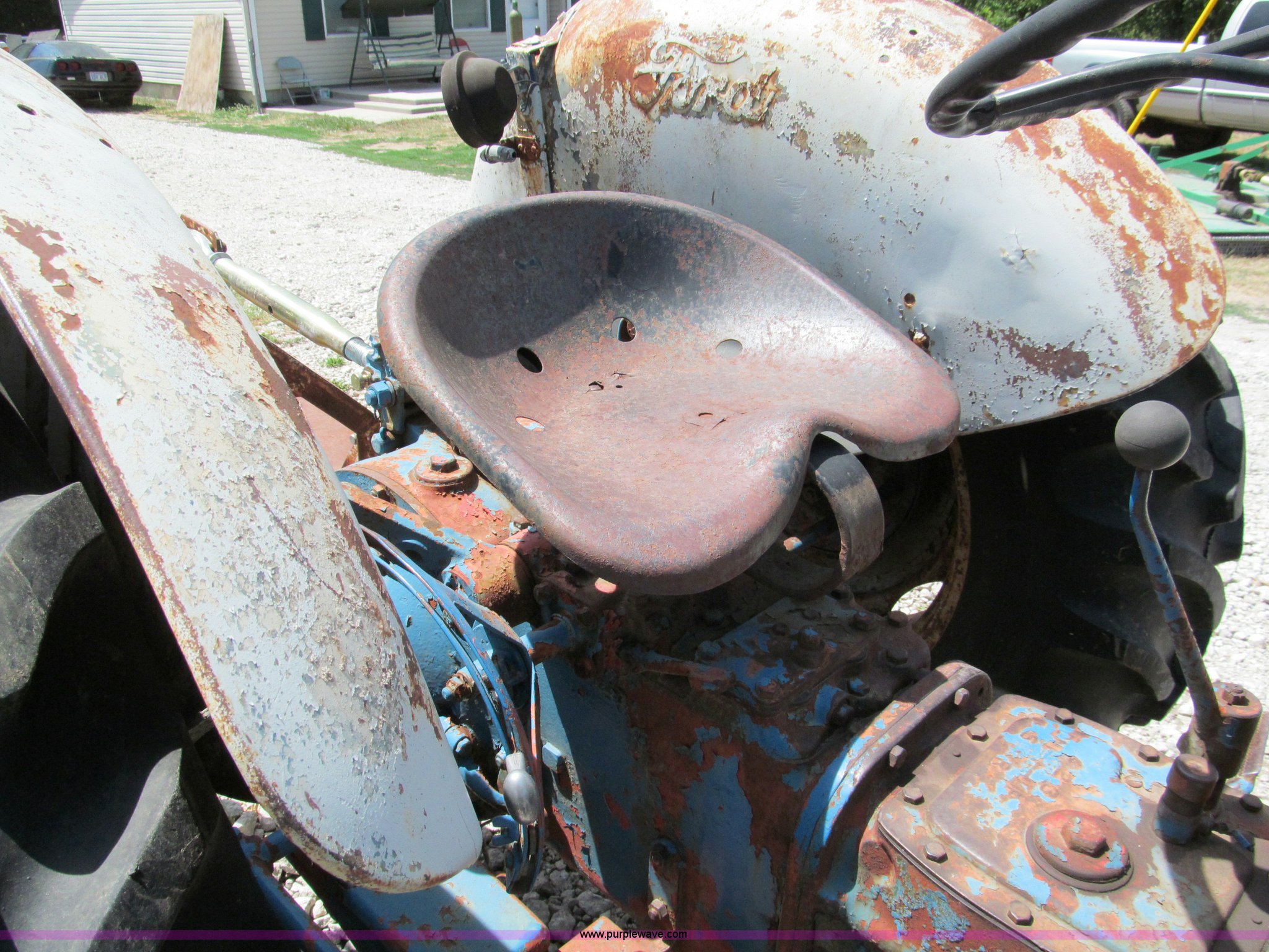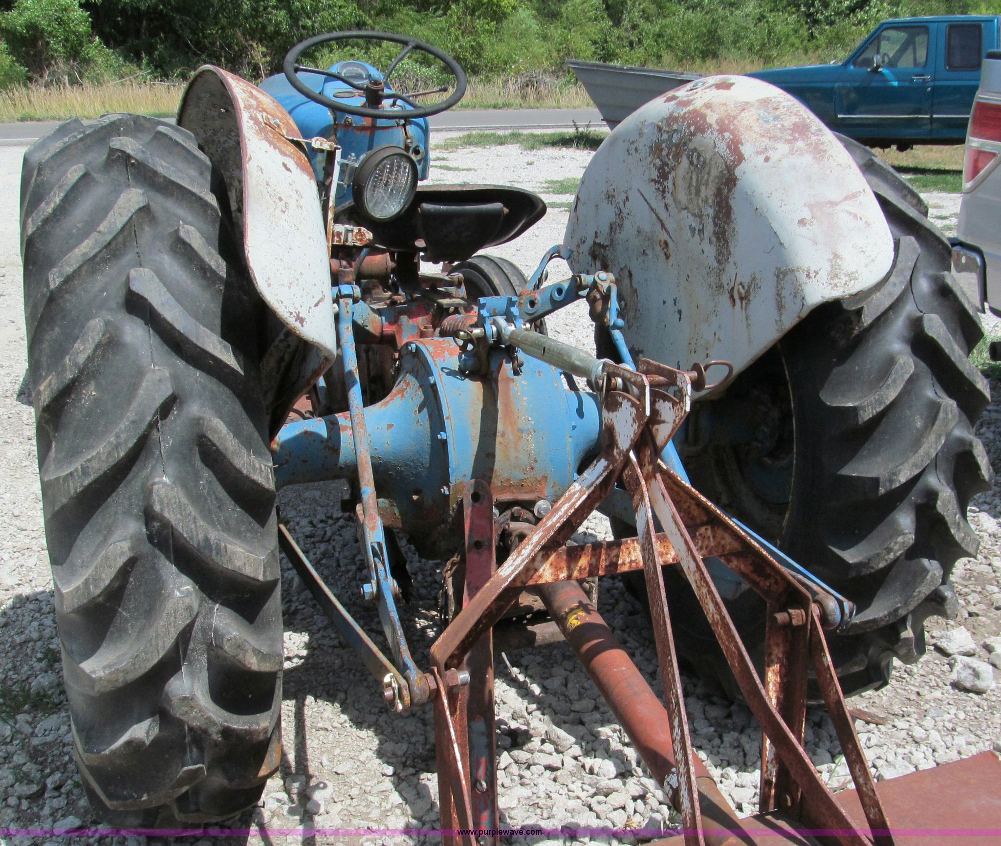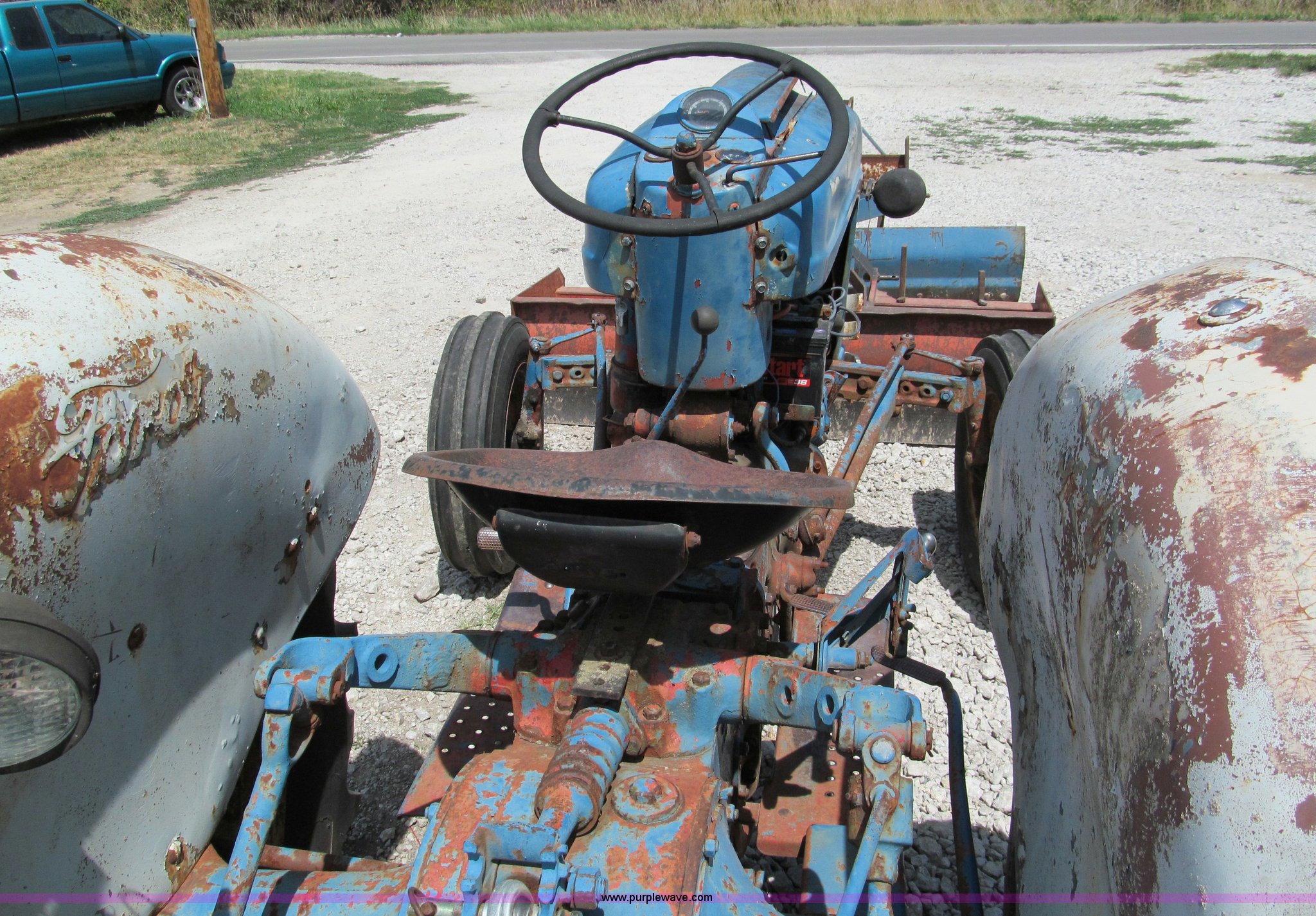 Purple Wave is selling a used Tractor in Missouri. This item is a Ford 860 tractor with the following: Four cylinder gas engine, 50 HP, Manual transmission, 5F-1R gears, Live power, Spring seat, 540 PTO, Draw bar, Three point hitch, 6.00-16 front tires, 13.6-28 rear tires, Battery replaced July 2011, Block repaired 15 years ago, Needs starter solenoid, Tachometer nonfunctional, Rotary mower not included