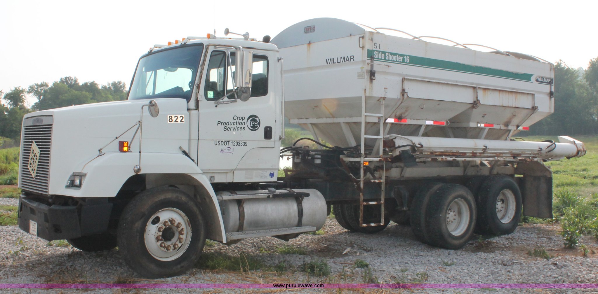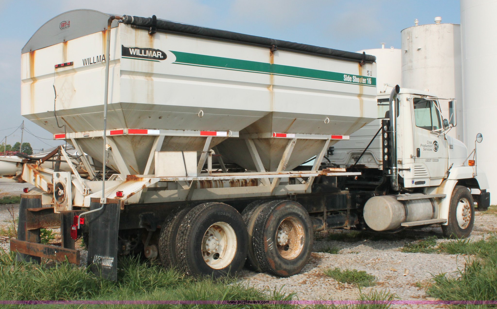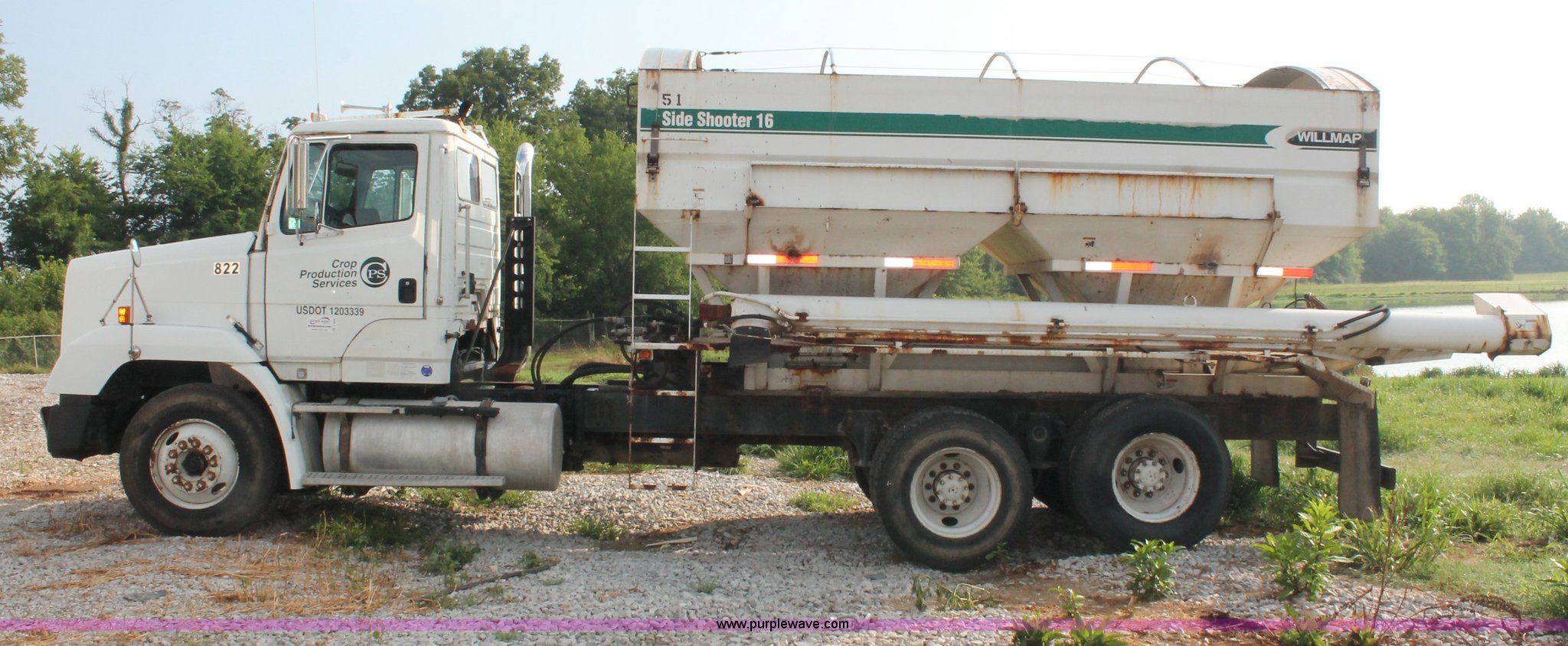 Purple Wave is selling a used Fertilizer or Feed Delivery Truck in Kentucky. This item is a 1994 Freightliner FLC112 fertilizer tender truck with the following: 563,579 miles on odometer, Cummins 93R 14.0L L6 diesel engine, 330 HP, Serial 11711043, Eaton Road Ranger manual transmission, Twin screw, Differential lock, AC and heat, Kenmore CB radio, Willmar Side Shooter 16 tender bed, Dual hopper bottom, Access ladder, Hydraulic toggle four stick operation, 10" diameter auger, SRT-2 rollover tarp, Serial 11711043, Bumper, Block heater, Dual 100 gallon tanks, Single rear exhaust stack, Sliding fifth wheel, PTO, Wet kit, Spring suspension, Jake brake, 11R22.5 tires, GVWR 48,000 lbs, FAWR 12,000 lbs, IAWR 18,000 lbs, RAWR 18,000 lbs, Unit# 22027