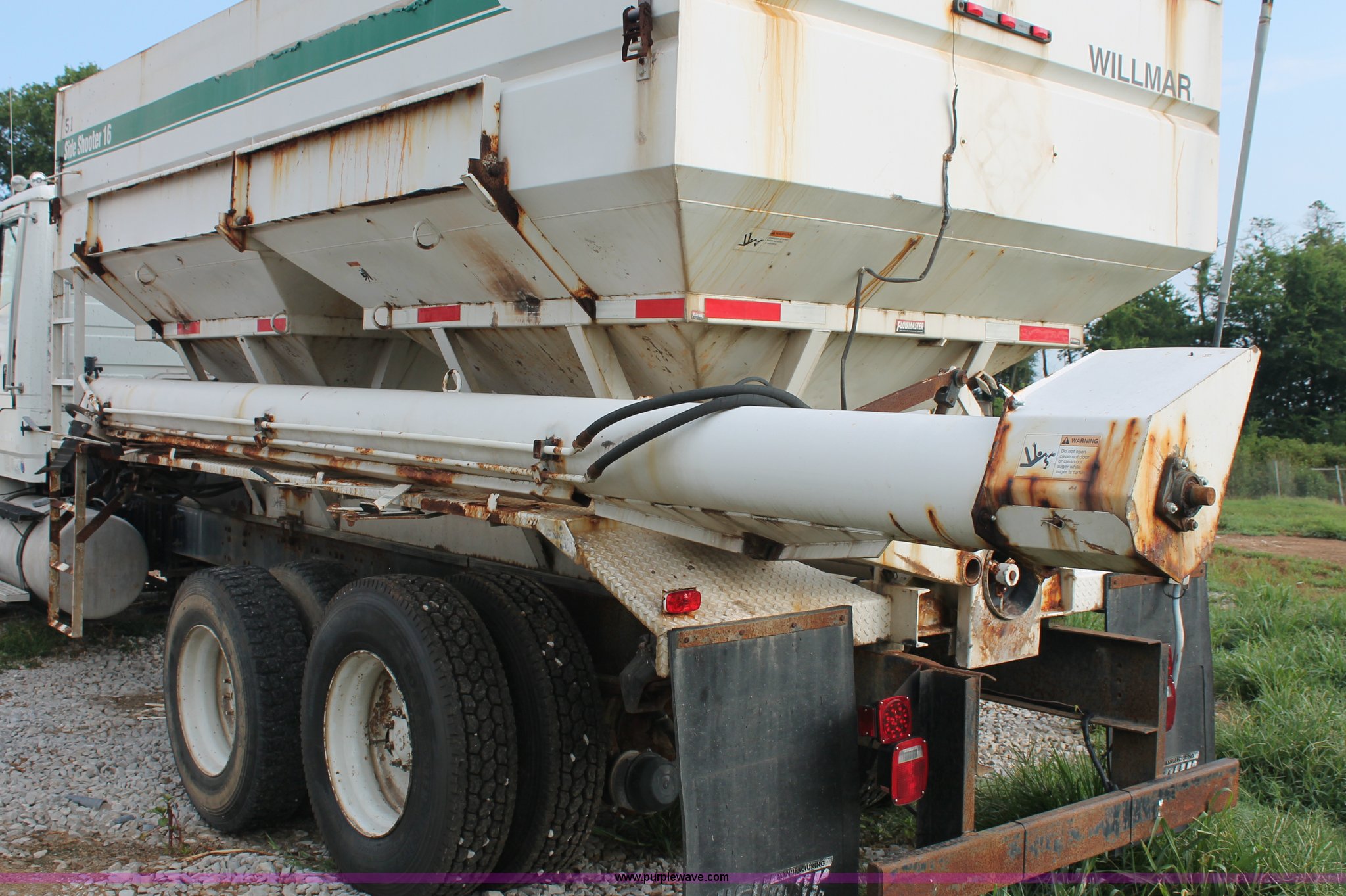 1994 Freightliner FLC112 fertilizer tender truck. 563,579 miles on odometer, Cummins 93R 14.0L L6 diesel engine 330 HP, Serial 11711043, Eaton Road Ranger manual transmission, Twin screw, Differential lock, AC and heat, Kenmore CB radio, Willmar Side Shooter 16 tender bed Dual hopper bottom, Access ladder, Hydraulic toggle four stick operation, 10" diameter auger, SRT-2 rollover tarp, Serial 11711043, Bumper, Block heater, Dual 100 gallon tanks, Single rear exhaust stack, Sliding fifth wheel, PTO, Wet kit, Spring suspension, Jake brake, 11R22.5 tires, GVWR 48,000 lbs, FAWR 12,000 lbs, IAWR 18,000 lbs, RAWR 18,000 lbs, Unit# 22027. Title distribution may be delayed up to 30 days from verification of funds. 1FUYZCYB2RL590822. Shipping quotes available. Crop Production Services. 485 Payton St. Russellville, KY 42276