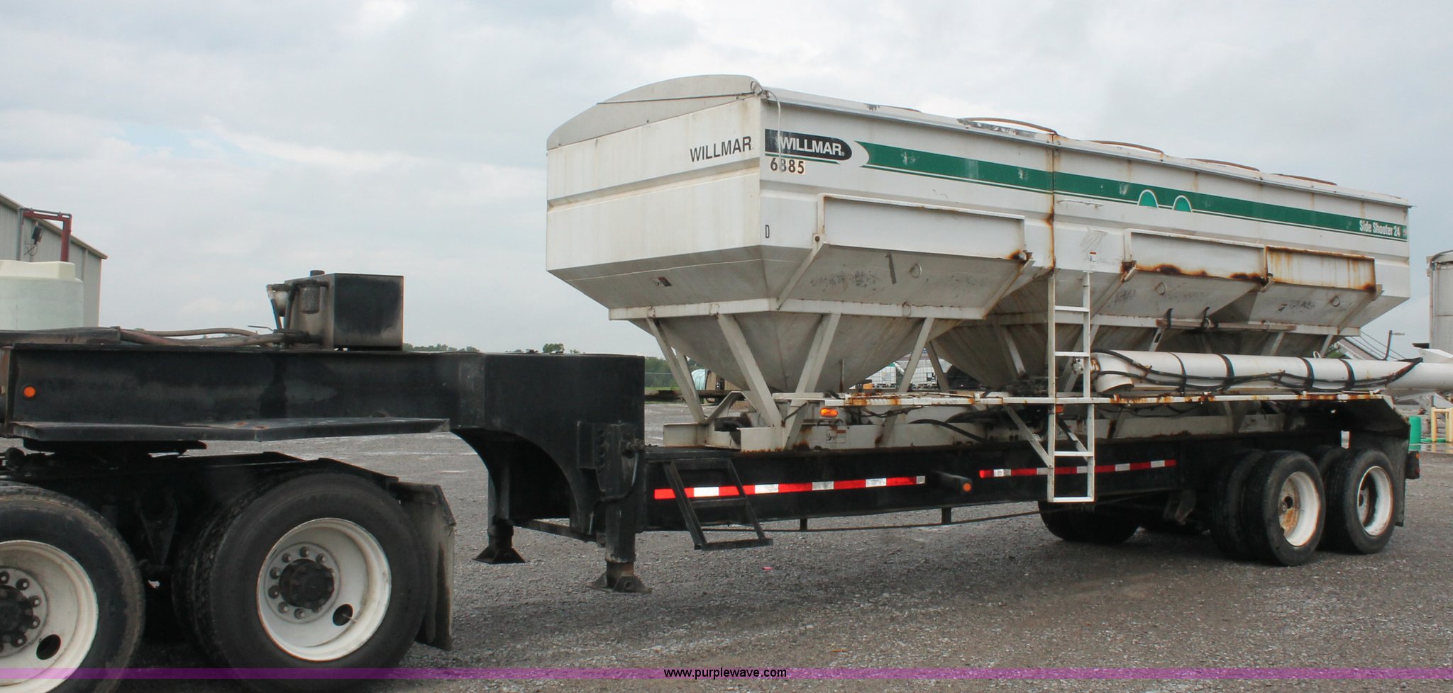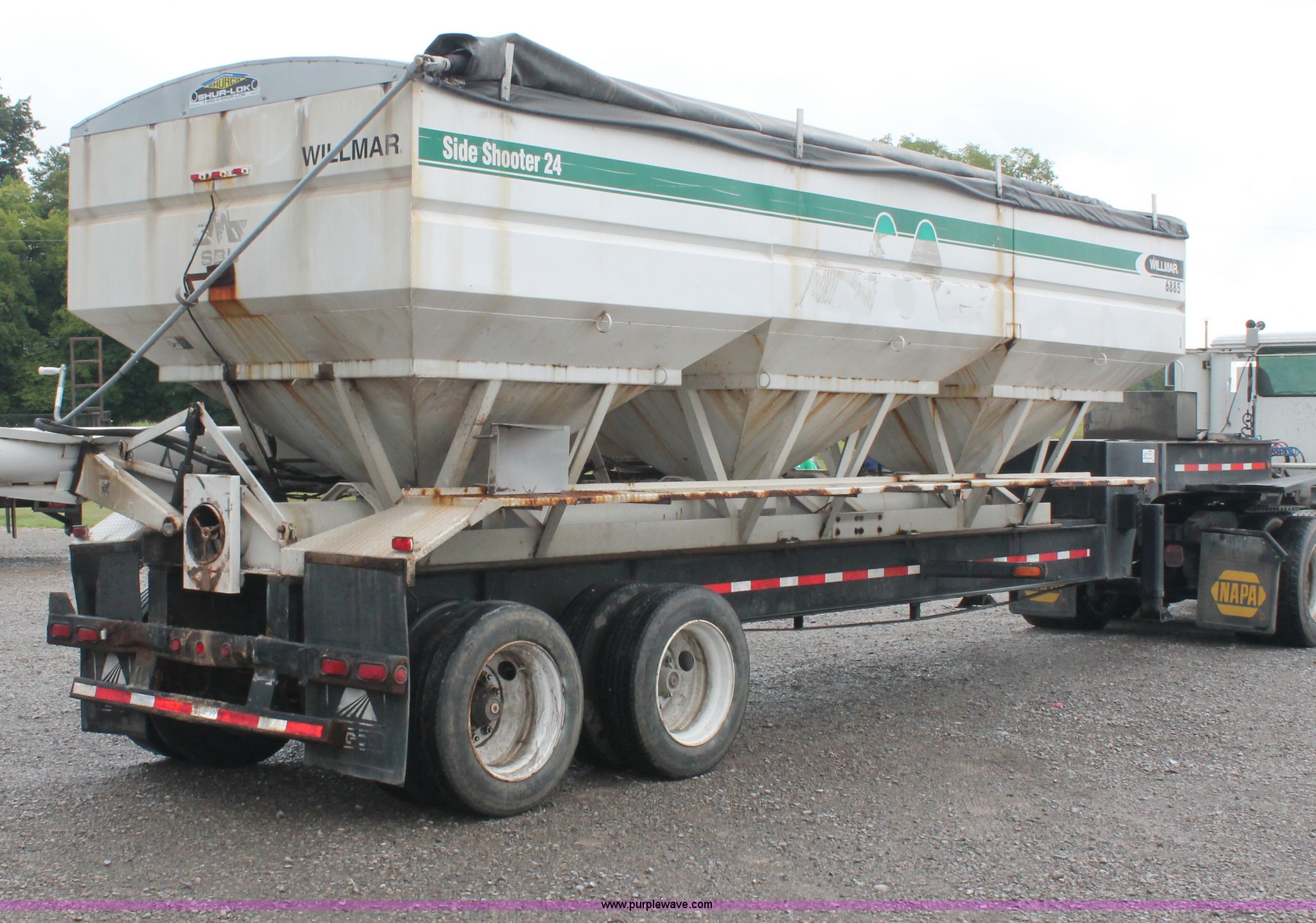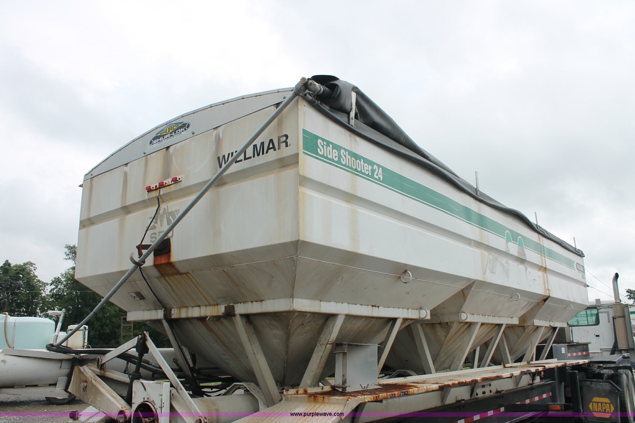 Purple Wave is selling a used Fertilizer or Feed Delivery Trailer in Kentucky. This item is a 2004 Willmar Side Shooter 24 fertilizer tender trailer with the following: 25'L trailer, 11'L gooseneck, (3) hopper bottoms, 10" diameter auger, Wet kit, Hydraulic toggle four stick operation, Shur-Lok rollover tarp, Access ladder, 225/70R22.5 dual tires, Unit# 22044